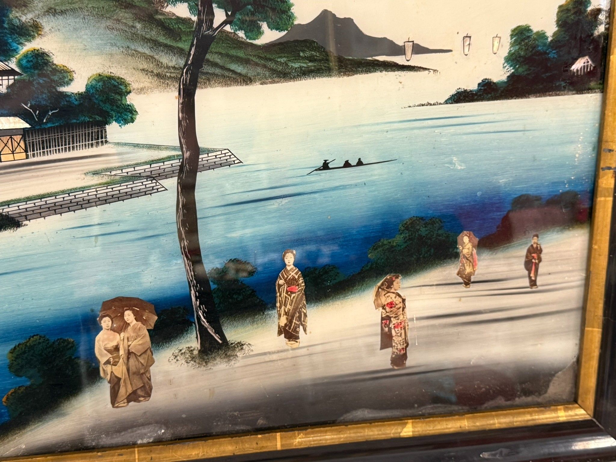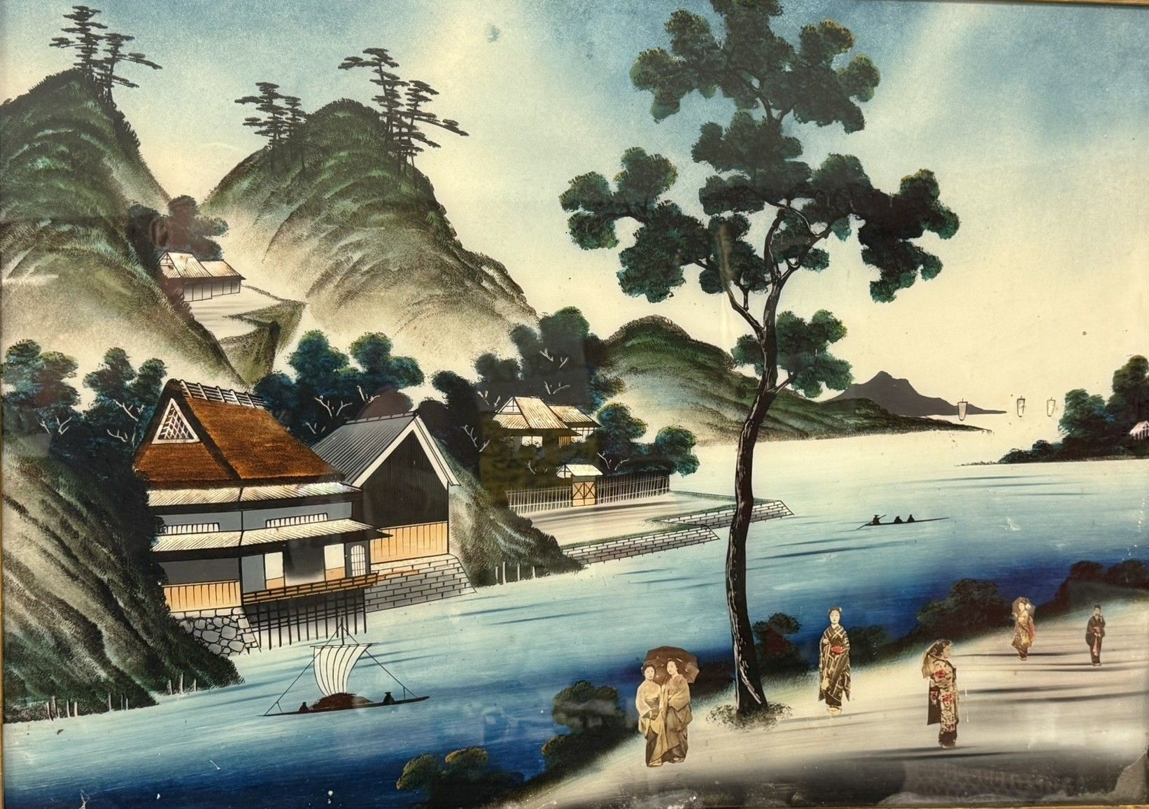 20th CENTURY ECOLE, FIXED UNDER GLASS REPRESENTING A CHINESE LANDSCAPE WITH INCRUSTATIONS