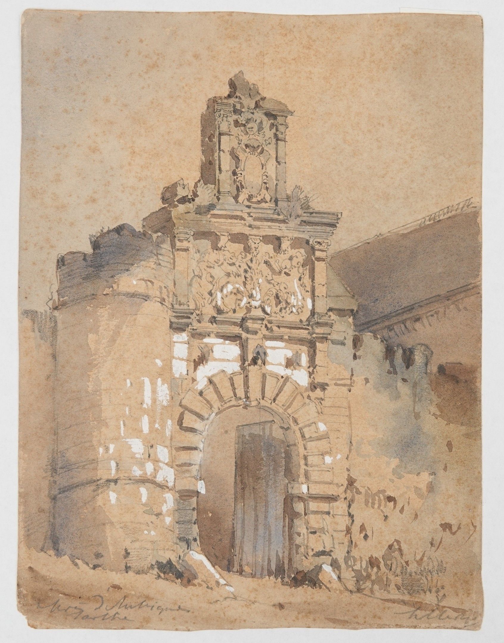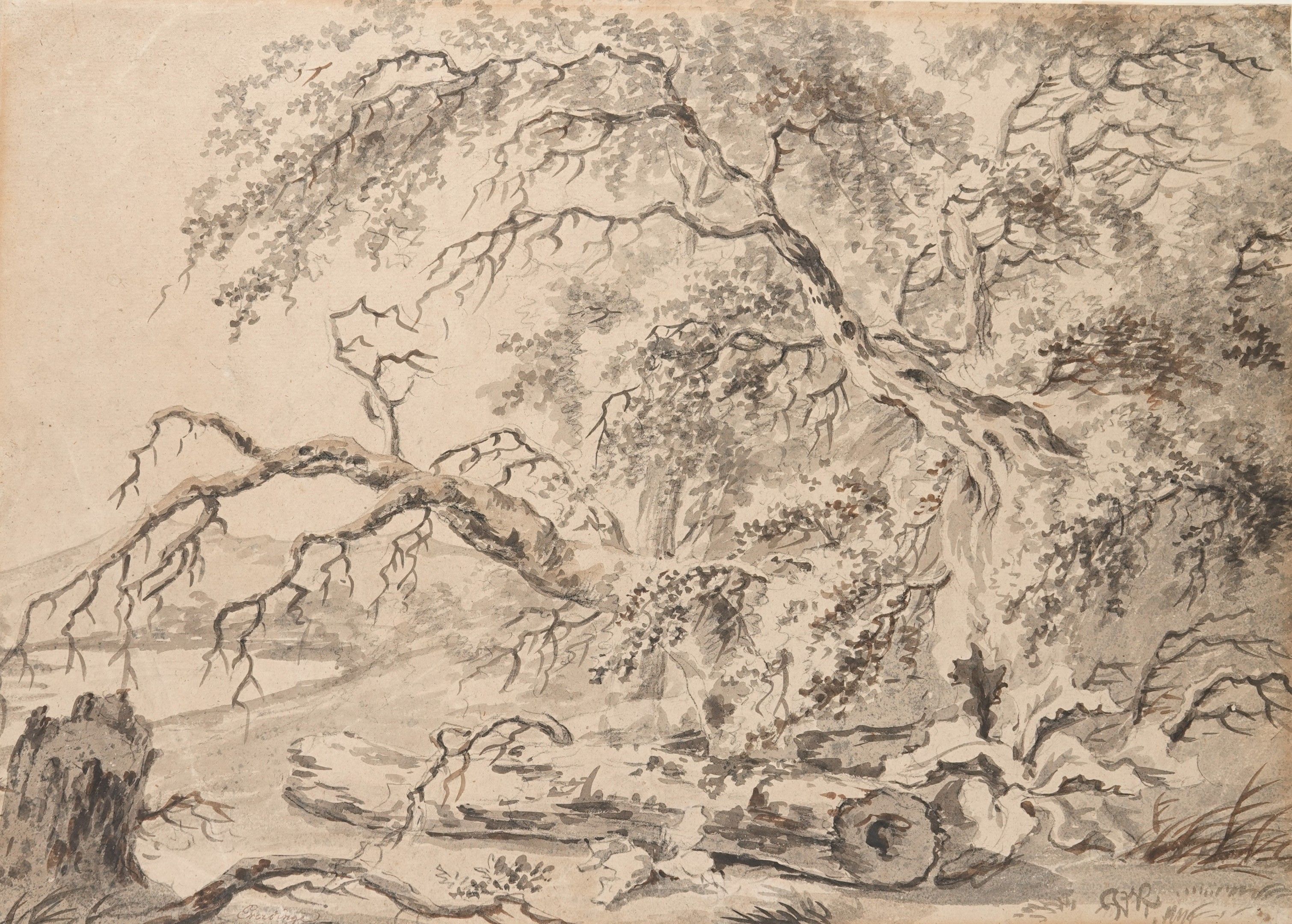 Brown wash, watercolour and white highlights on beige paper