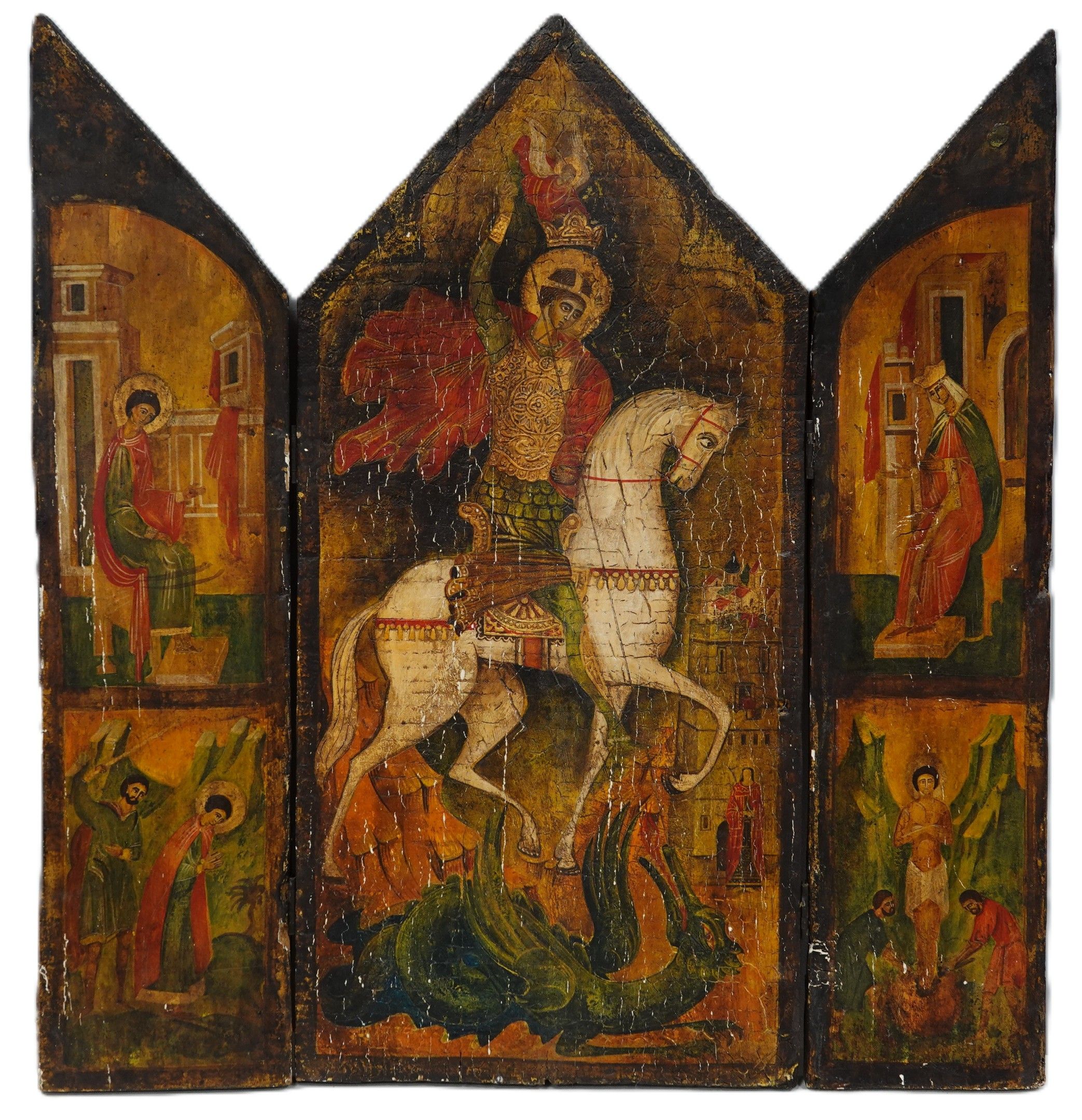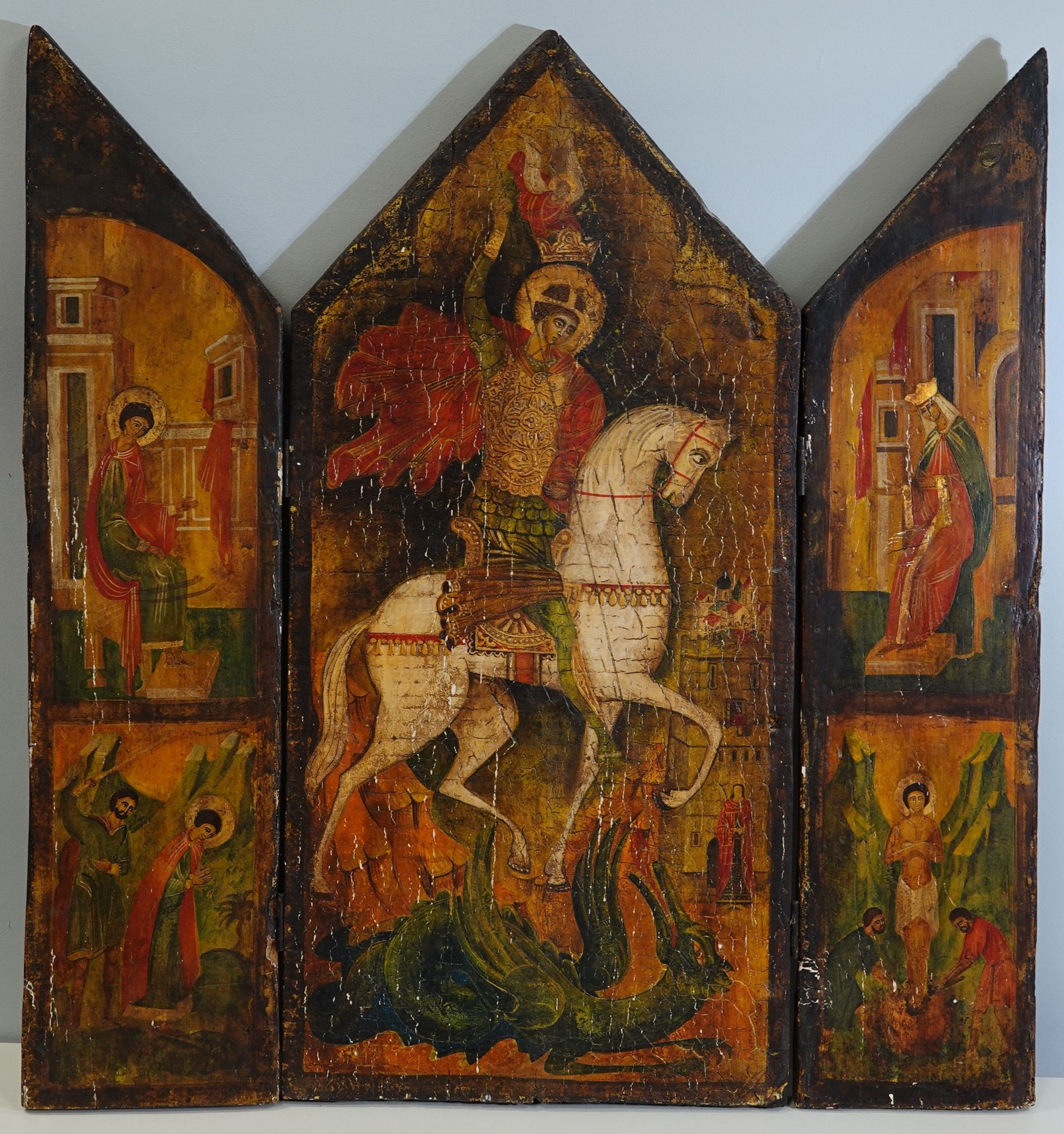 Triptych painted on wood depicting Saint George and the dragon on the central panel, and scenes from his life depicted on the two side panels.