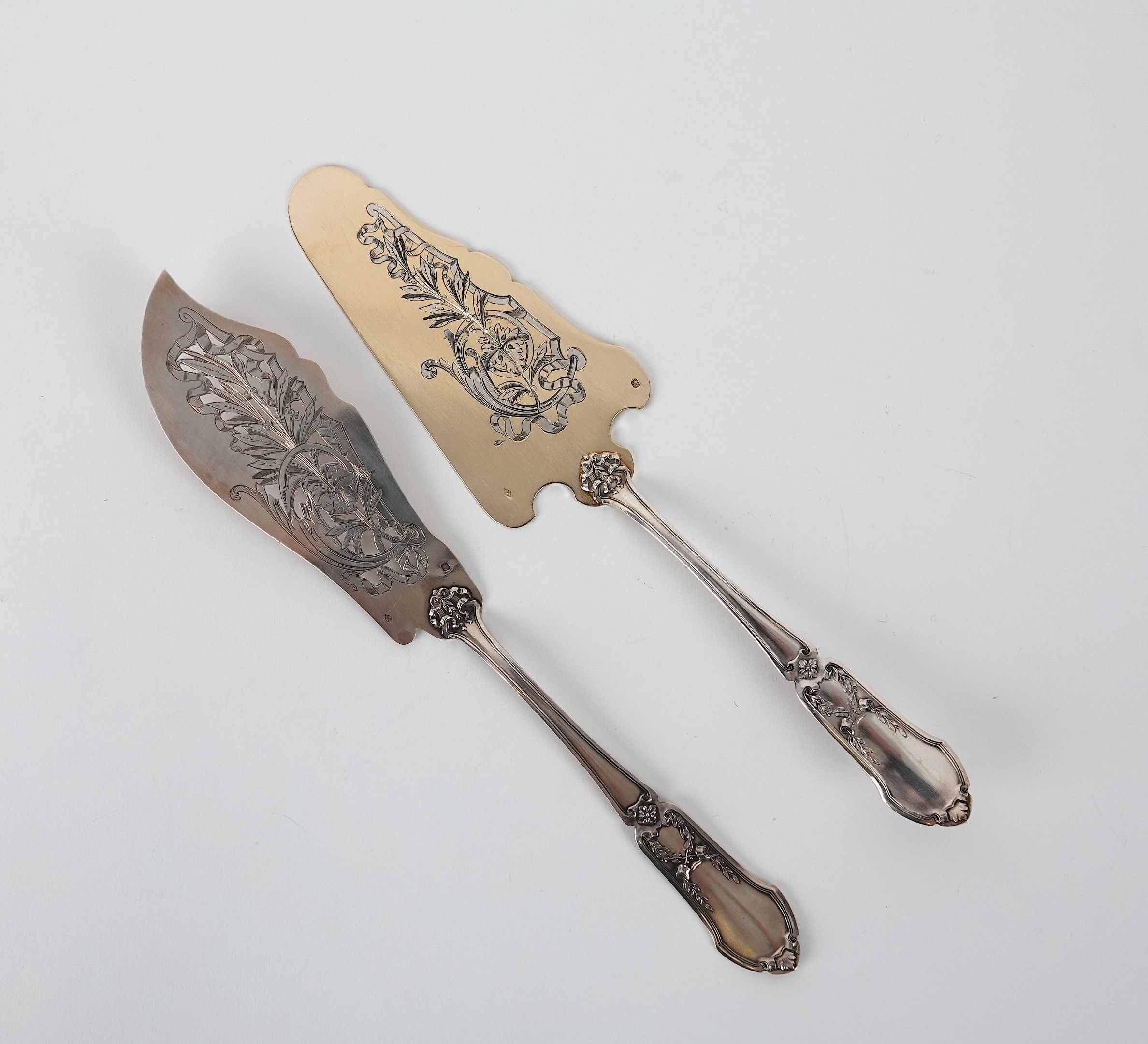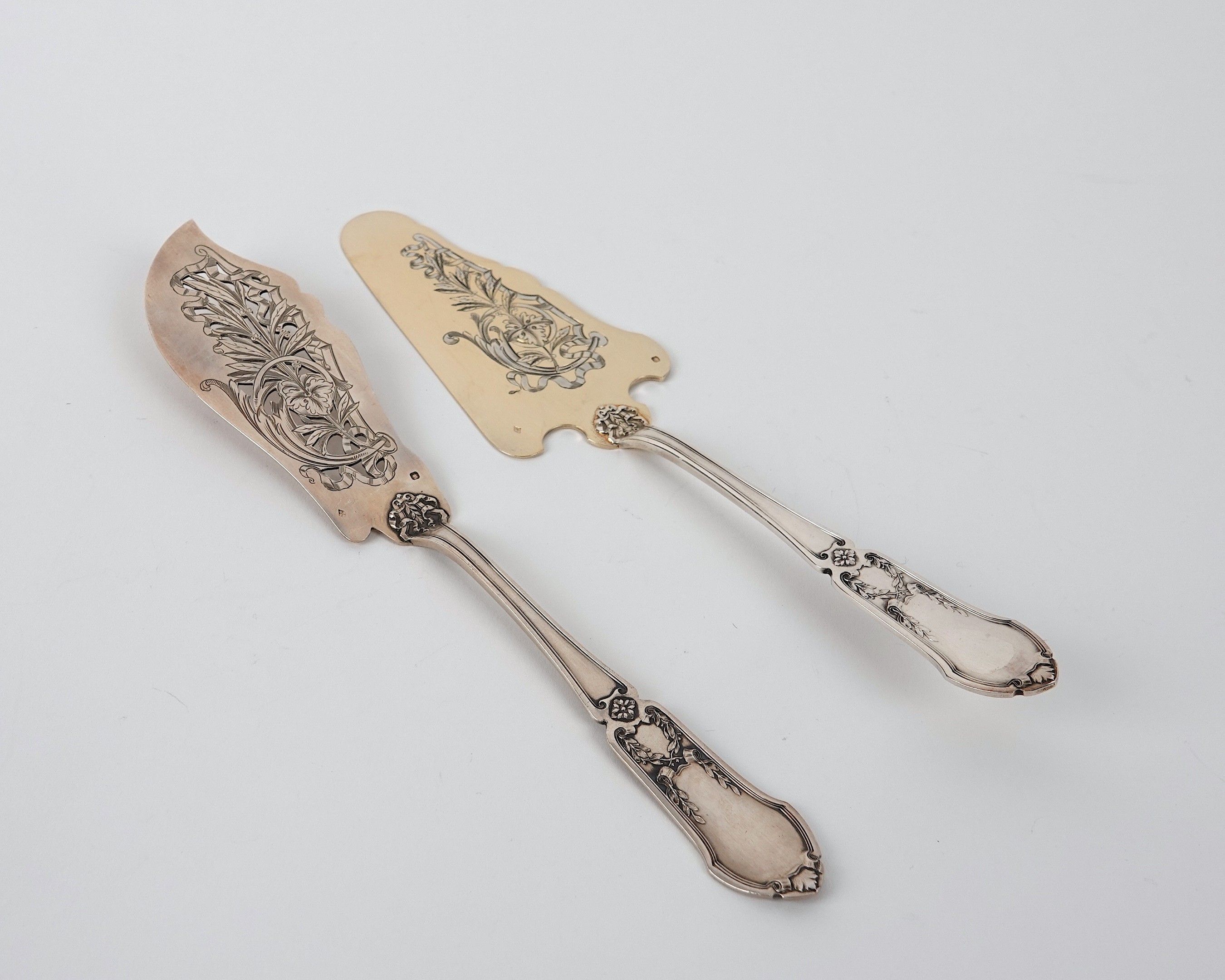 Two pieces of silver flatware: a pie server and a fish knife, decorated with scrolls and flowers. Minerve hallmark