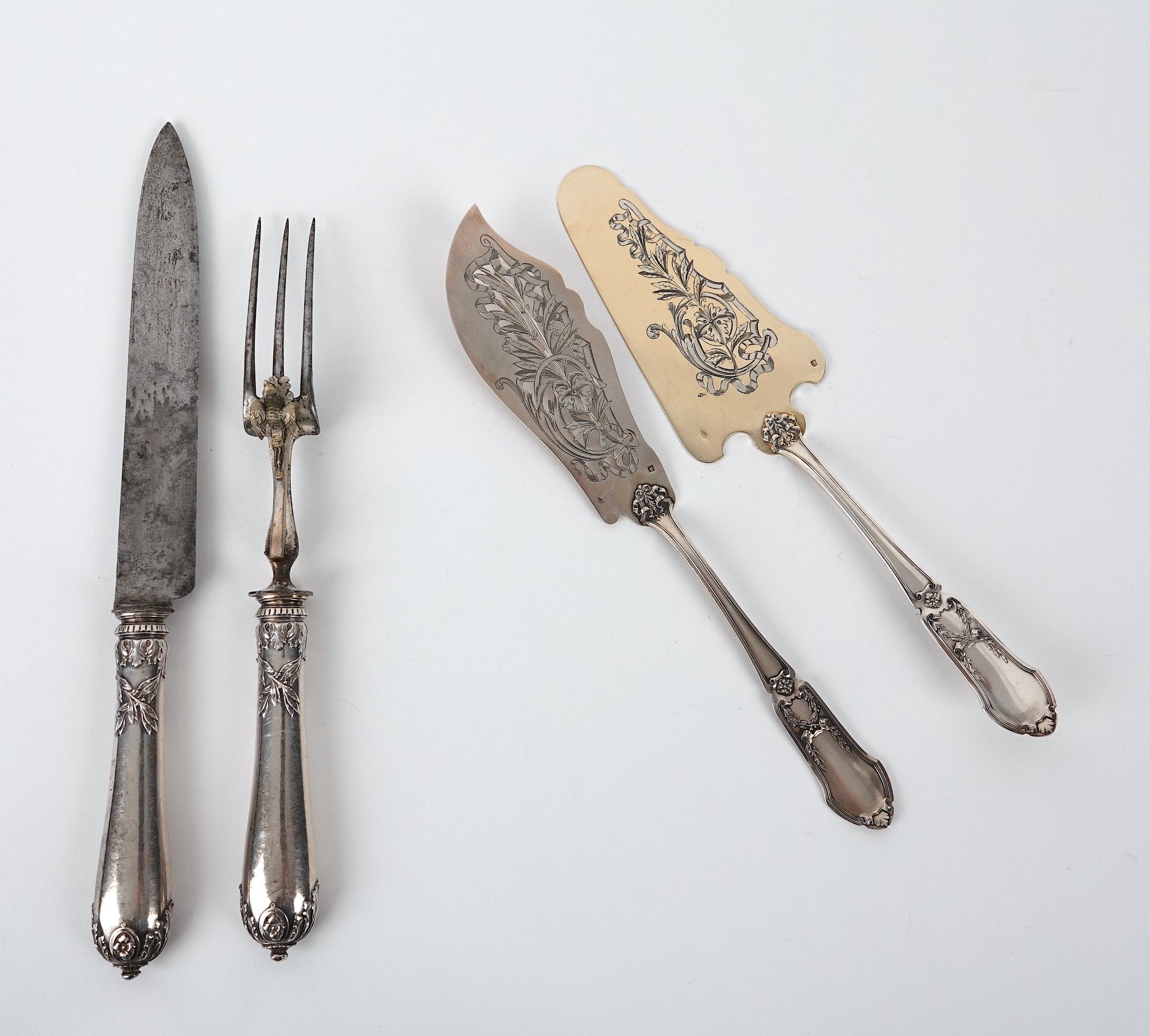A silver meat-cutting set decorated with garlands of foliage, the handles in filled silver. Marked Minerve