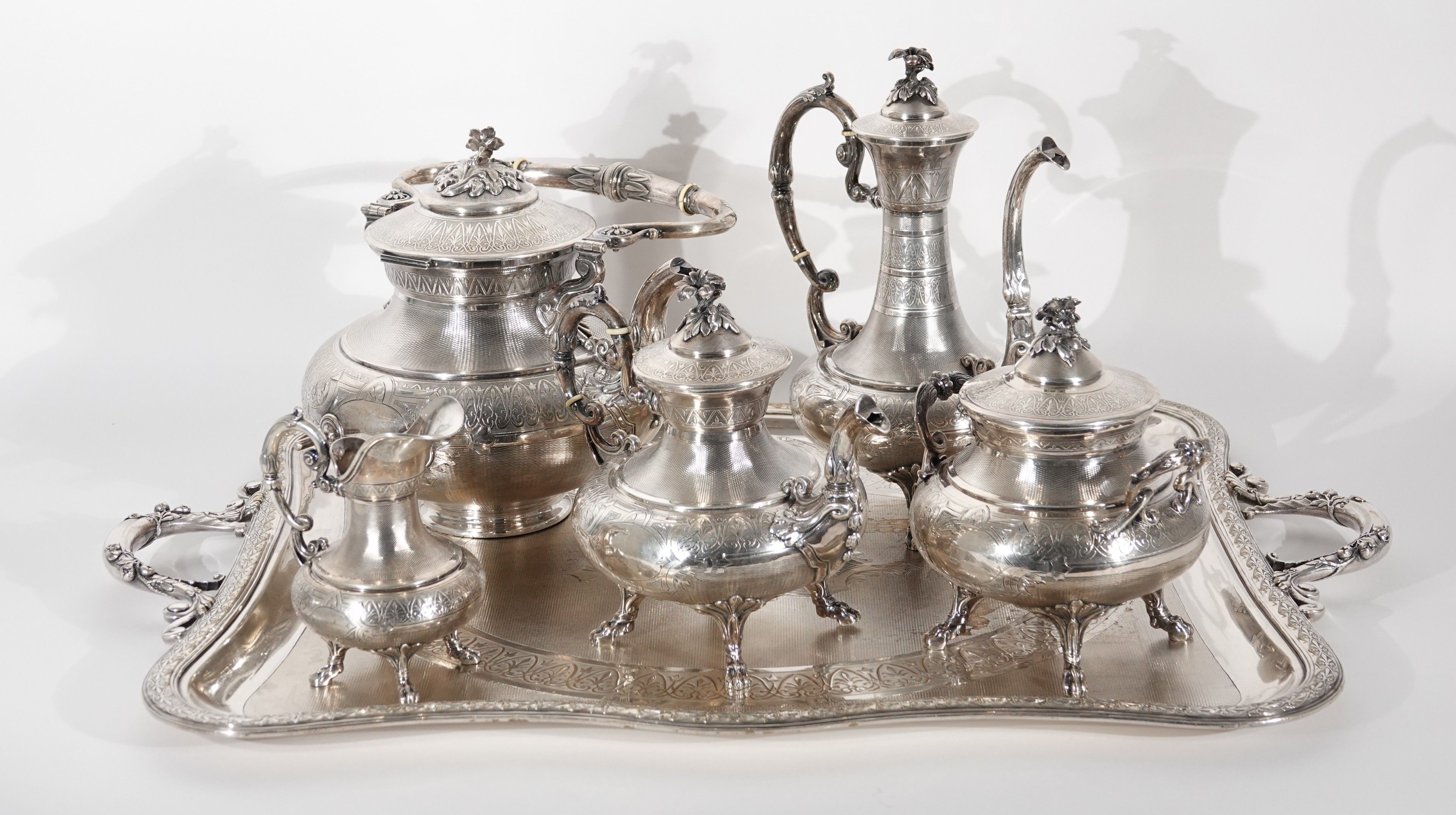 FRANCE, 19th century Silver tea and coffee set comprising: two teapots, a coffee pot, a milk jug and a sugar bowl with guilloché decoration and foliate garland friezes. Mercury head hallmark (export hallmark used from 1840 to 1879). Total weight of silver pieces: 3535 g (approx.) A silver-plated tray is included.