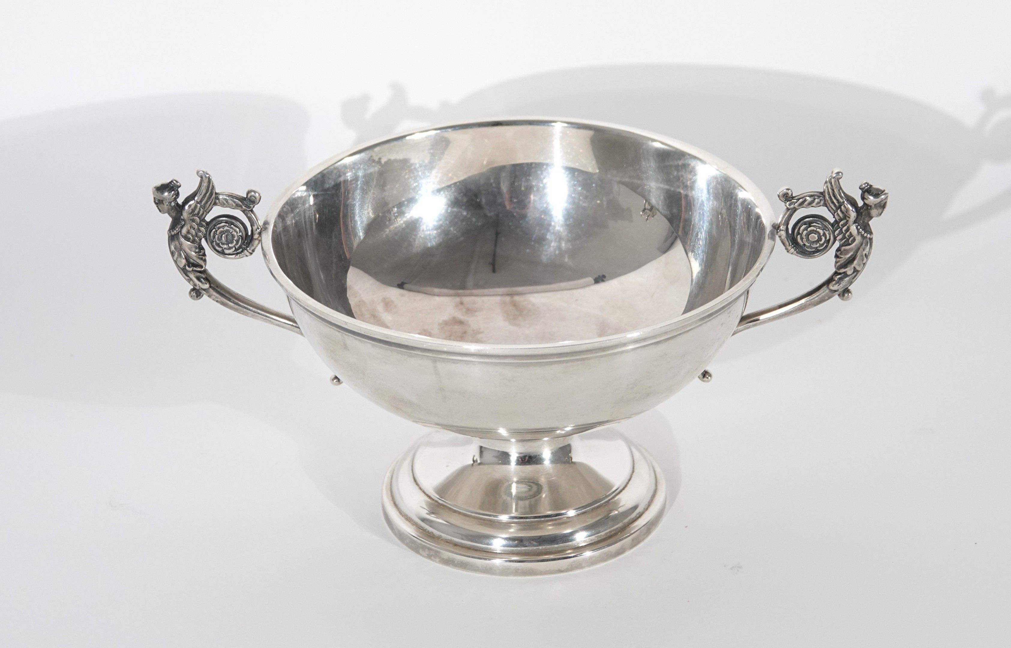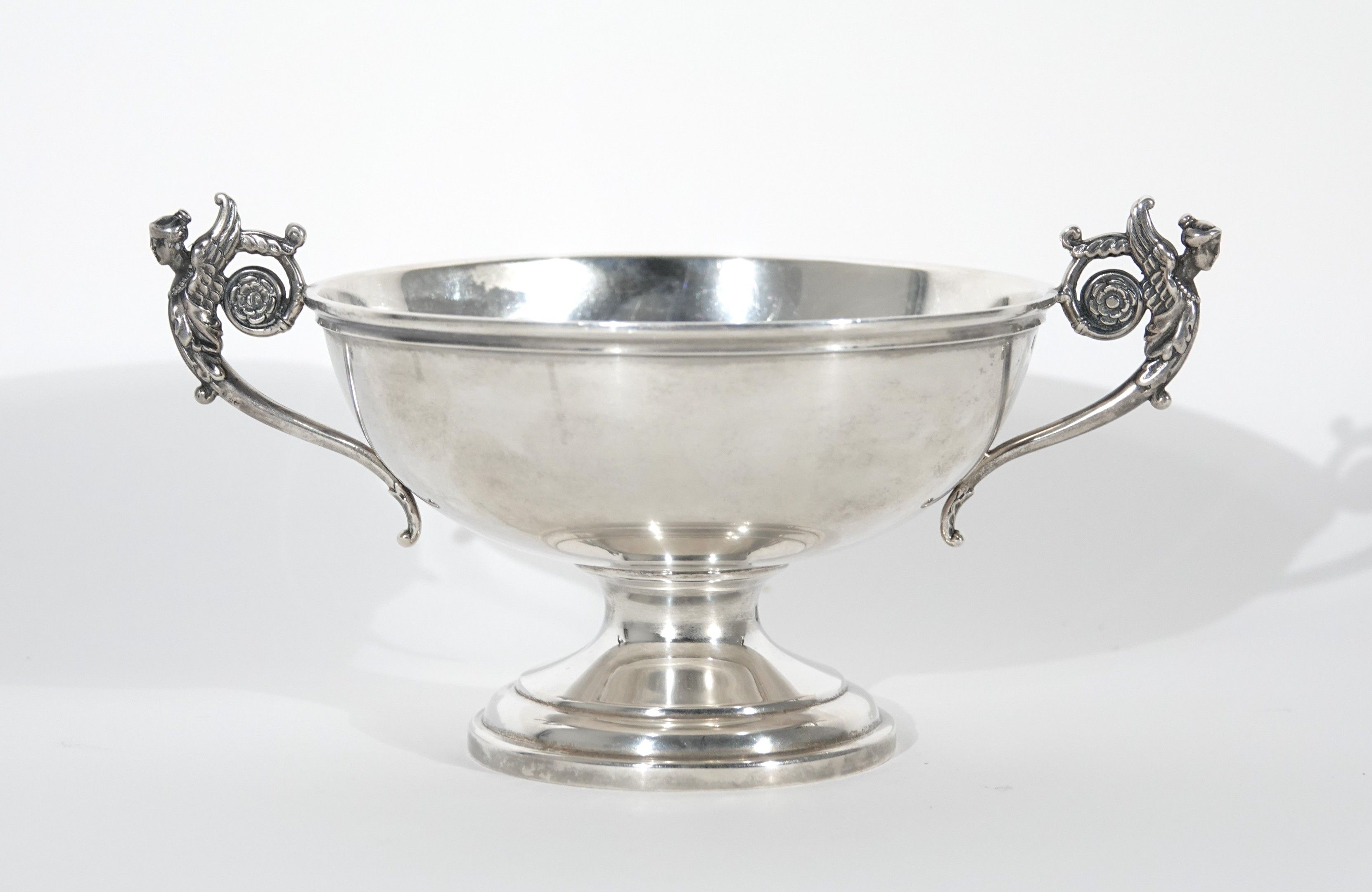 A silver bowl on a pedestal base with handles in the shape of winged sphinxes. Weight: 244.8 g