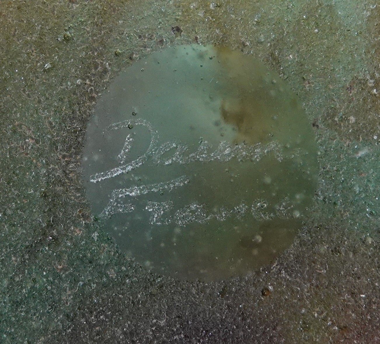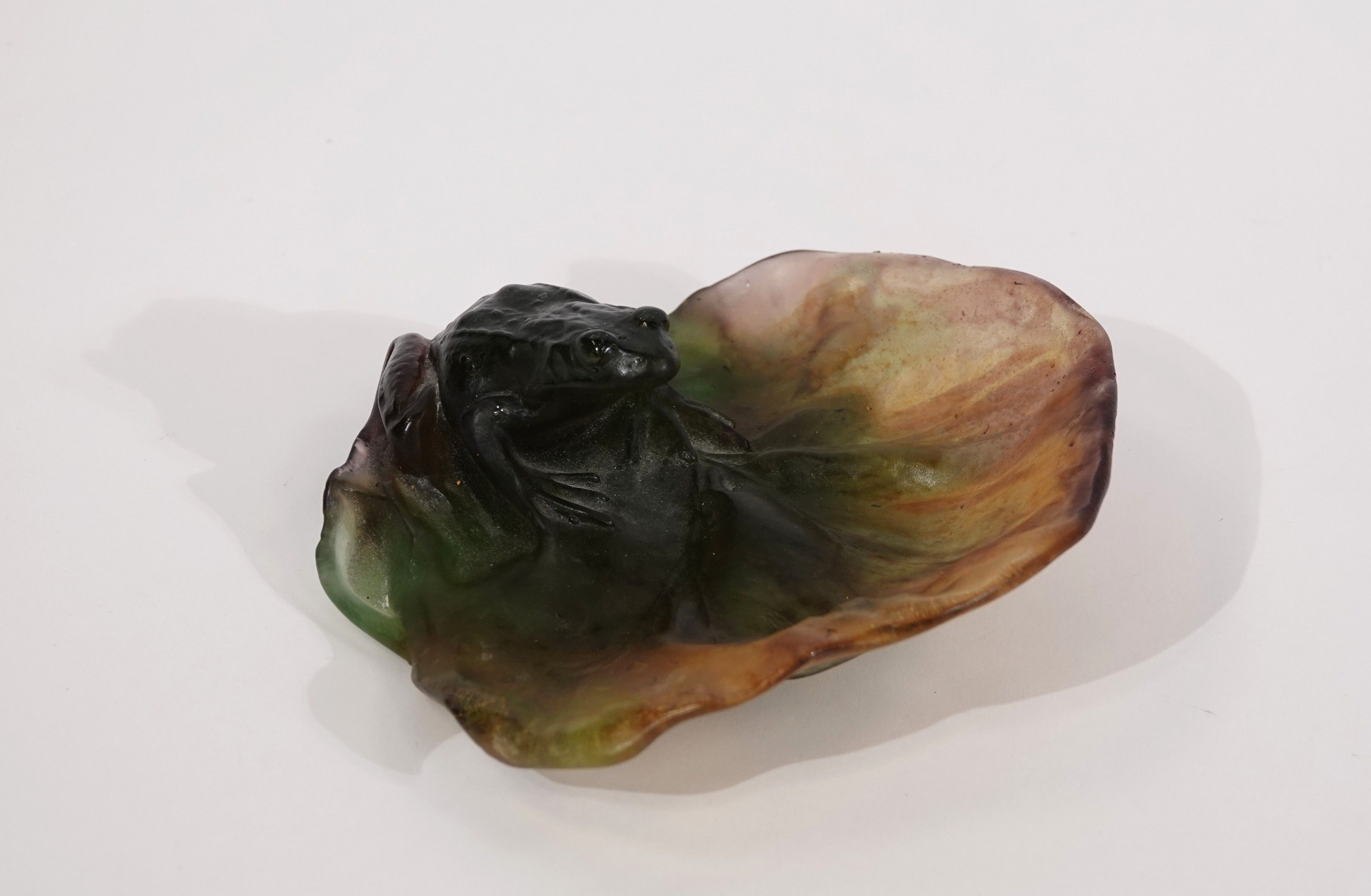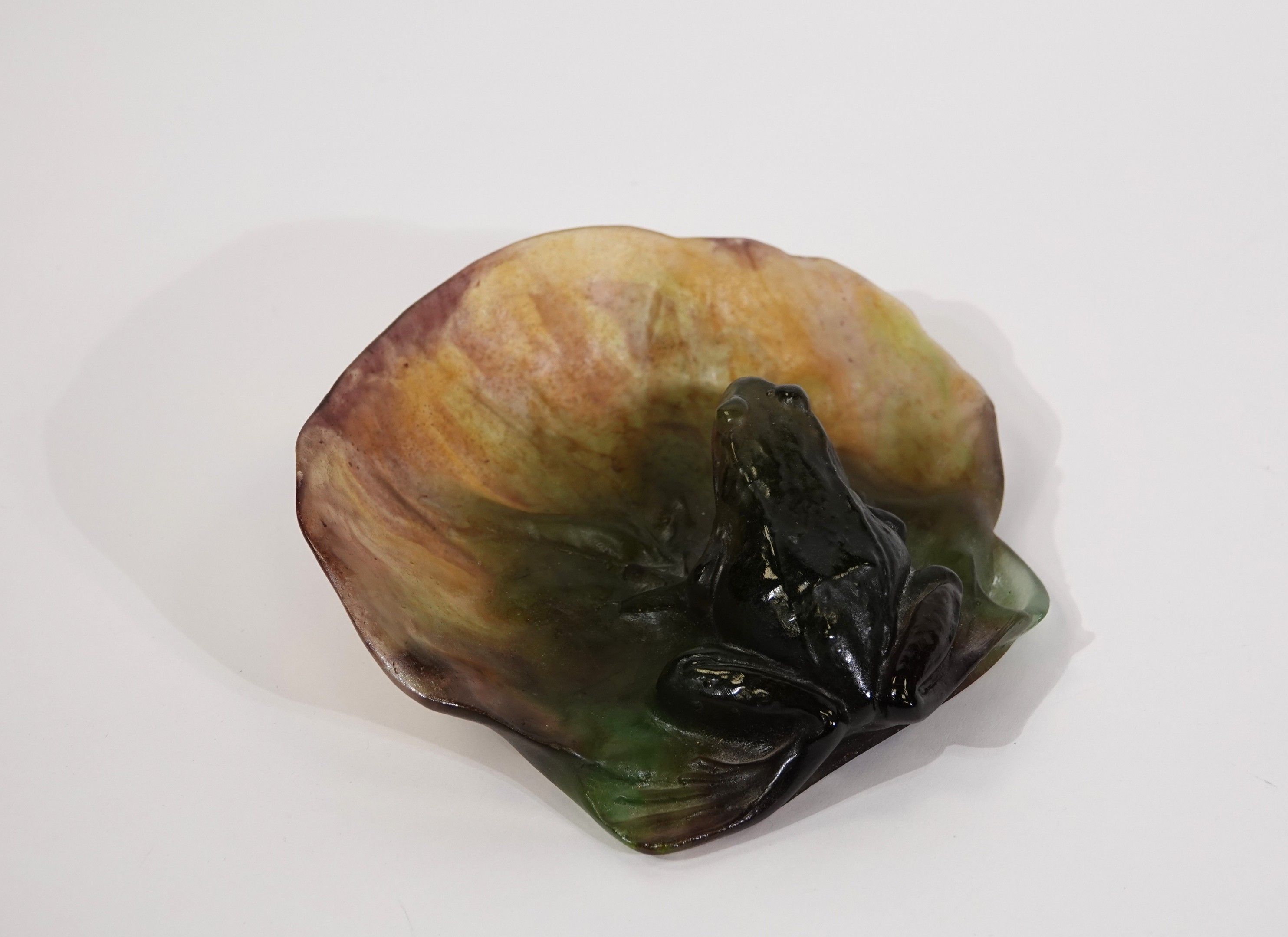 Polychrome purple and green glass bowl representing a frog on a water lily leaf.