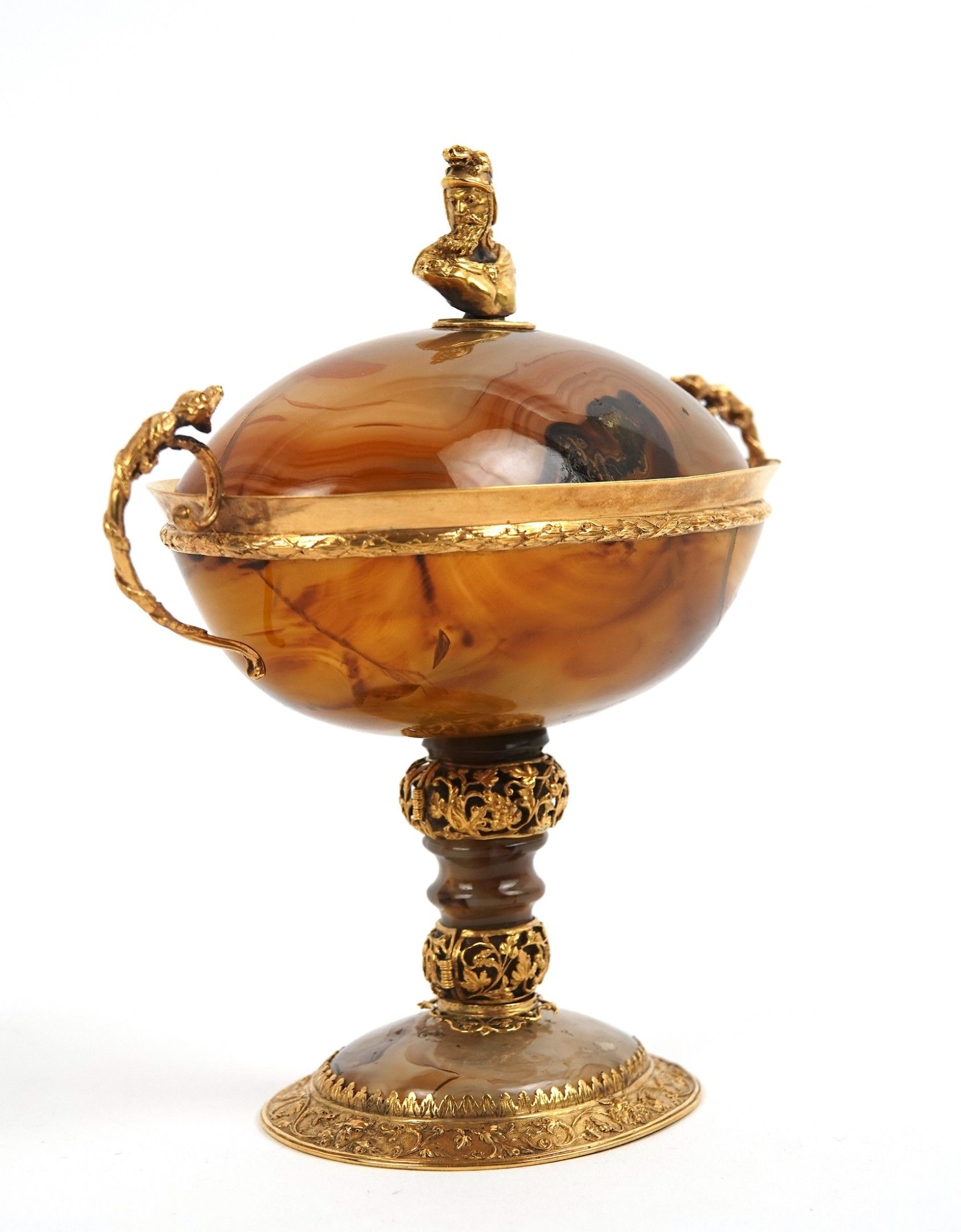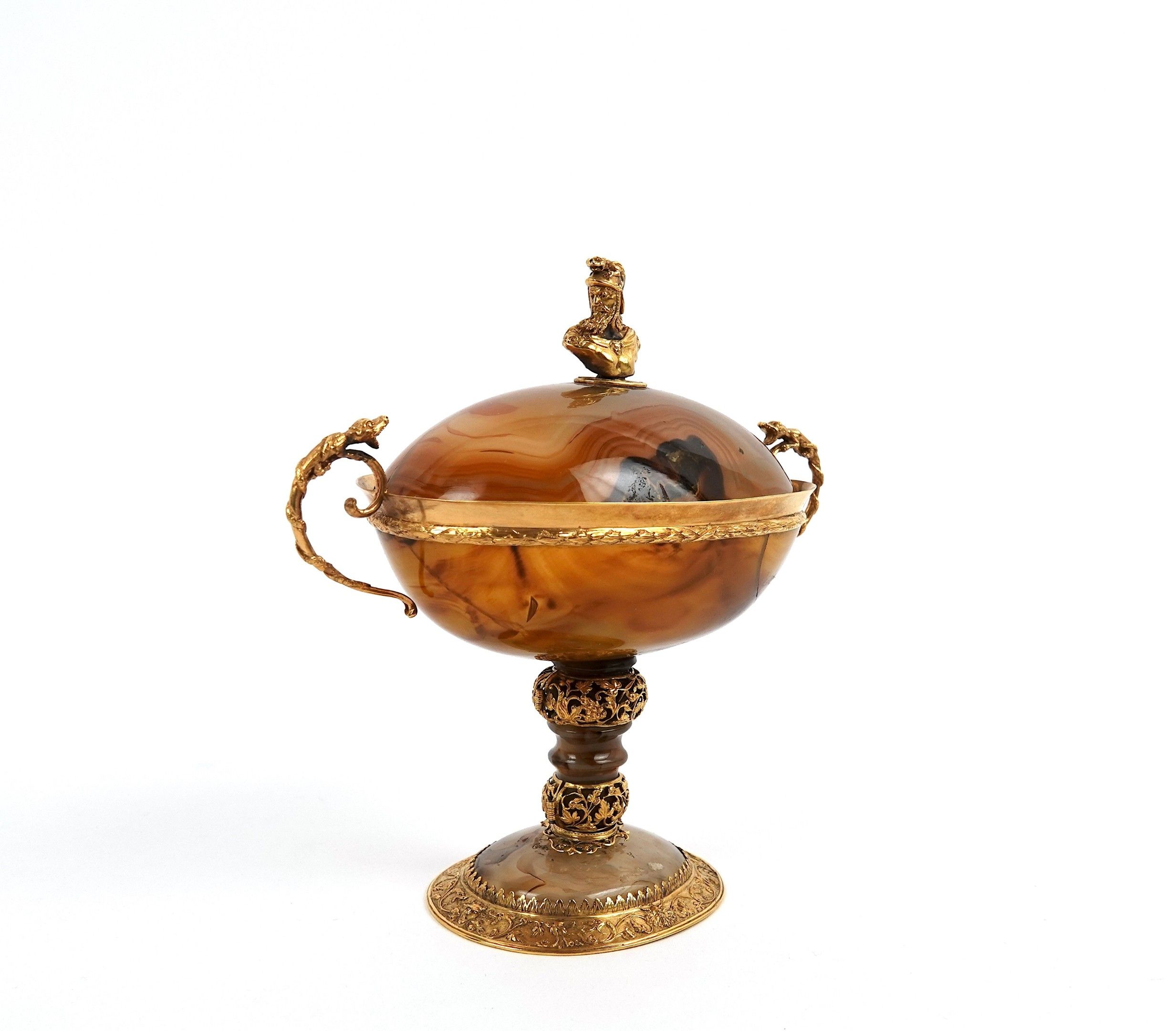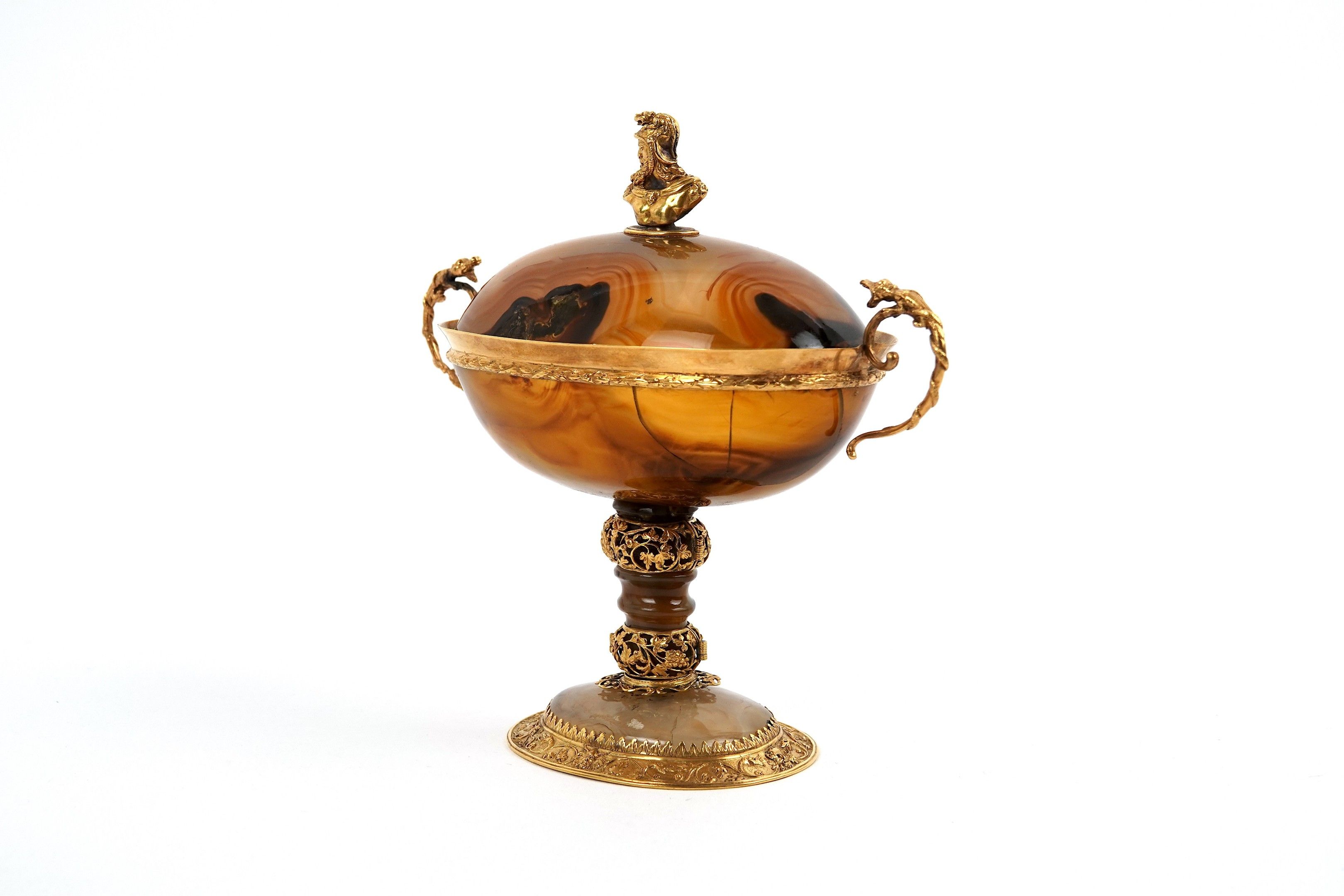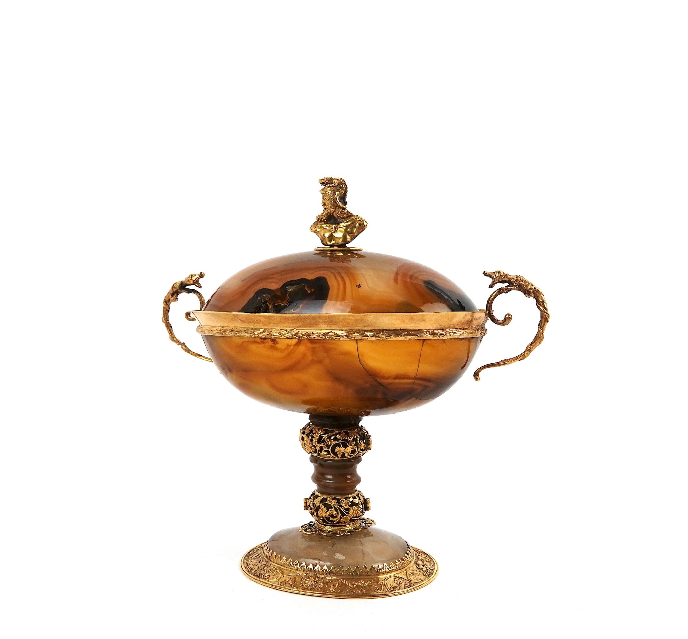 A covered agate bowl set in 750-thousandths gold, decorated with foliate scrolls and acanthus leaves, the scrolled handles surmounted by a reptile, the lid surmounted by a helmeted figure in profile.
