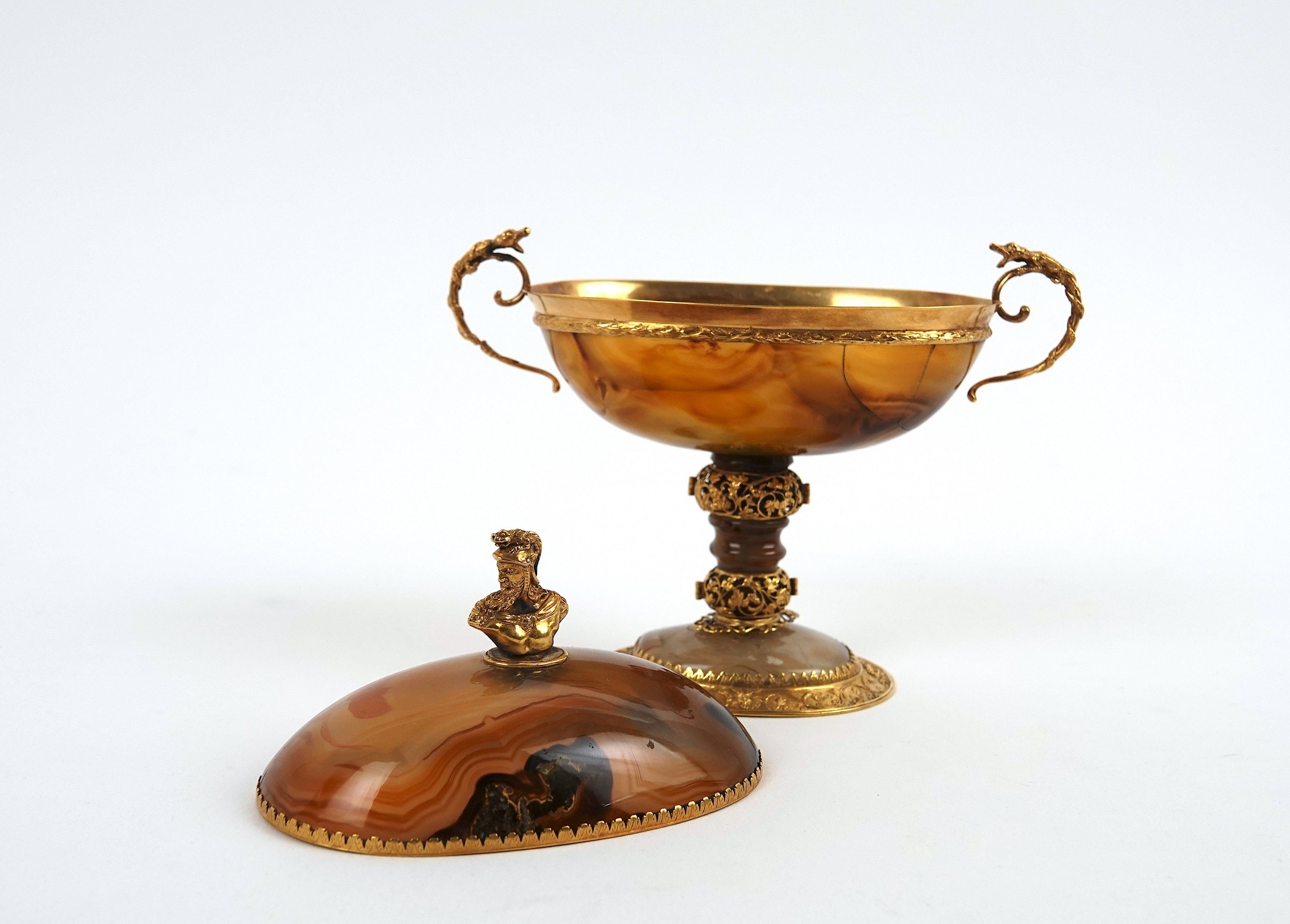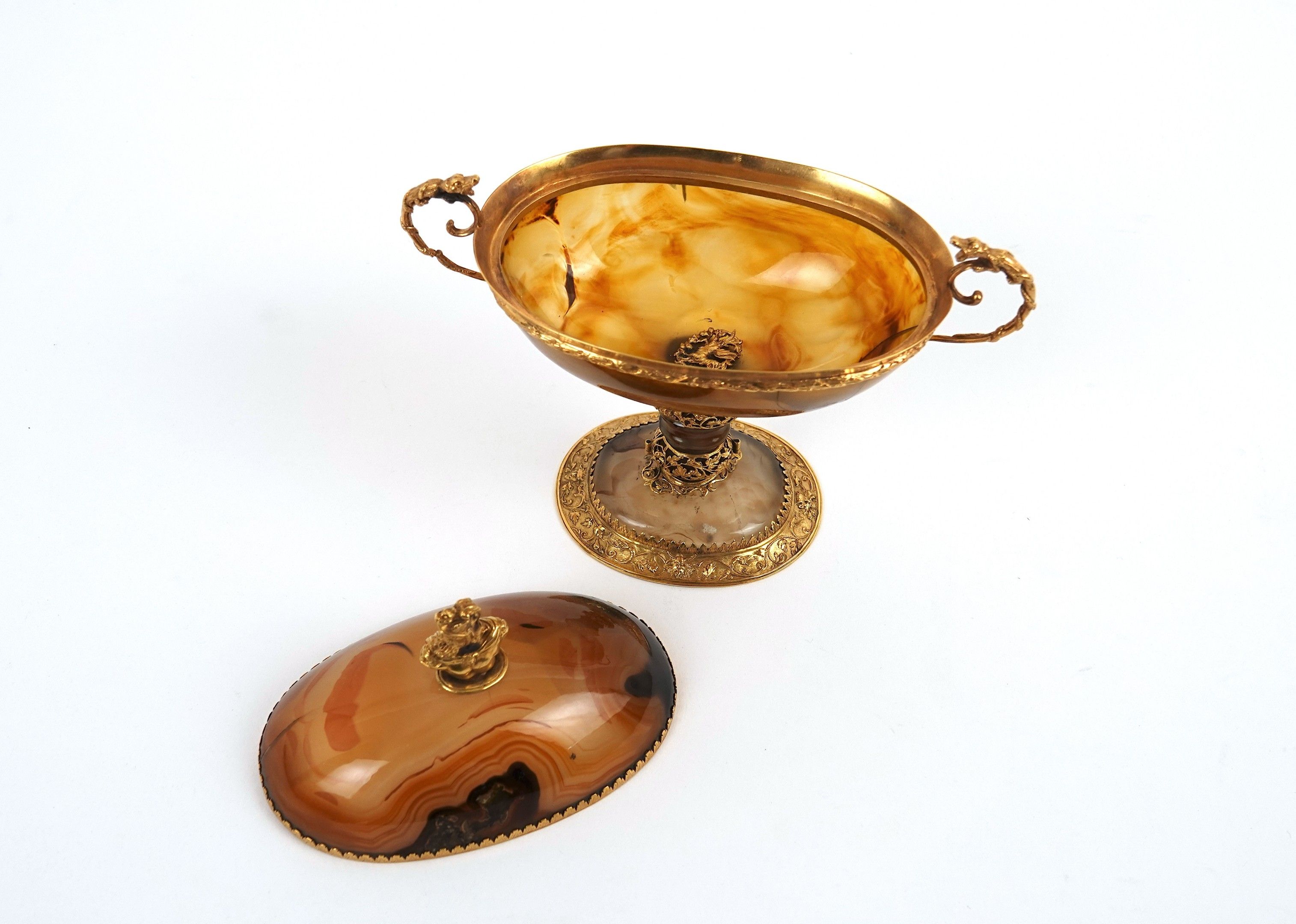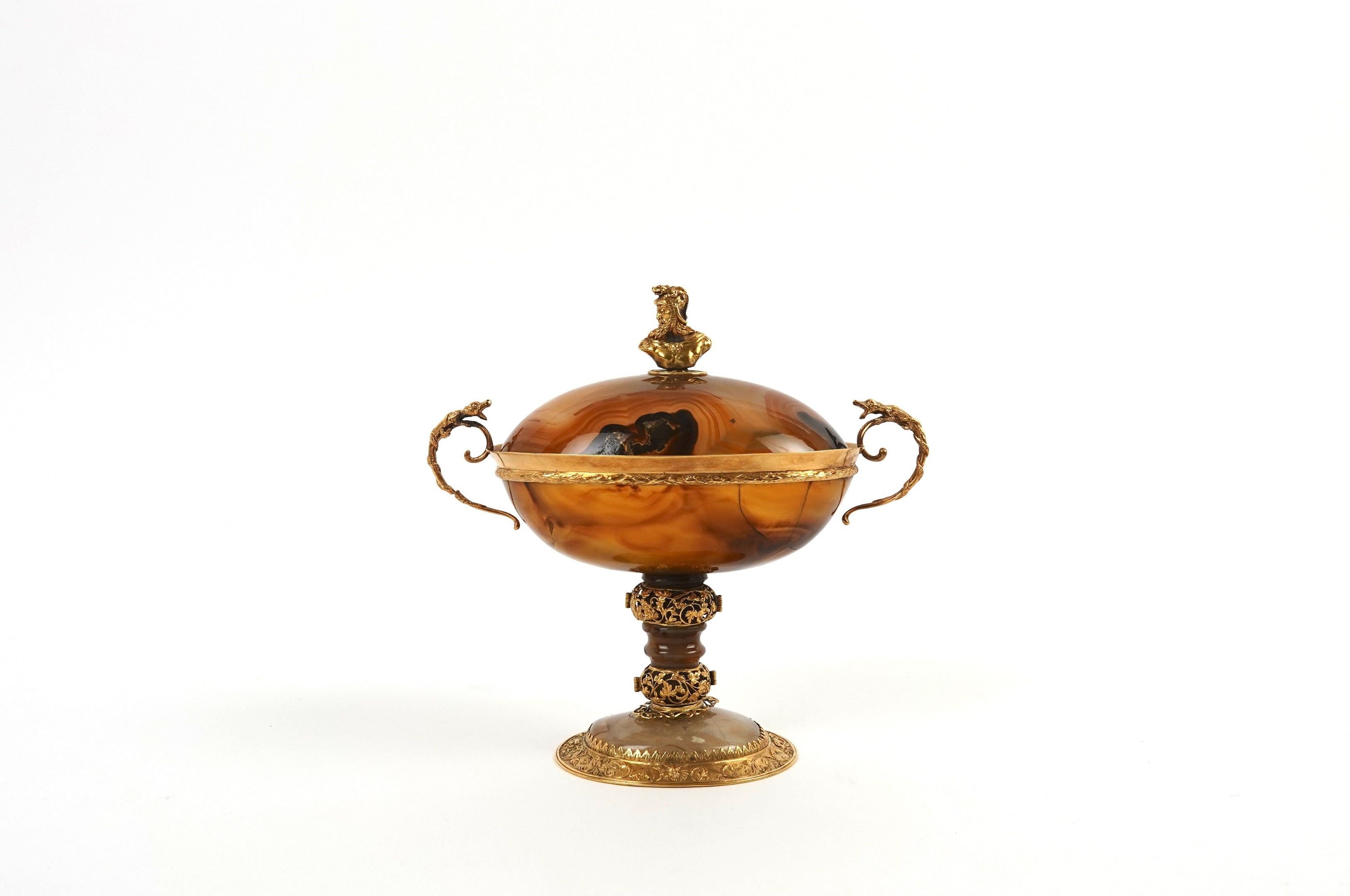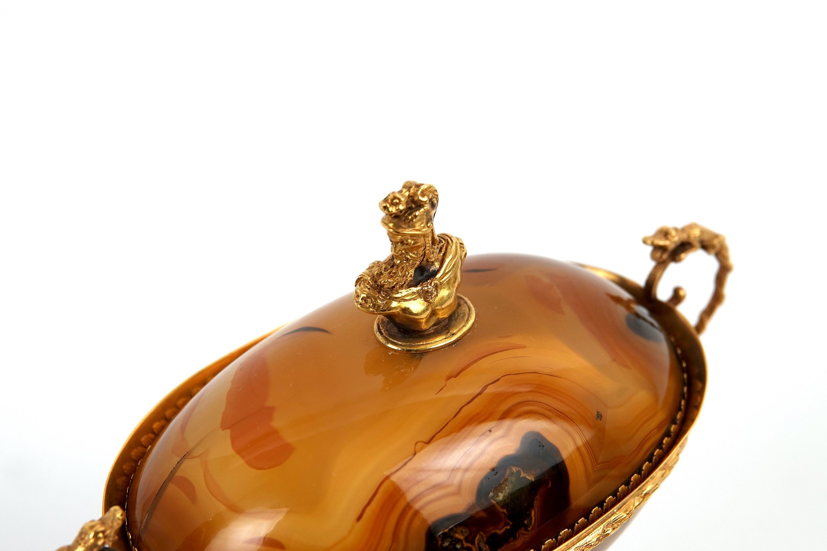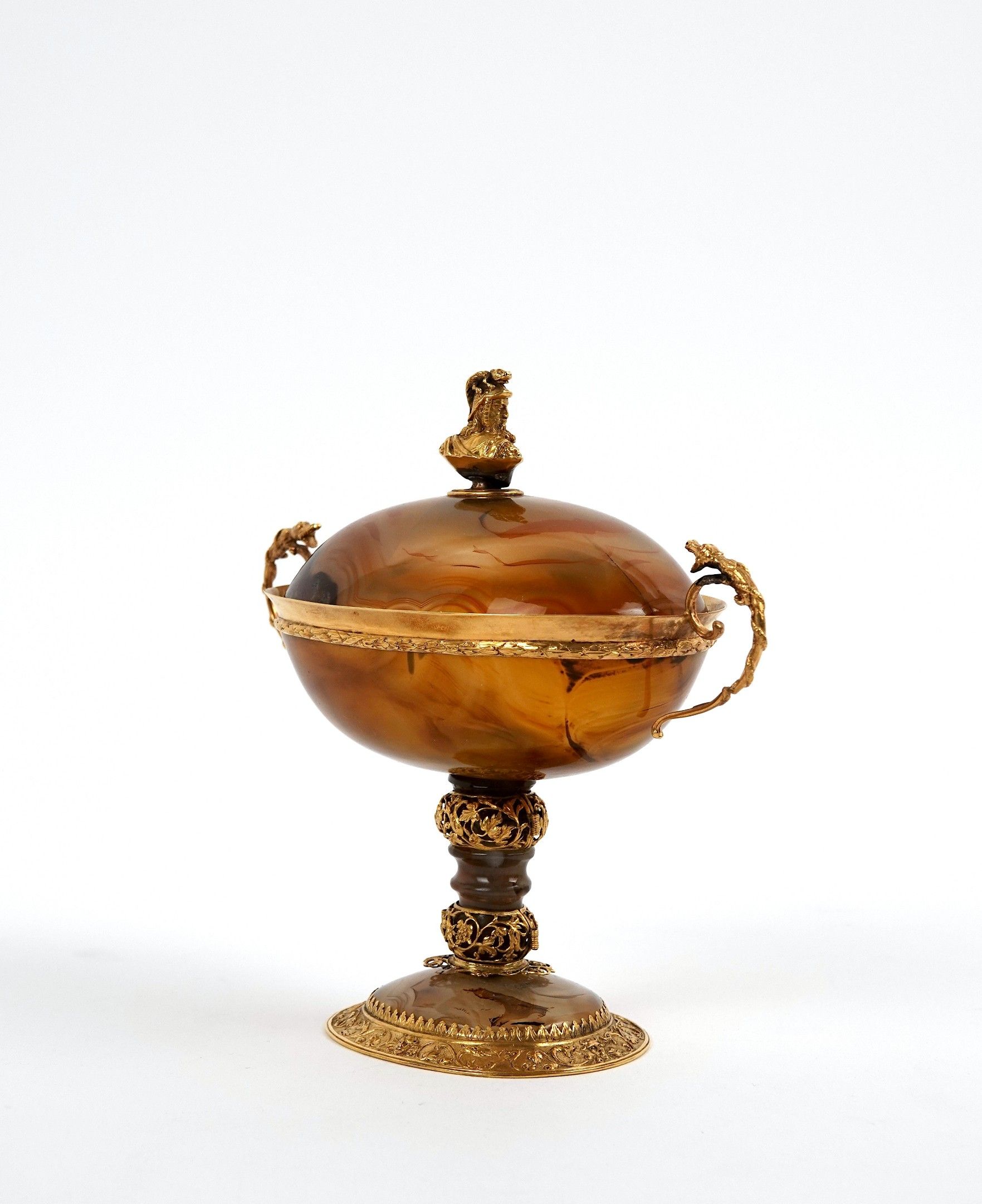 A covered agate bowl set in 750-thousandths gold, decorated with foliate scrolls and acanthus leaves, the scrolled handles surmounted by a reptile, the lid surmounted by a helmeted figure in profile.
