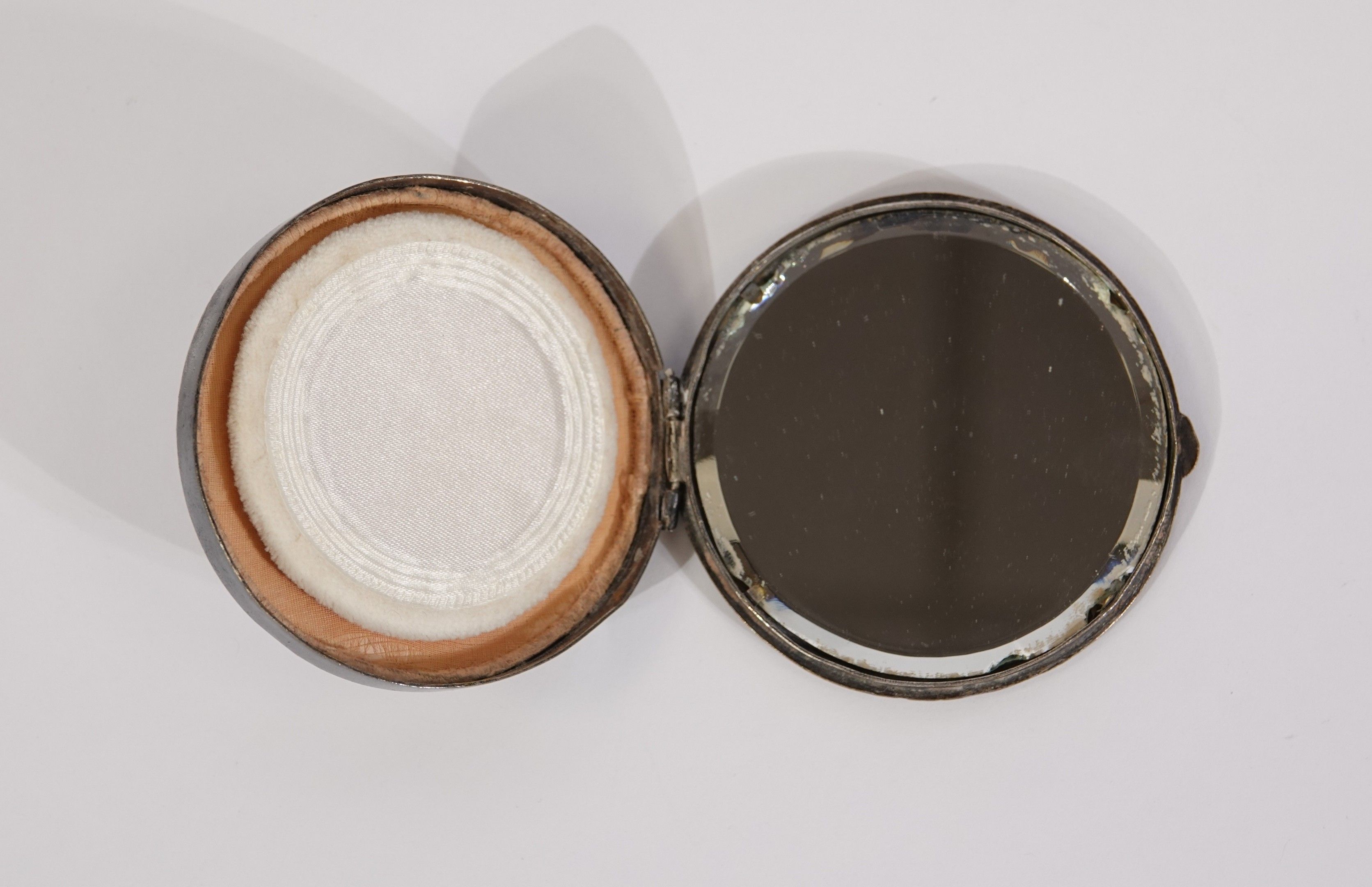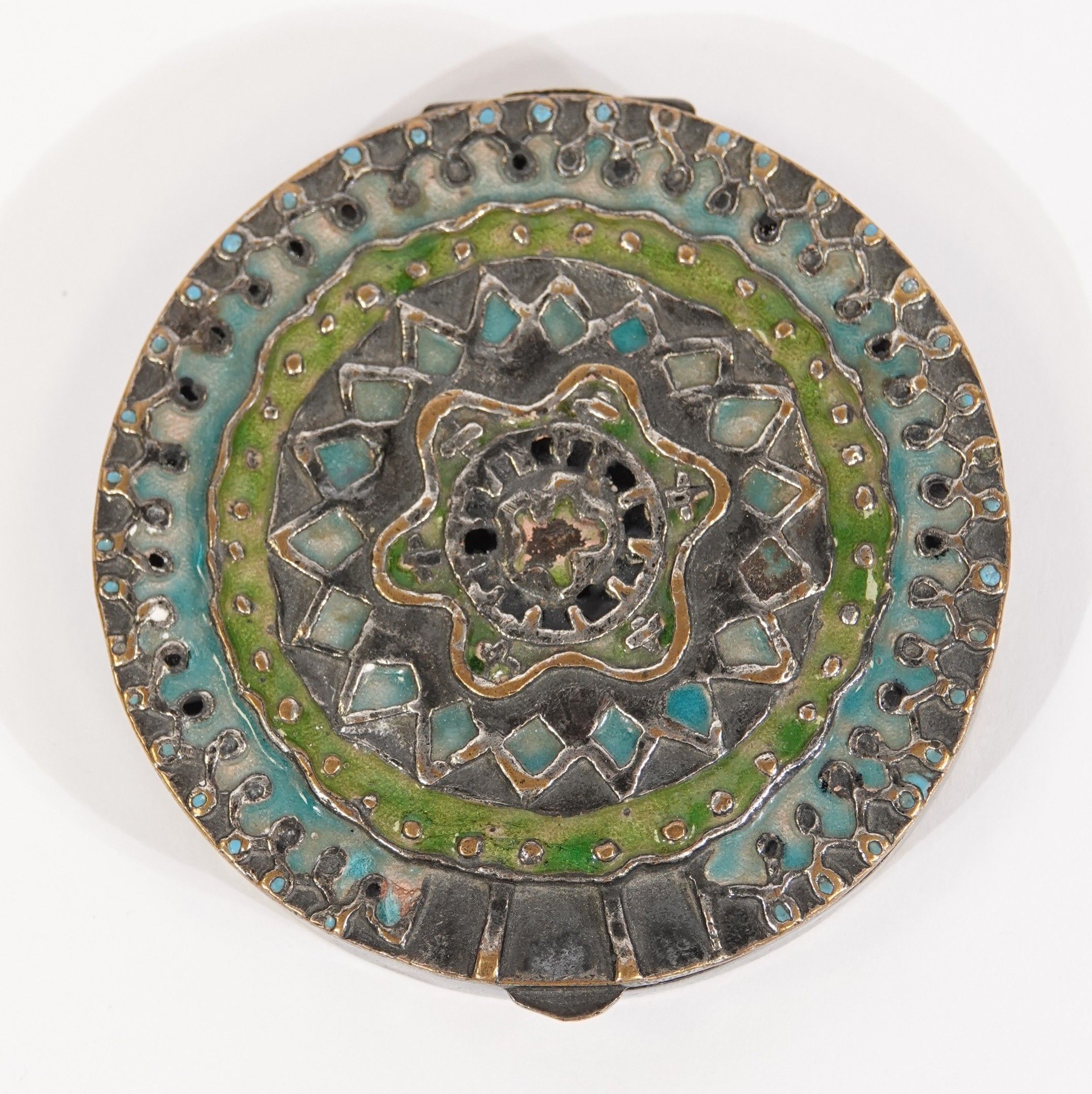 Circular silver-plated enamelled poudrier with radiating decoration.