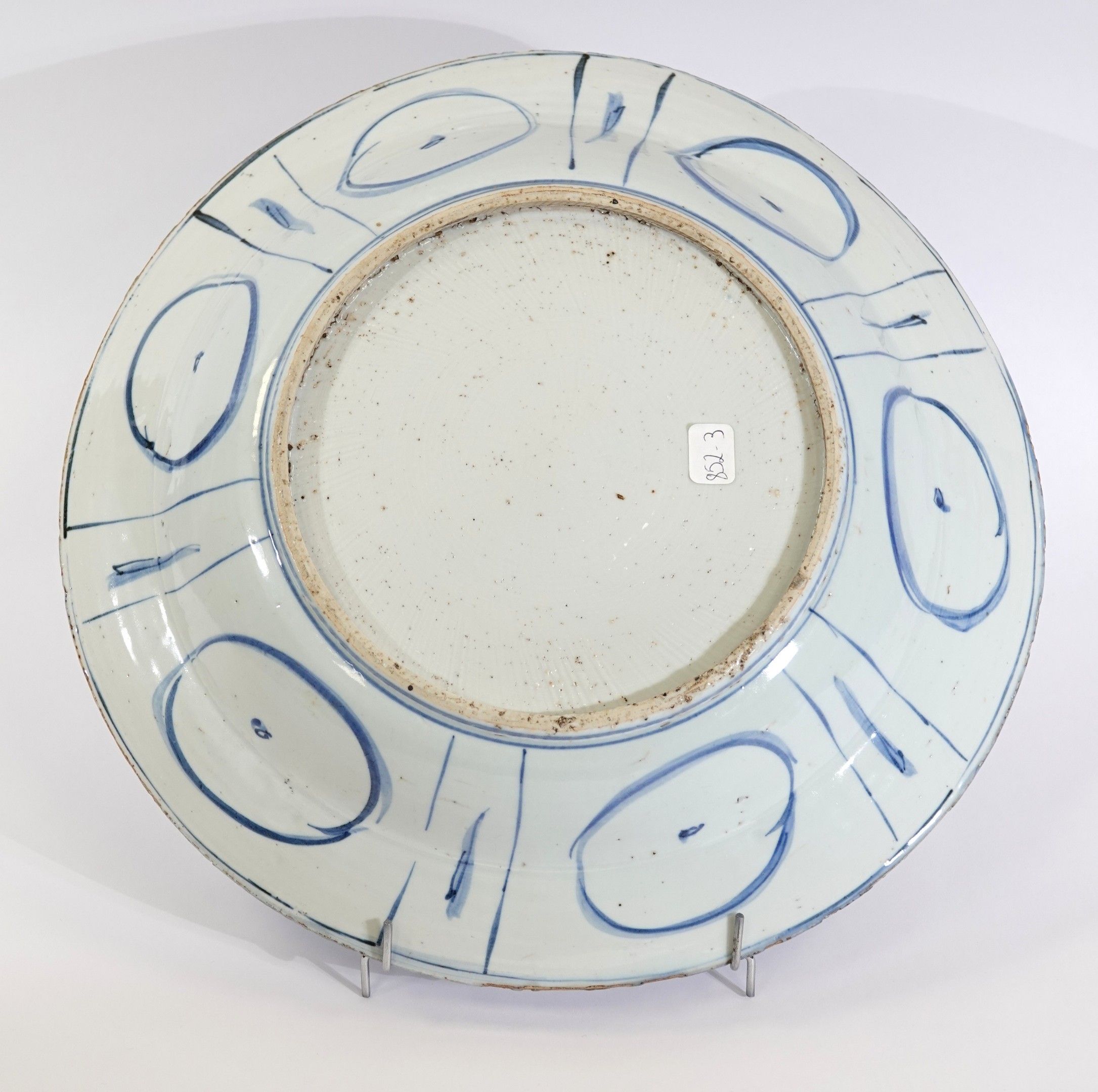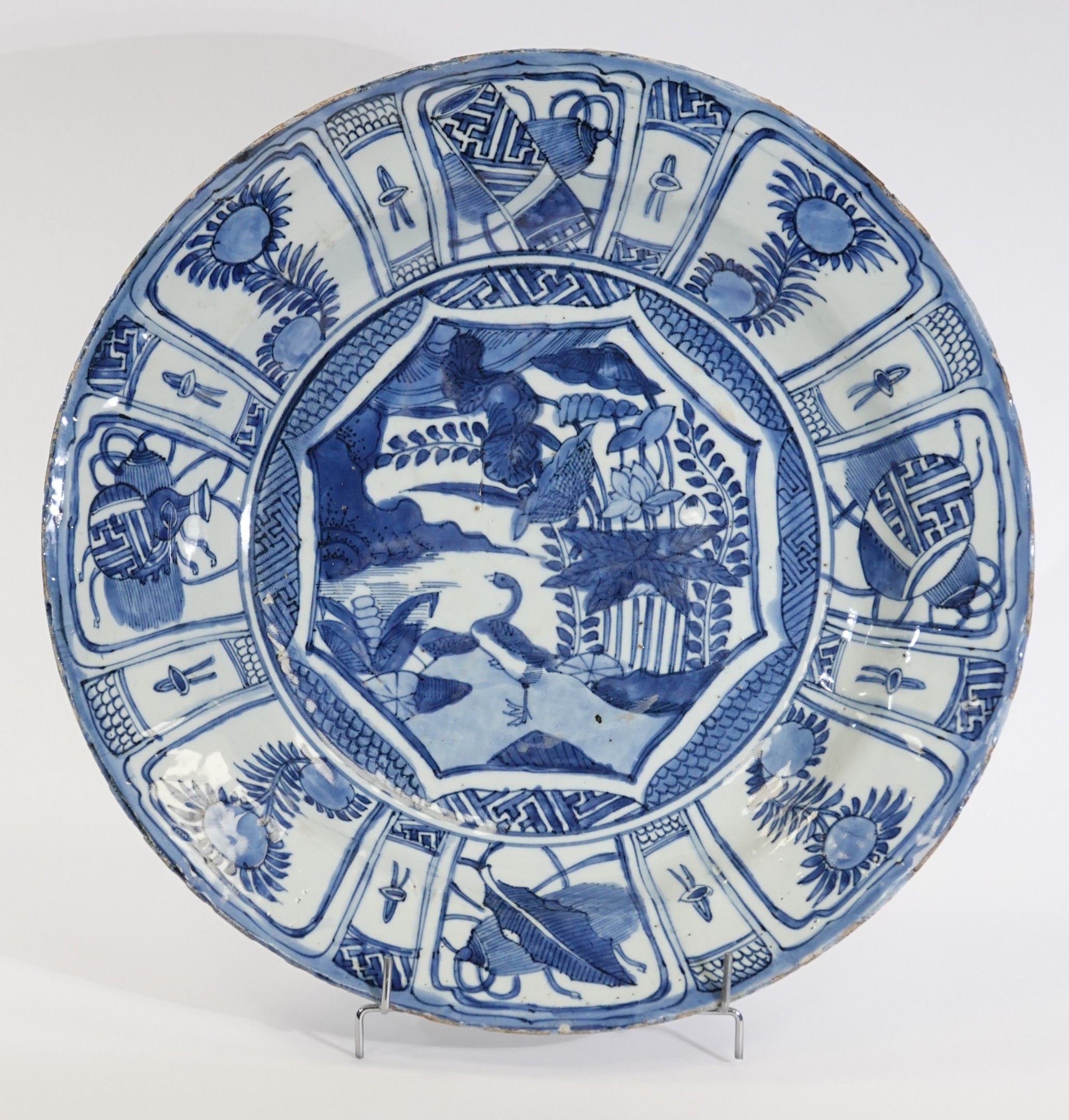 A large "Kraak" style blue-white porcelain bowl decorated with a duck among lotus flowers in a central medallion. The rim is decorated with a radiating pattern of lotus petals, flowers and stylised geometric motifs.