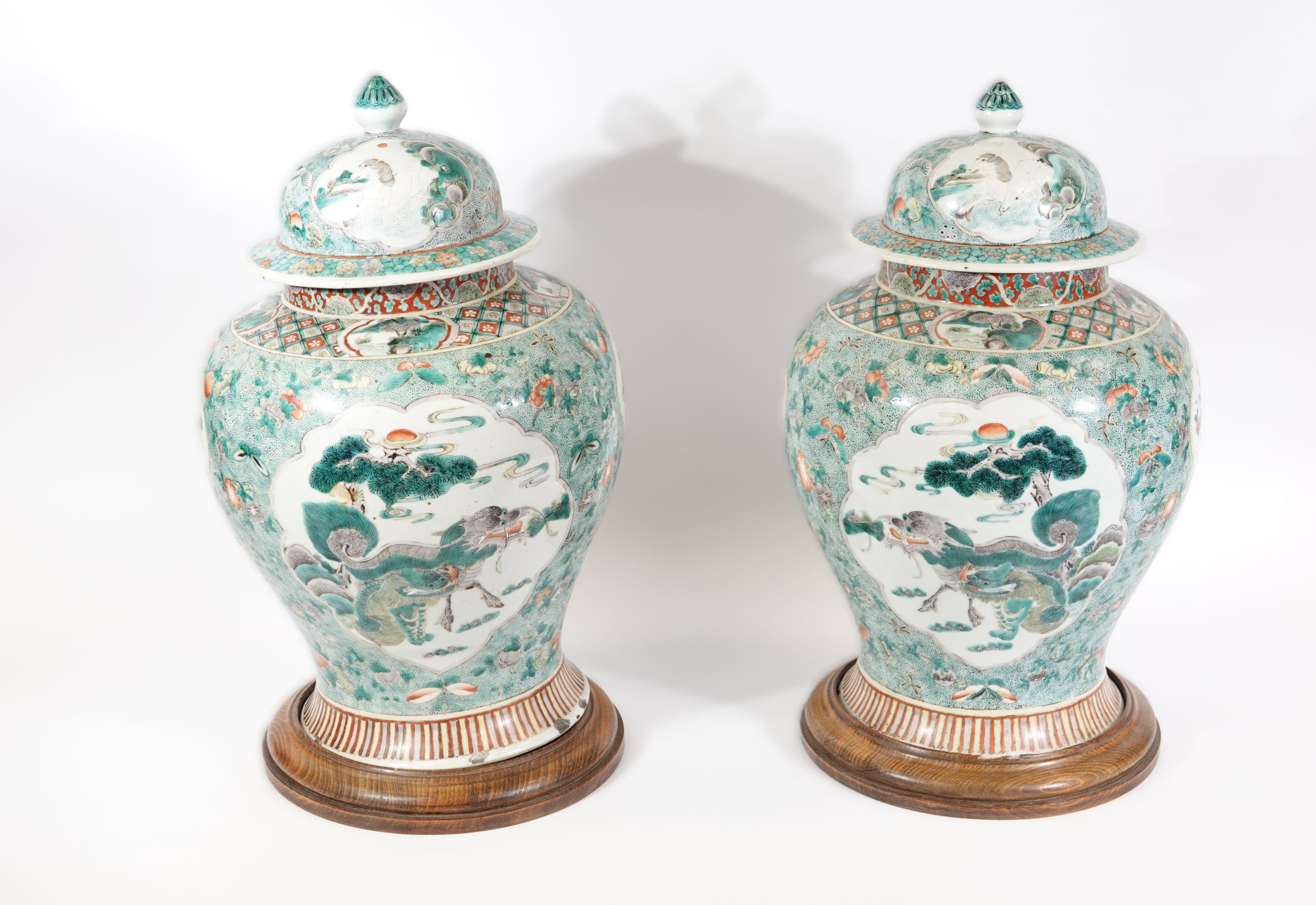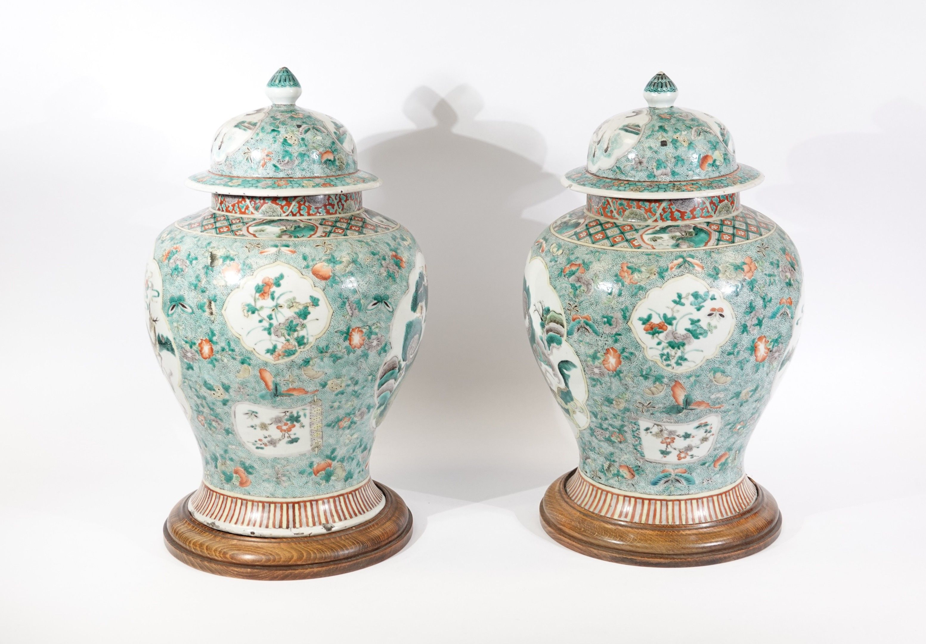 A pair of baluster-shaped porcelain and enamel covered potiches in the green family style, with medallion decoration of landscaped scenes of flowers and chimeras on a background of flowers and peacocks.