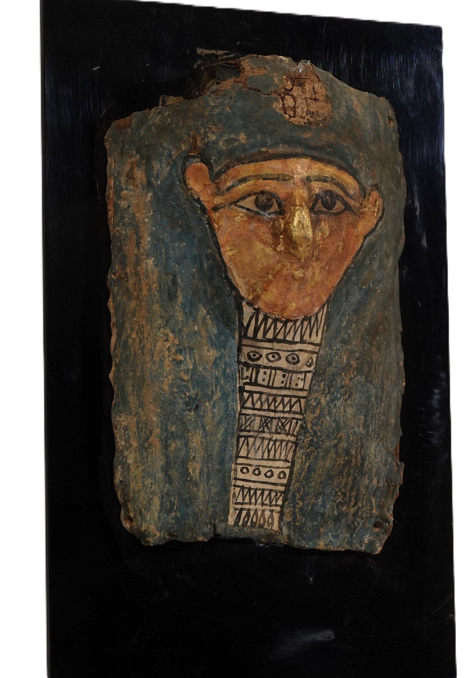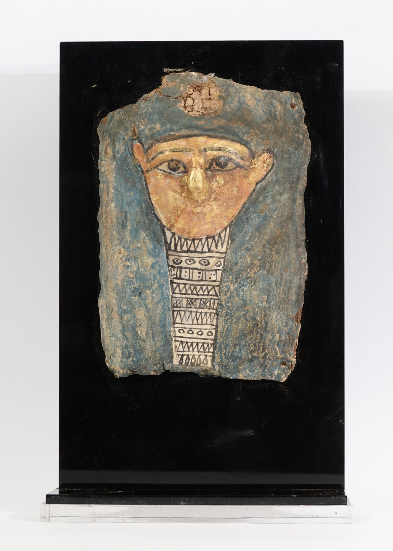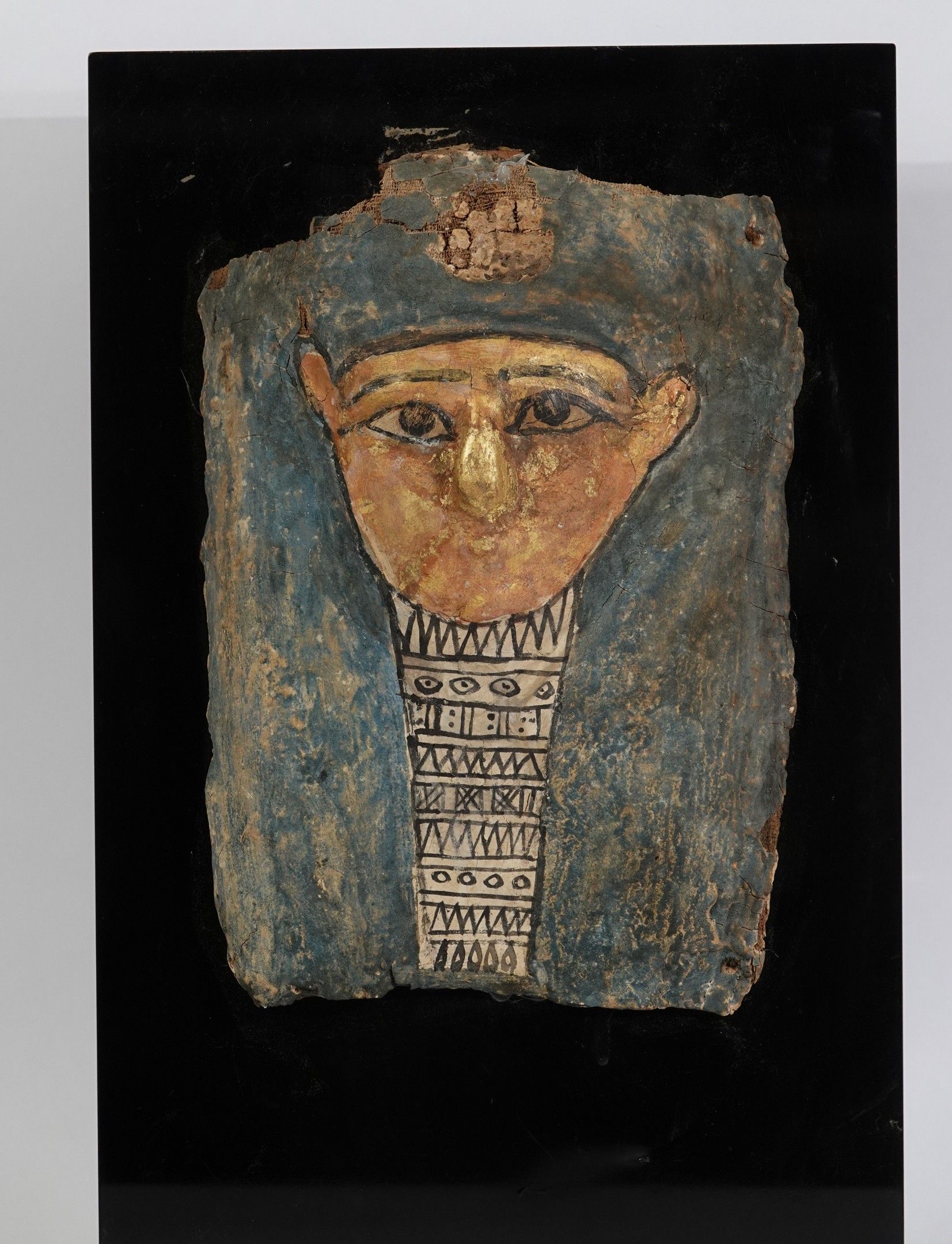 Funerary mask with plastron, featuring a face with long almond-shaped eyes and thick eyebrows, topped with a blue-painted wig.