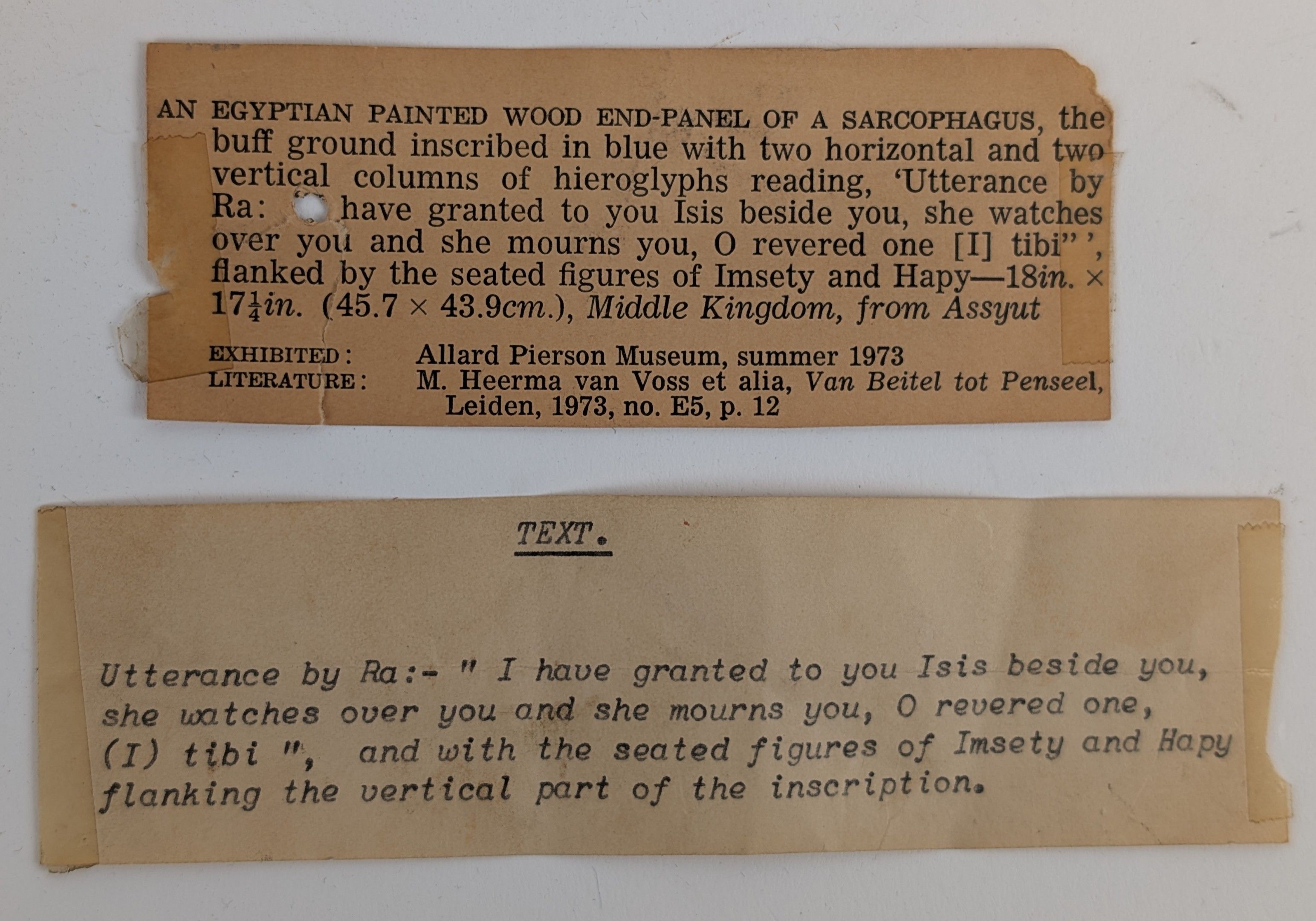 Translation and provenance given on a fragment of a sales catalogue, Assyut
