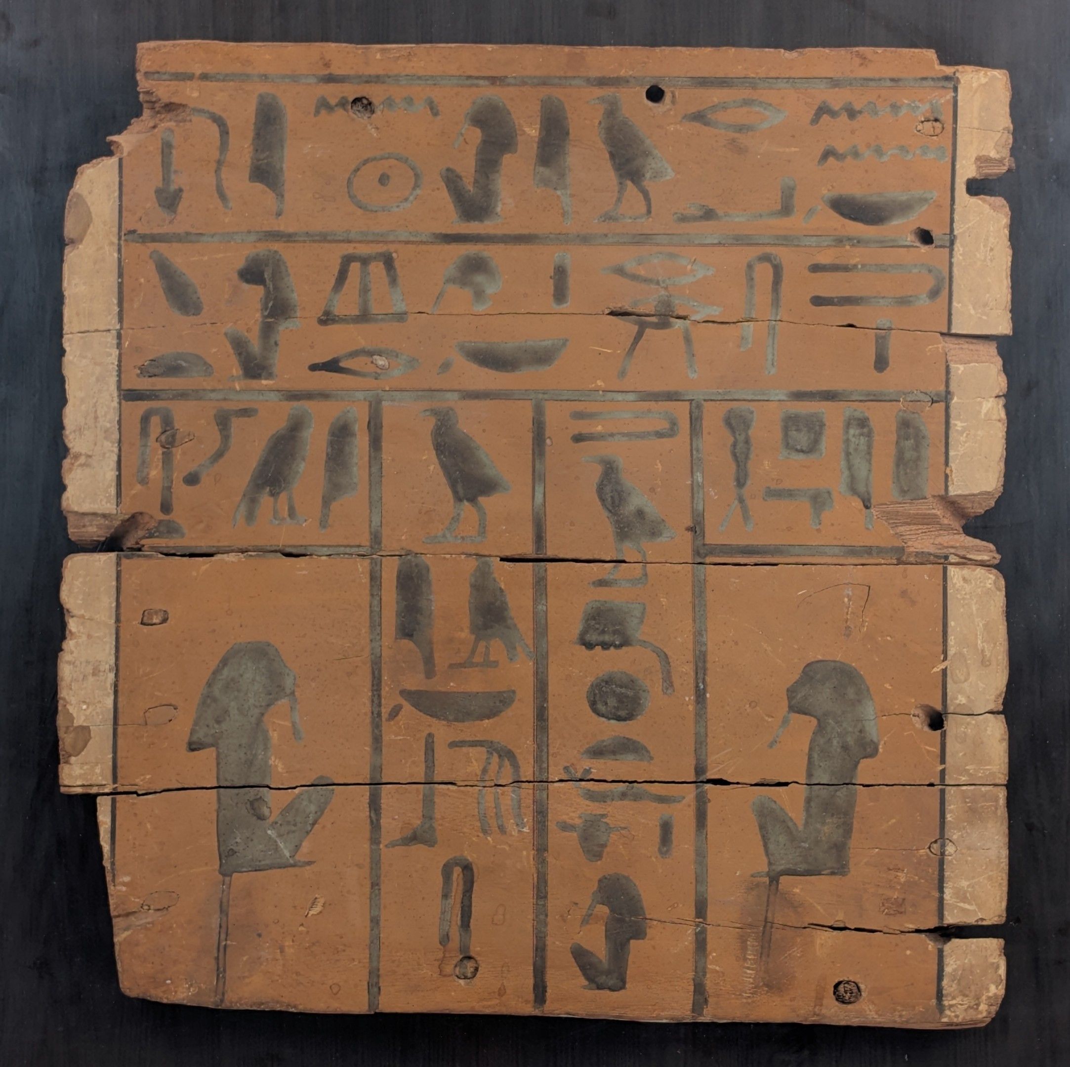 Fragment of a sarcophagus decorated with hieroglyphs, framed…