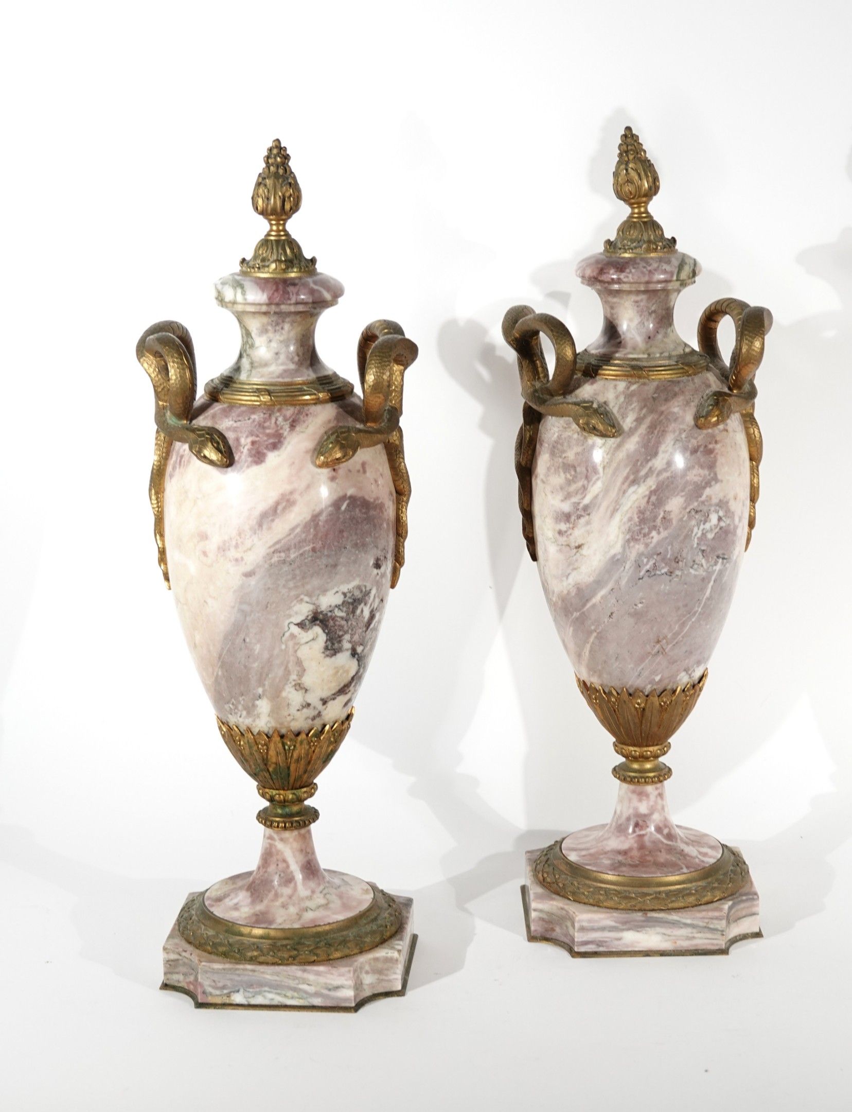 A pair of covered ovoid vases in veined pink marble and gilt bronze, richly decorated with snakes and friezes of leaves, the handles of the lids decorated with stylised fruit.