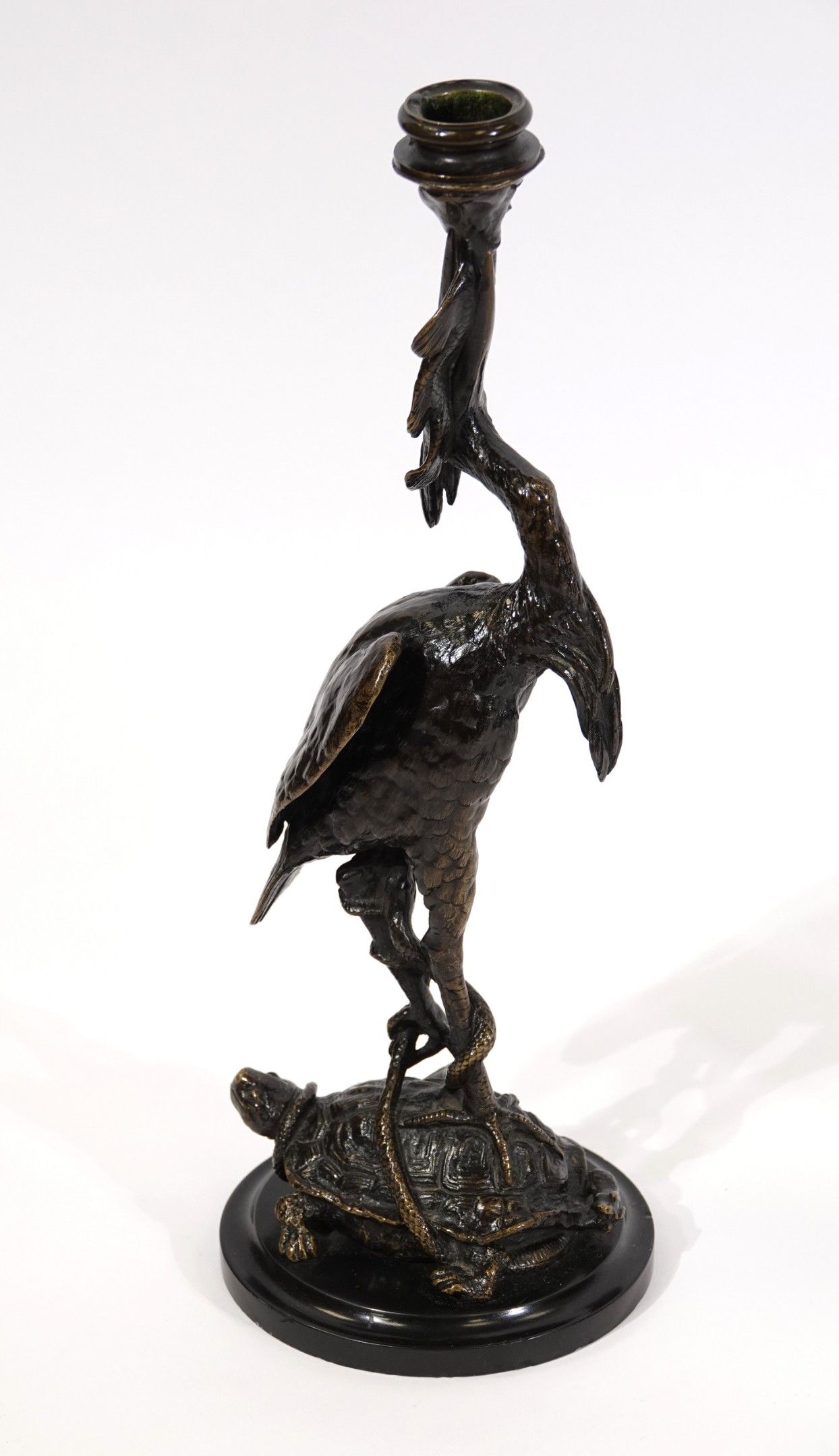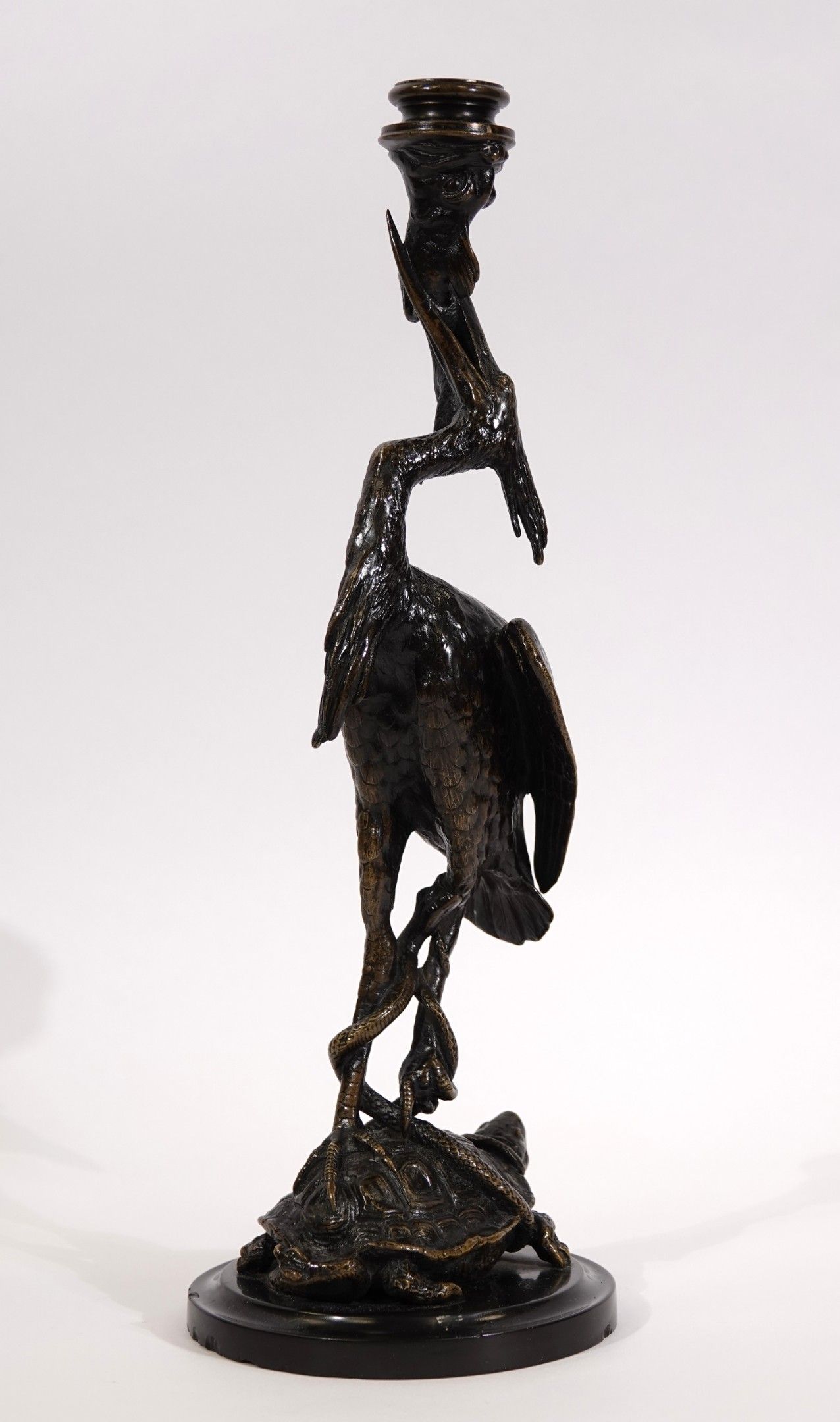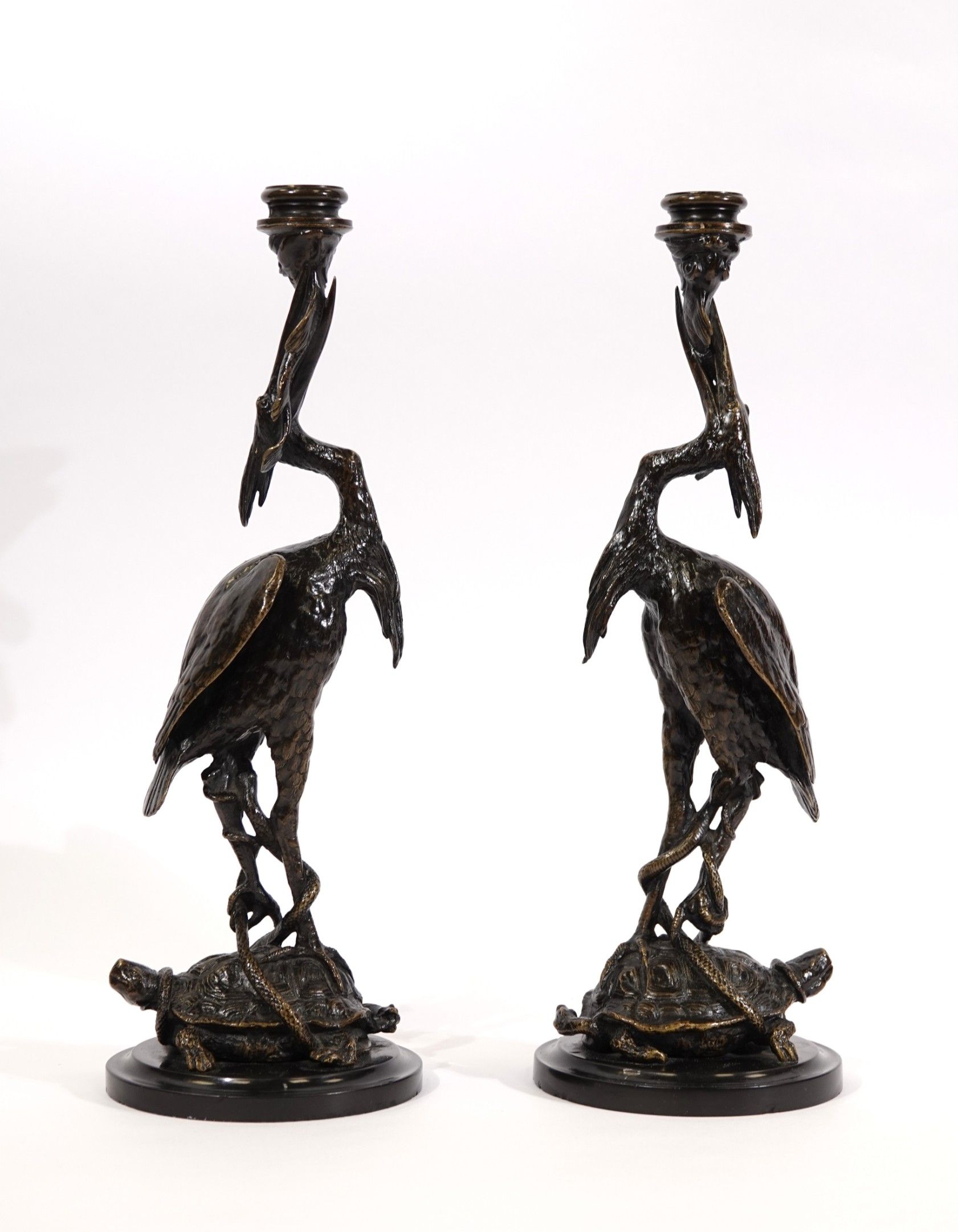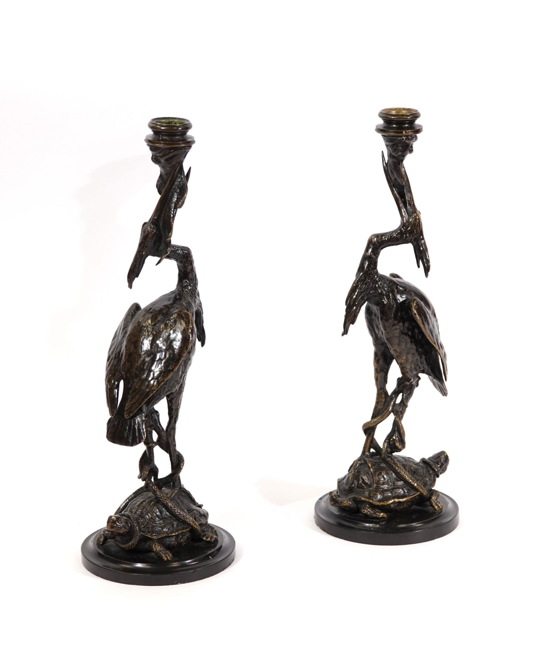 A pair of bronze candlesticks with a fine brown patina depicting wading birds bitten by snakes resting on turtles and holding a carp in their beaks.