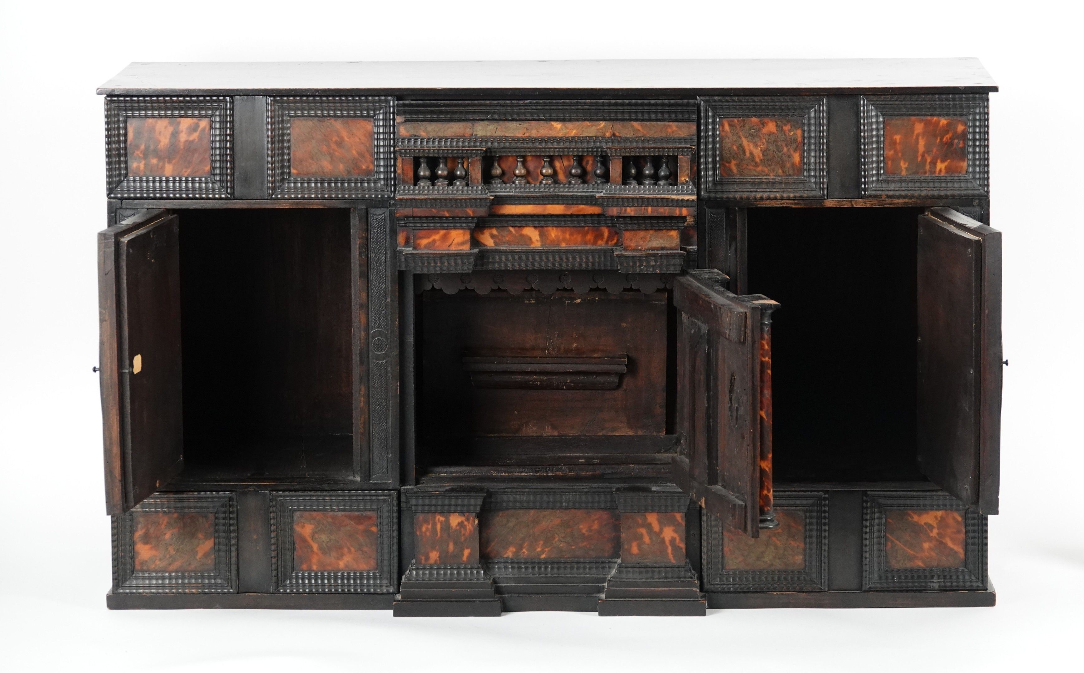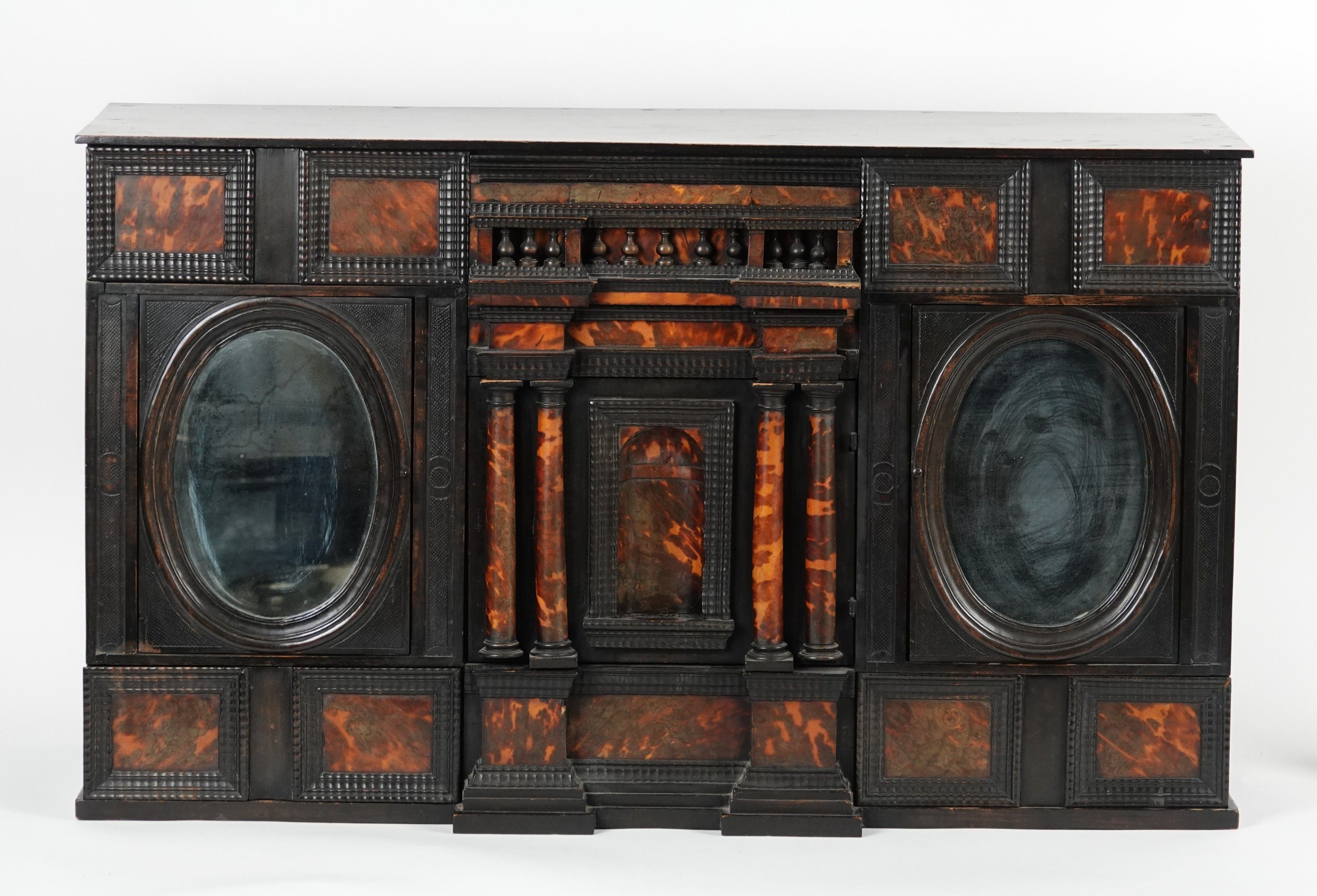 Small rectangular cabinet in ebony, ebony veneer and red tortoiseshell, opening on the front with drawers and two panels adorned with oval mirrors. The central part is decorated with a niche framed by two columns and topped by a small balustrade.