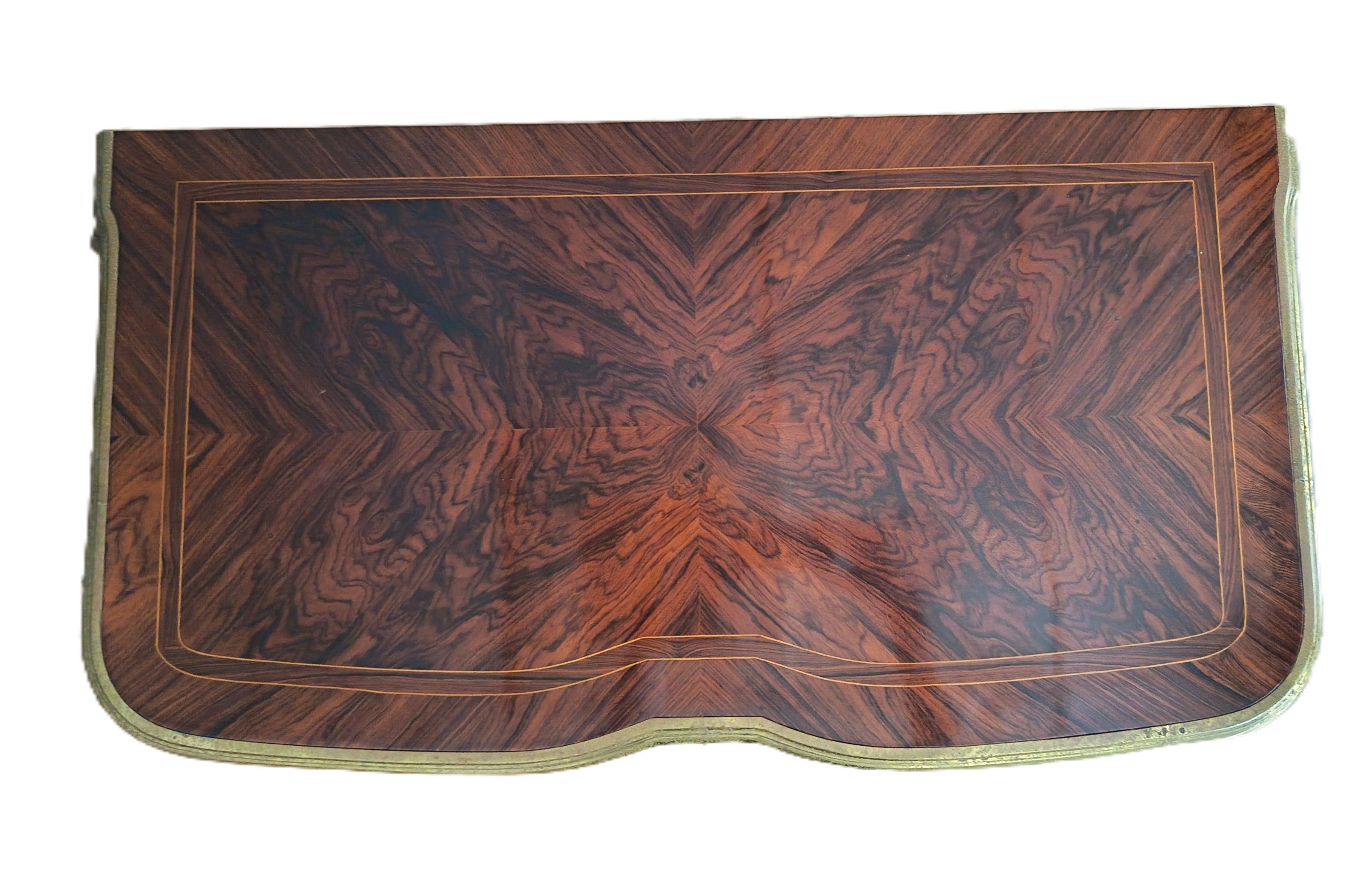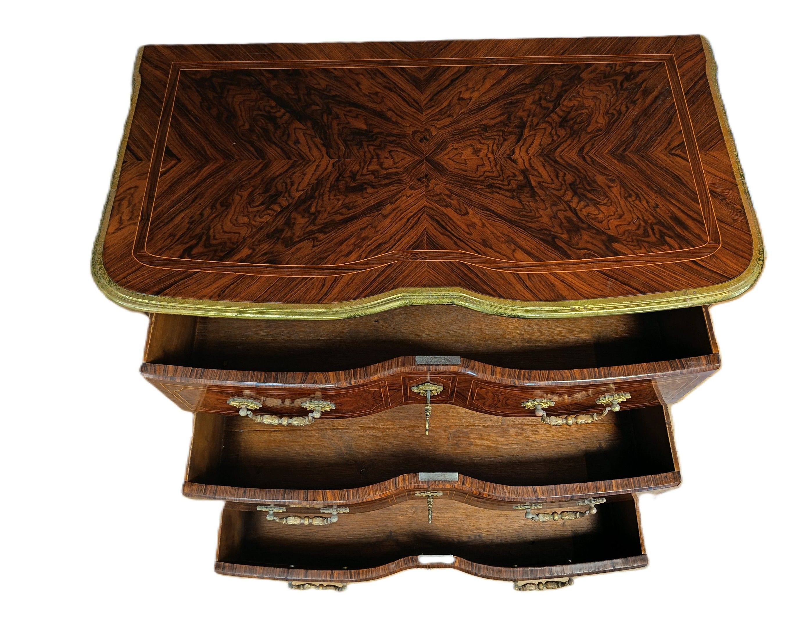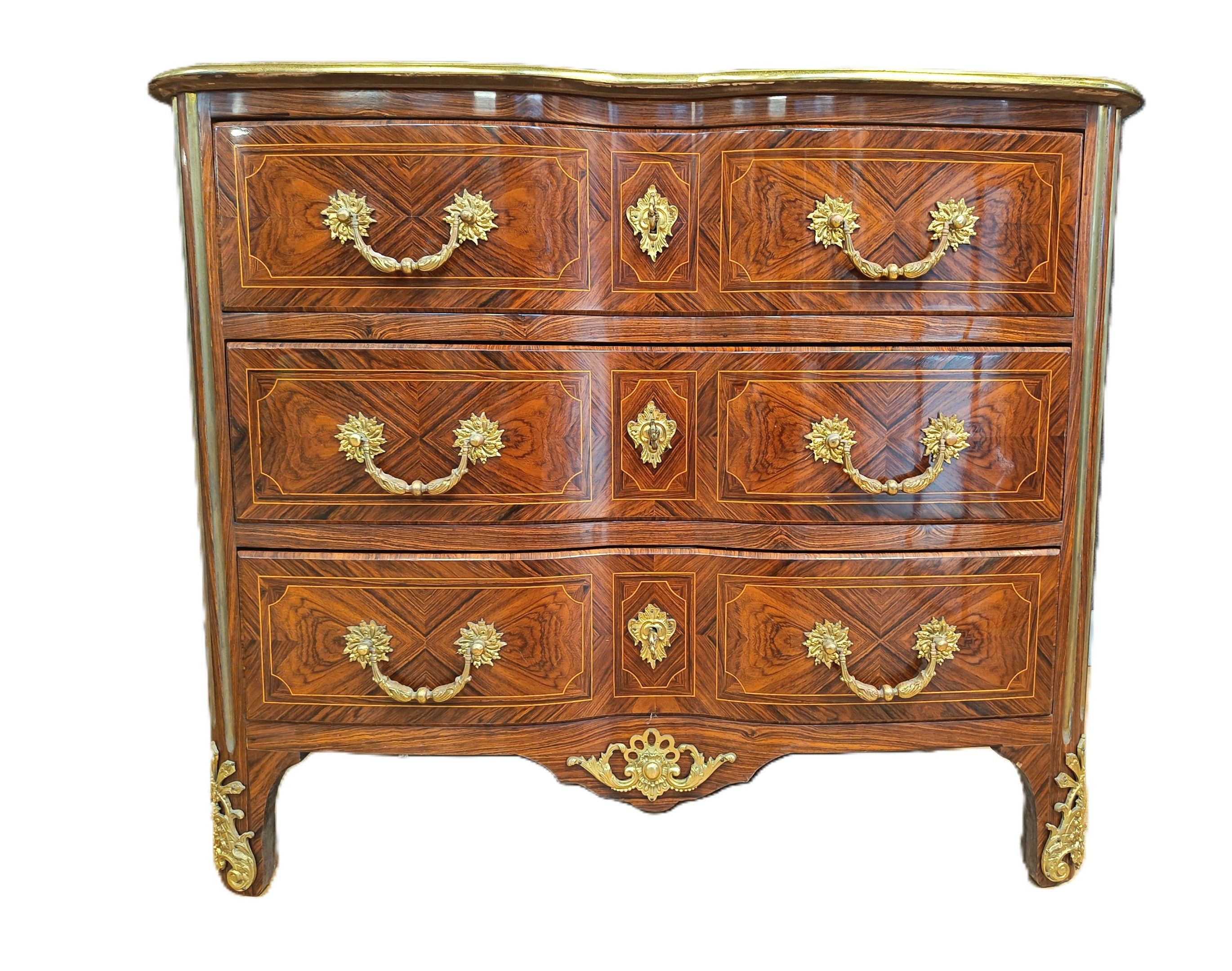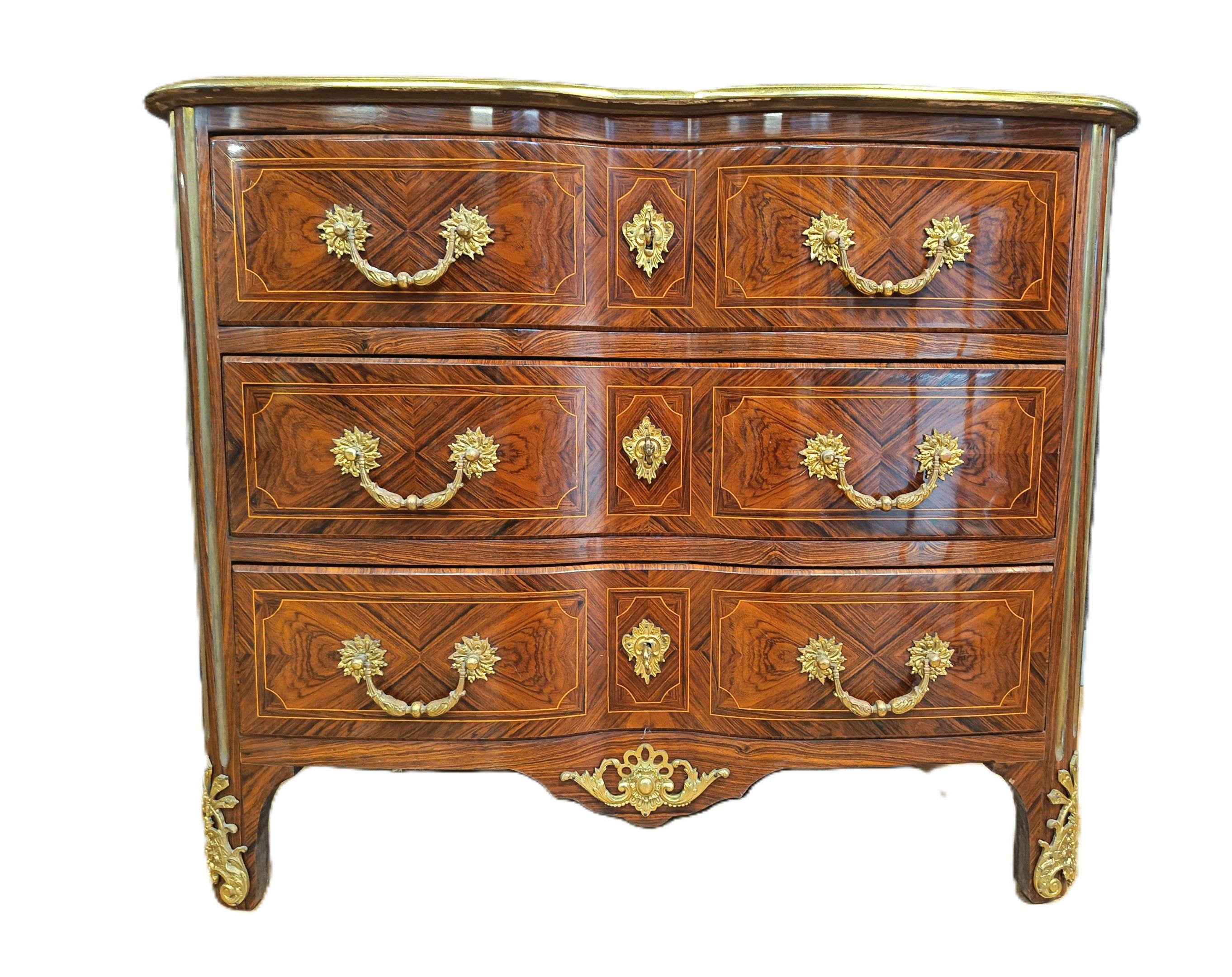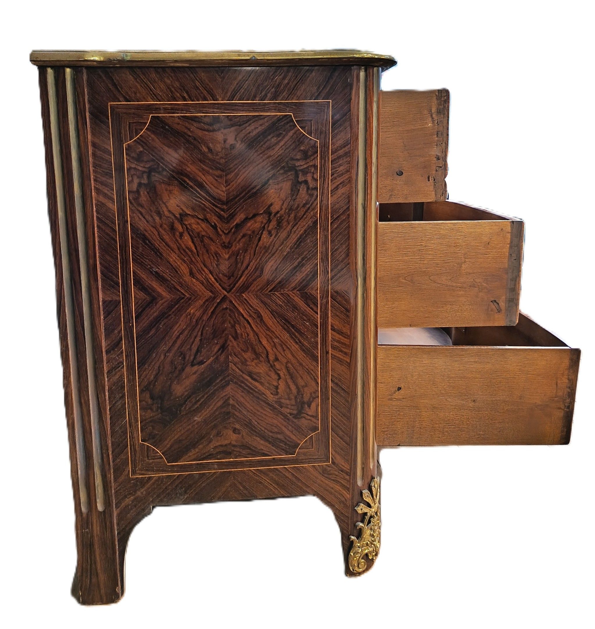 Curved chest of drawers with three drawers, veneered with violet and rosewood decorated with geometric friezes underlined by light fillets, decorated with chased and gilded bronzes.