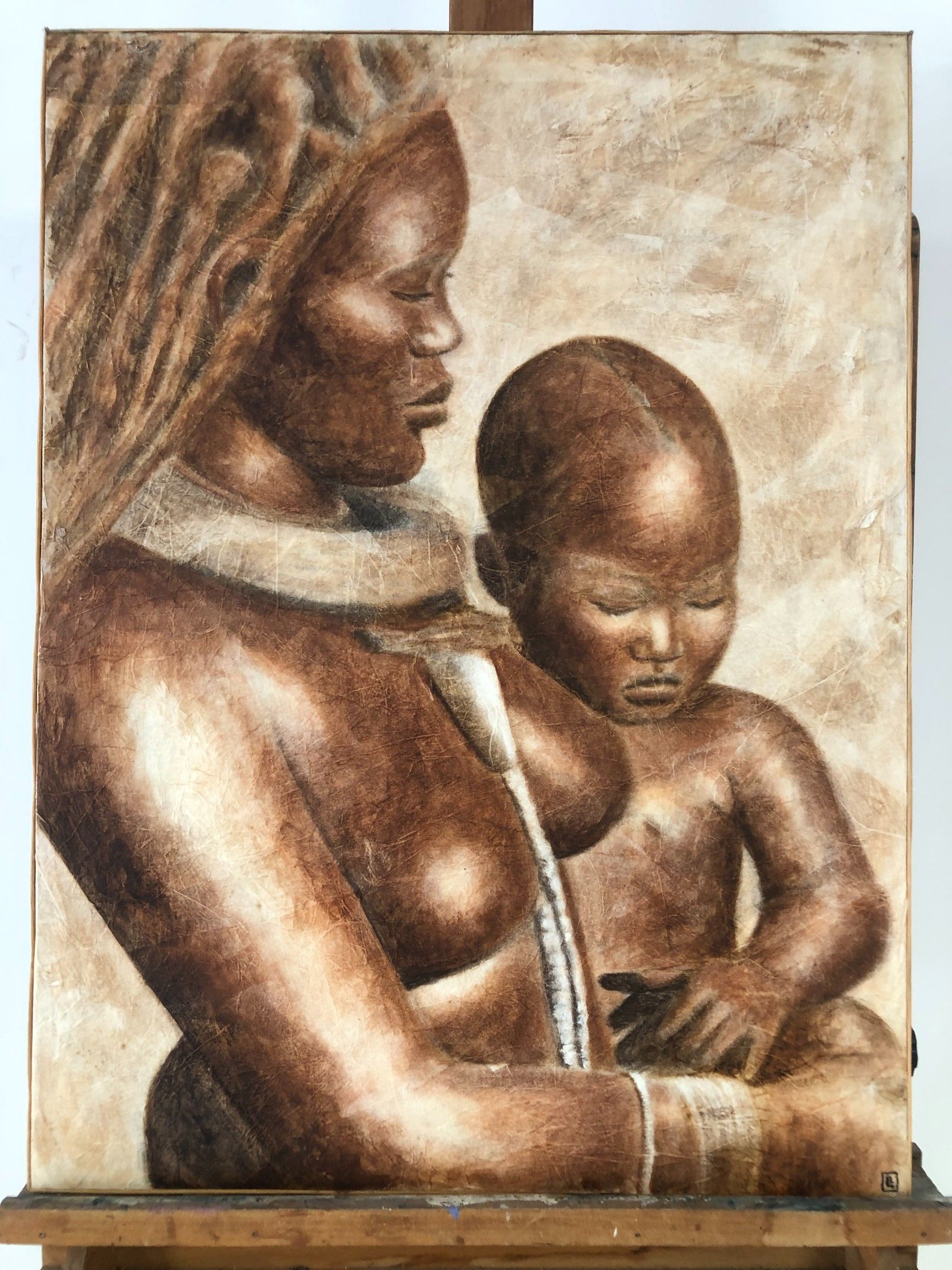 LECOULE Laurence "Femme d'Afrique et son enfant" monogrammed LL paper on panel (81x61cm)