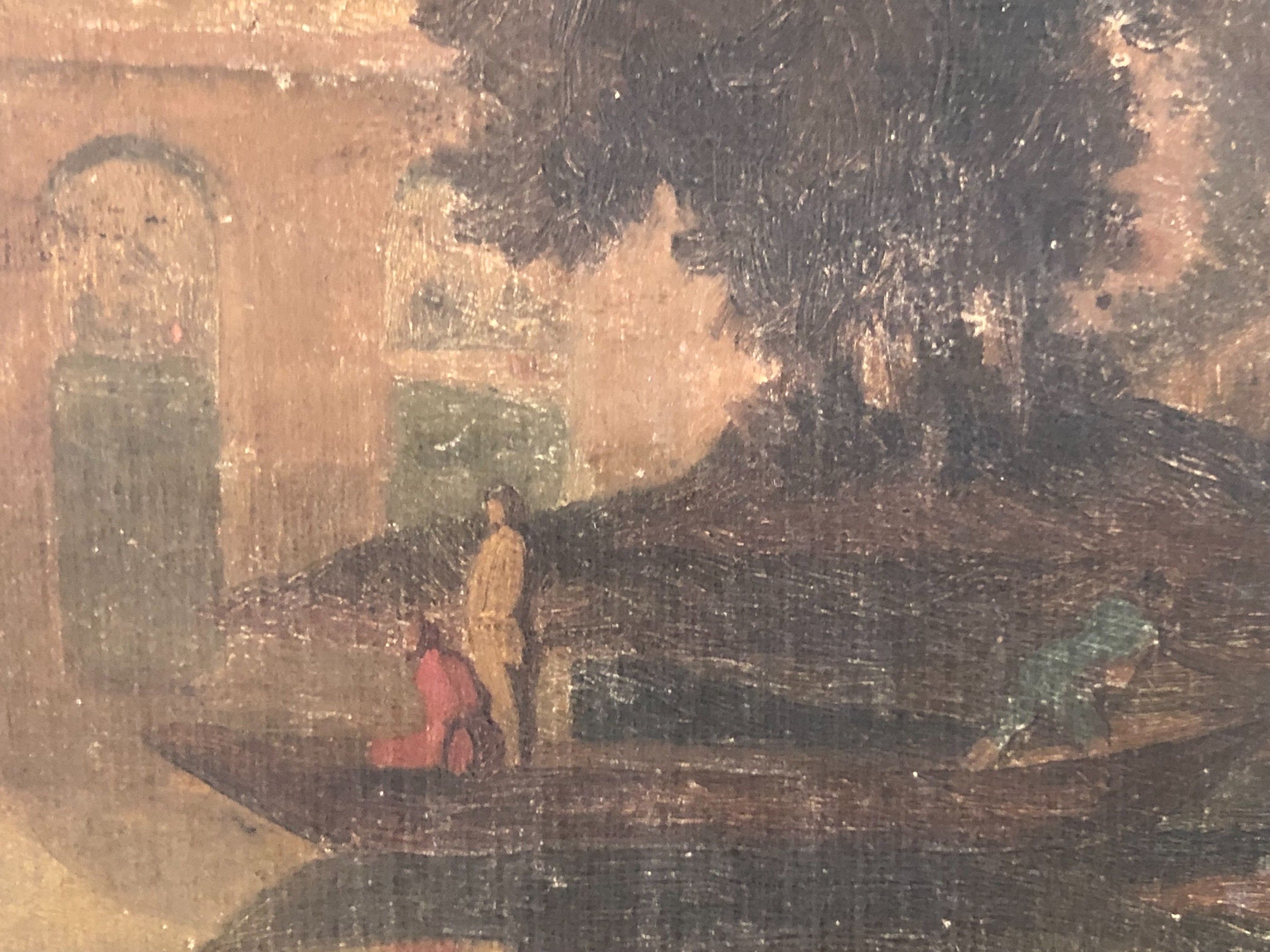 French school, after Francisque Millet (1624-1679), "Landscape by a lake and bridge" HST 19th century (22,5xx33cm) (accidents on canvas and pigments)