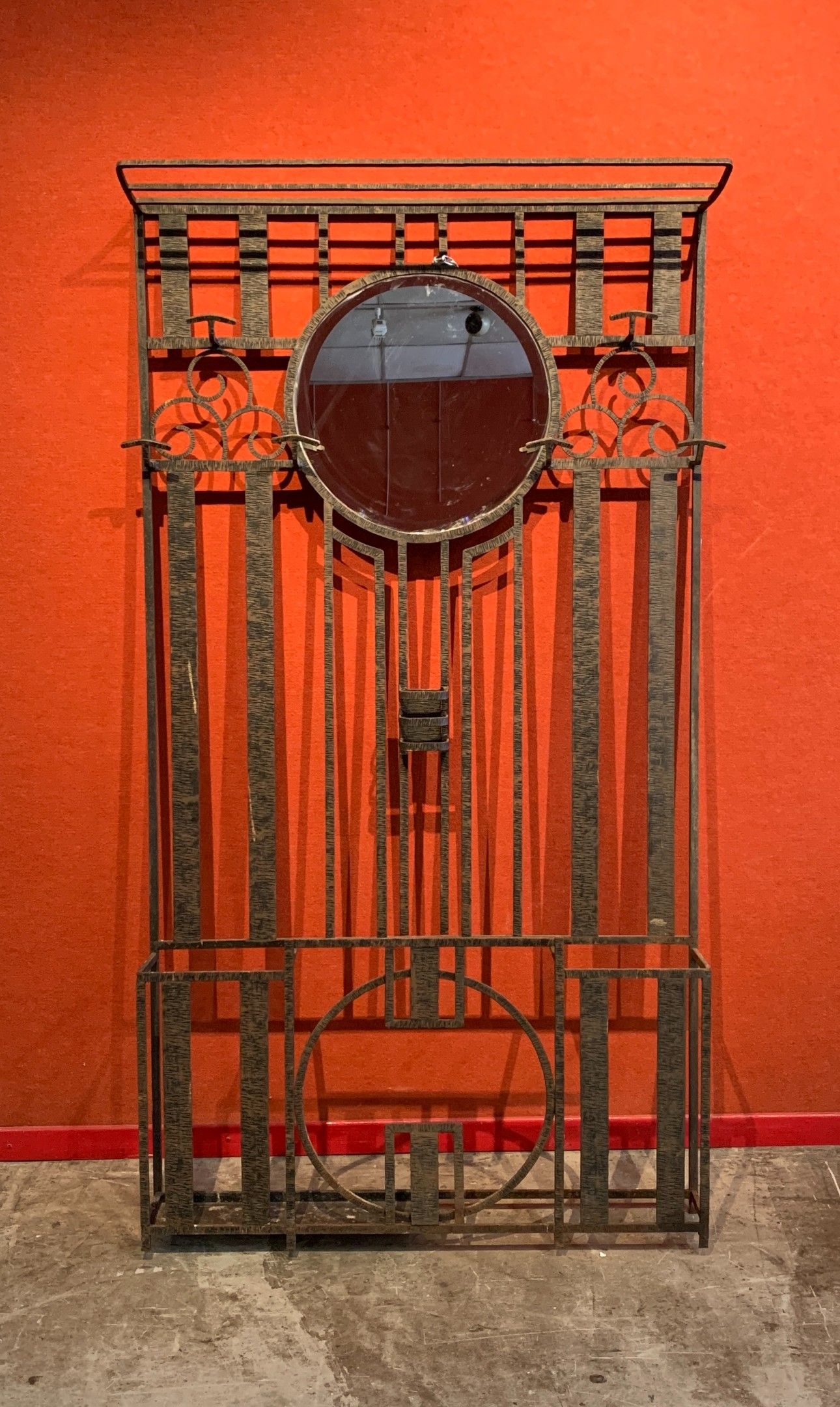 Wrought iron cloakroom with scroll decoration, central mirro…