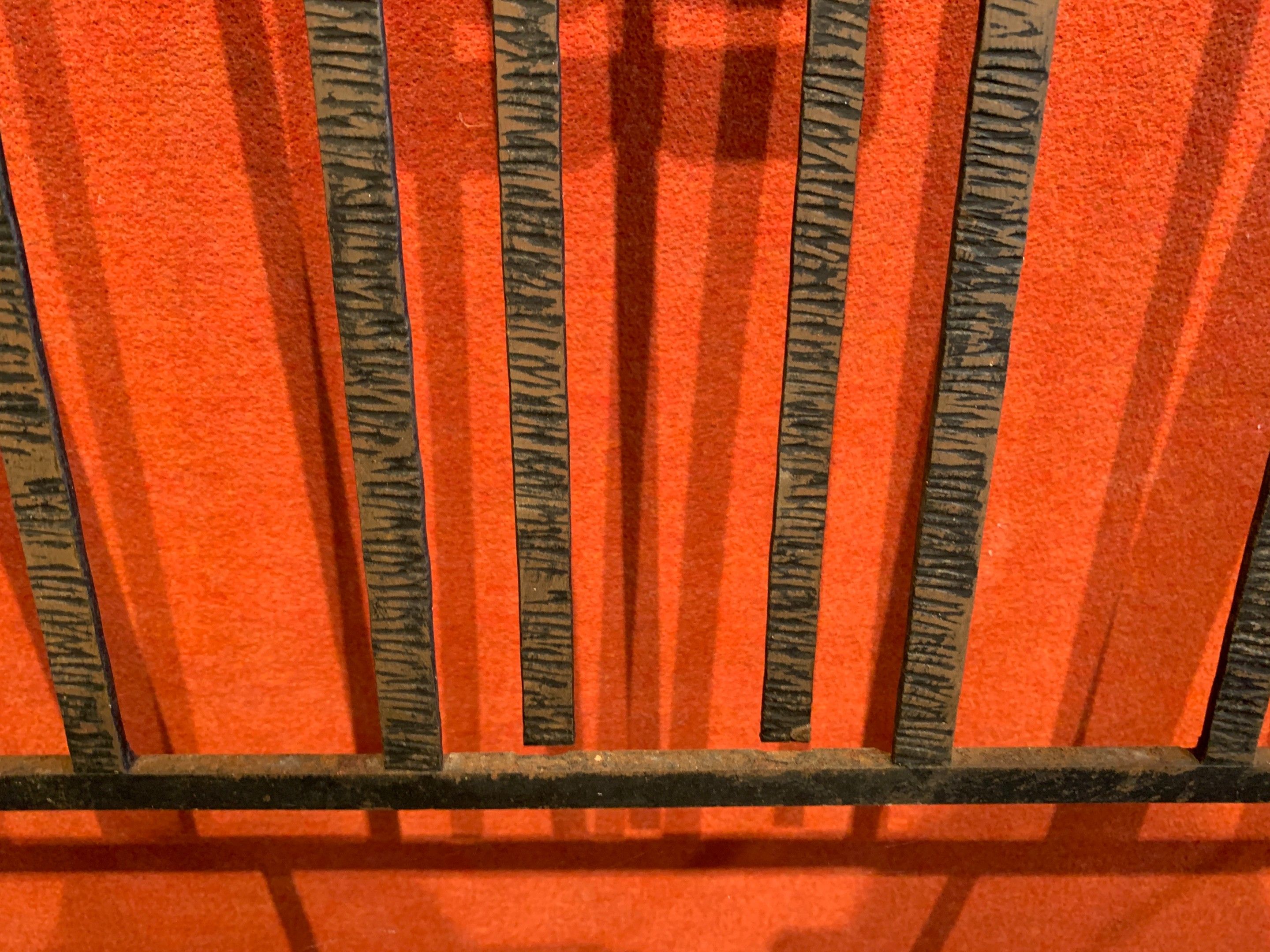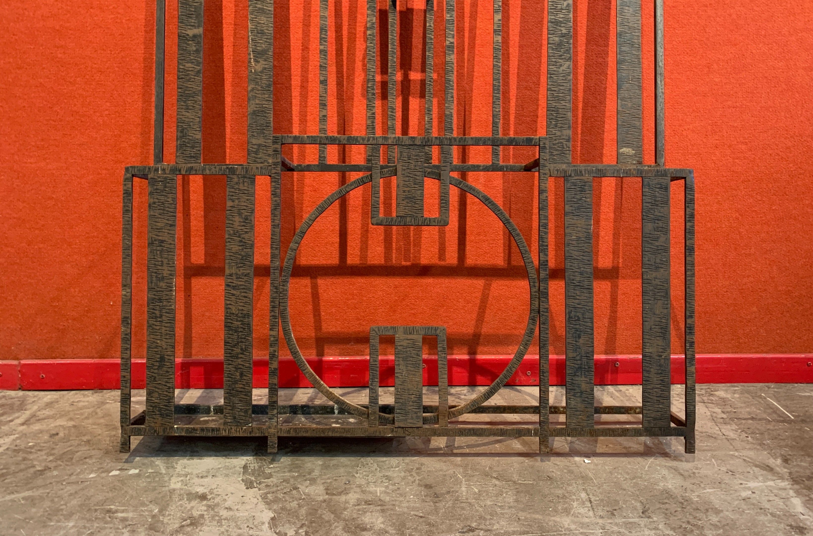 Wrought iron cloakroom with scroll decoration, central mirror, coat hooks and umbrella stand. 194 x 105 cm (traces of oxidation; two parts need re-soldering)
