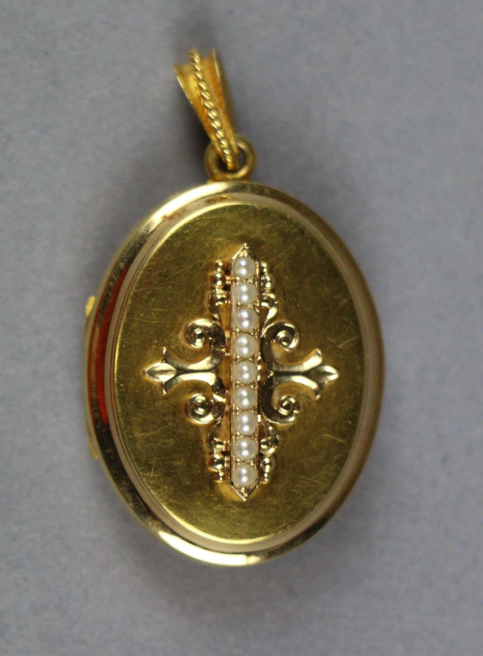 Picture-holder pendant in 750 thousandths yellow gold adorned with a row of pearls. Marked with a horse's head. (A small shock) Weight : 12,06 g