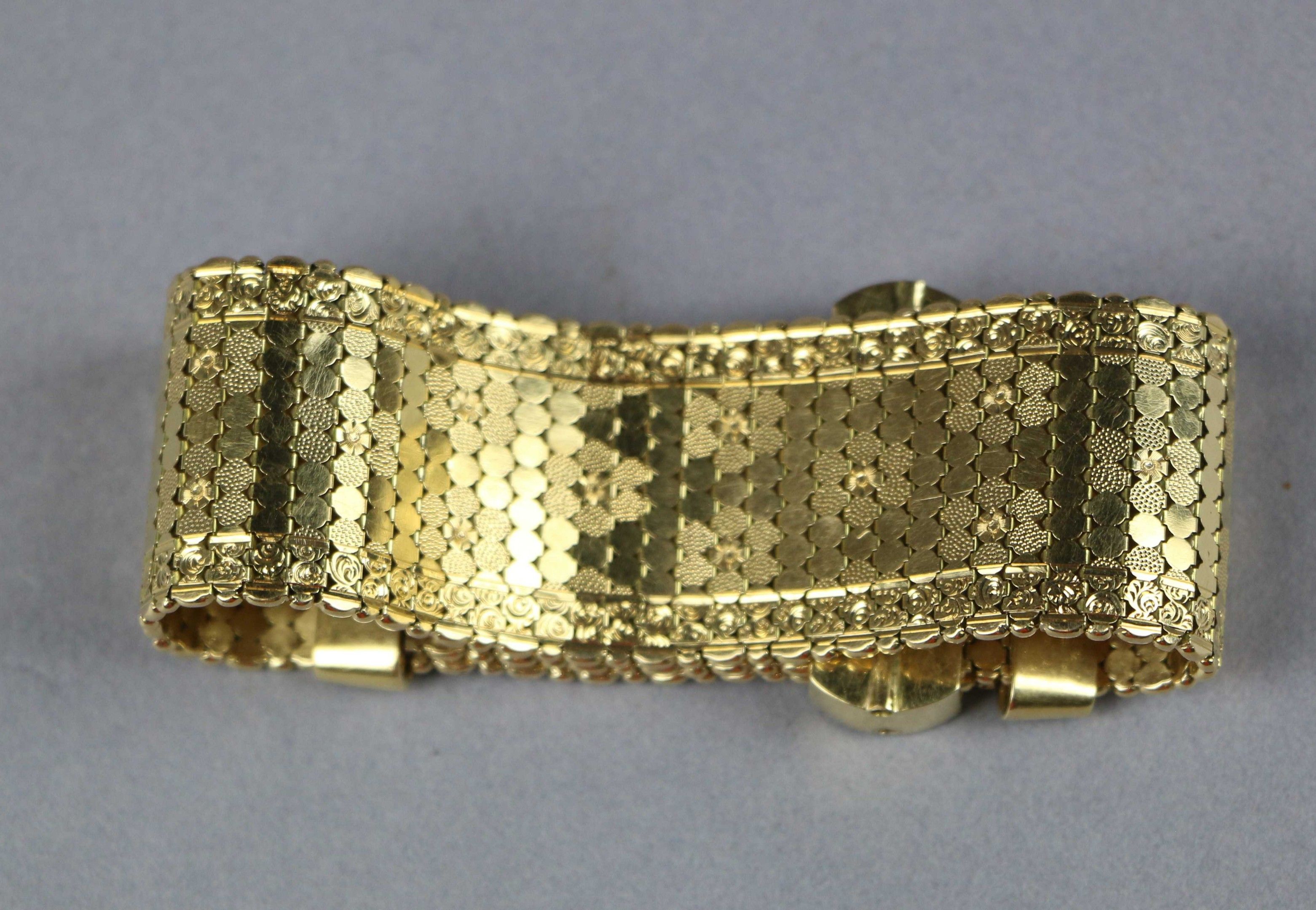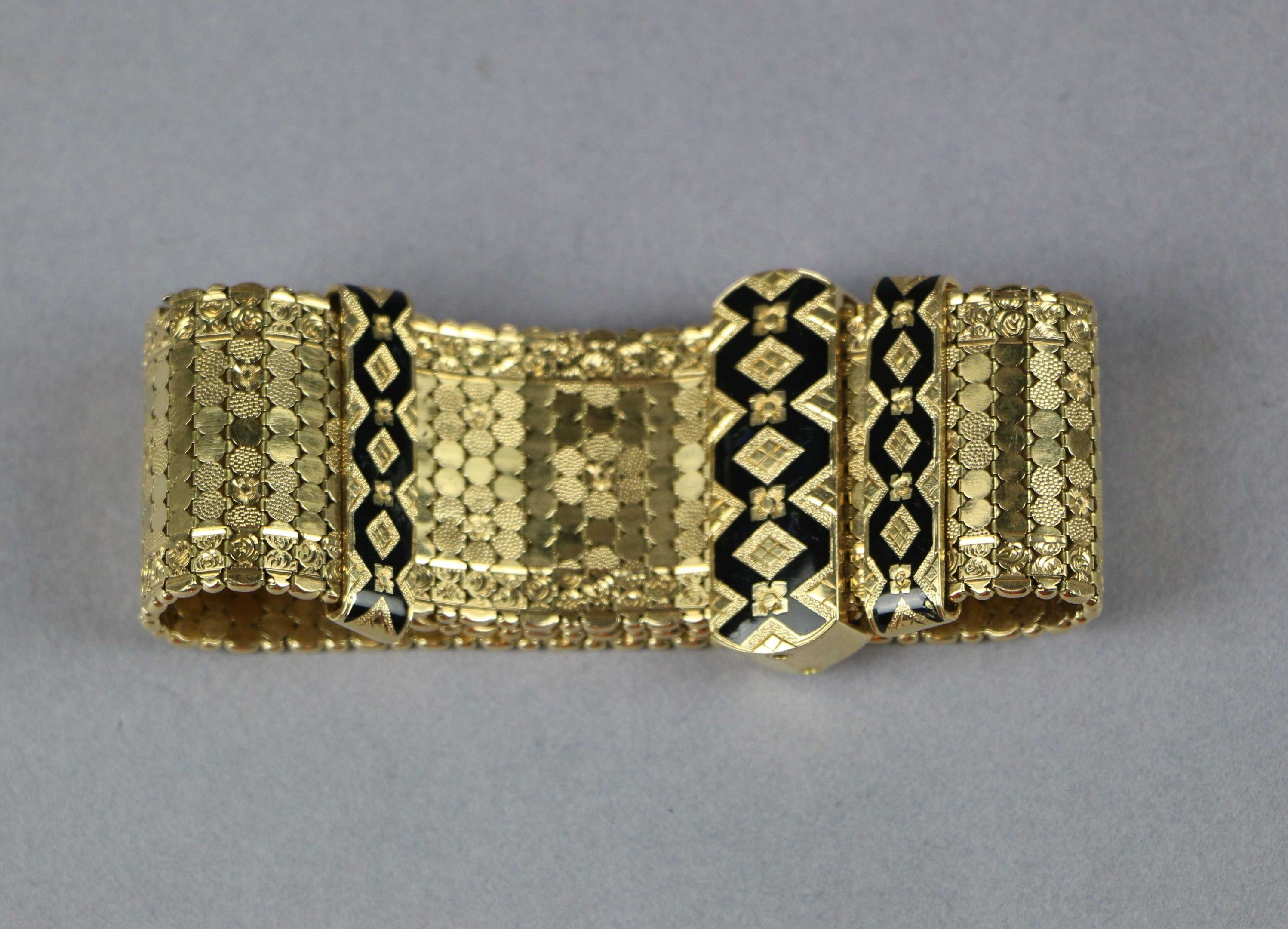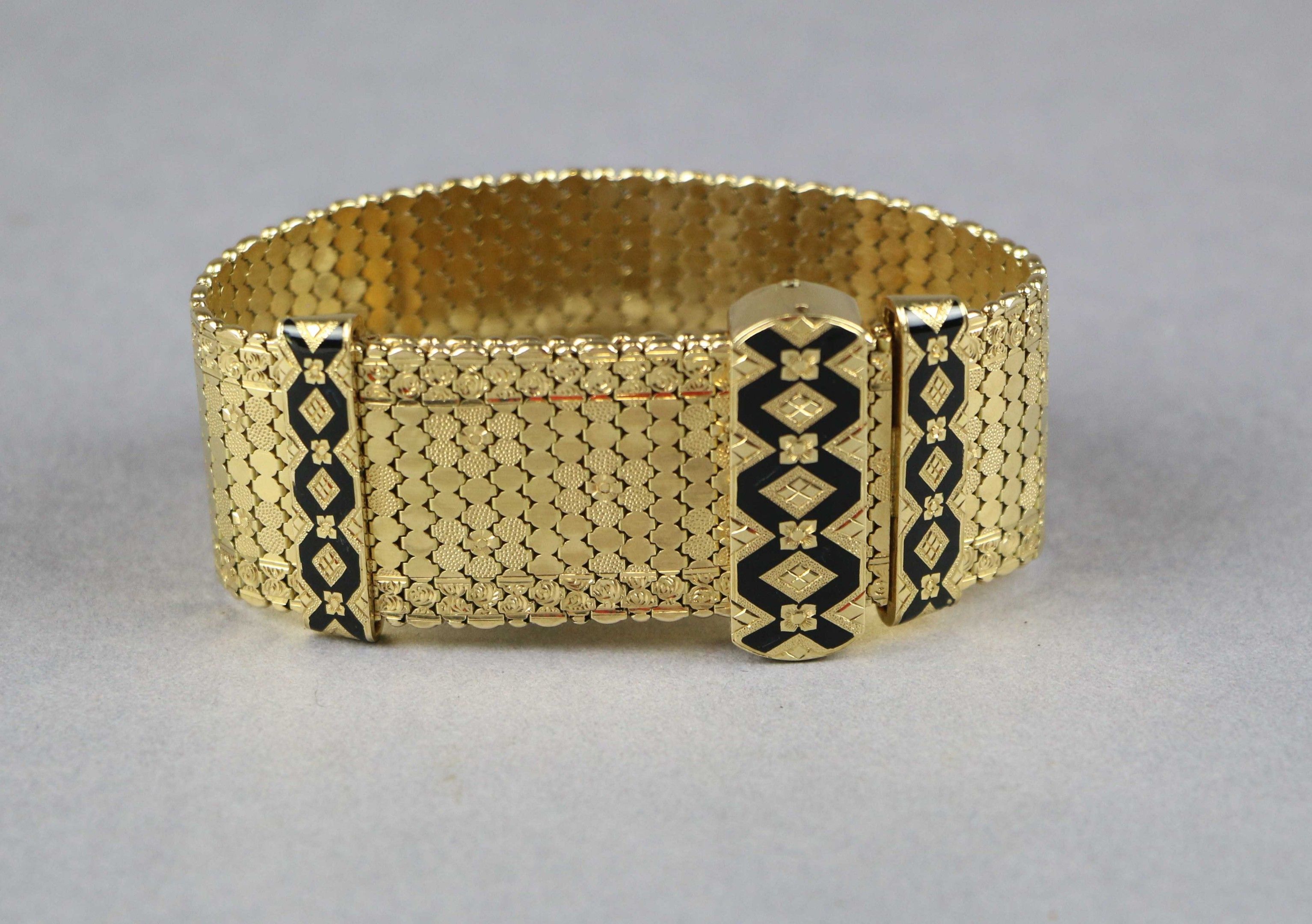 Sliding supple BRACELET in 750 thousandths yellow gold with enamel inclusions decorated with geometric motifs. Marked with an eagle's head. Gross weight: 57.03 g