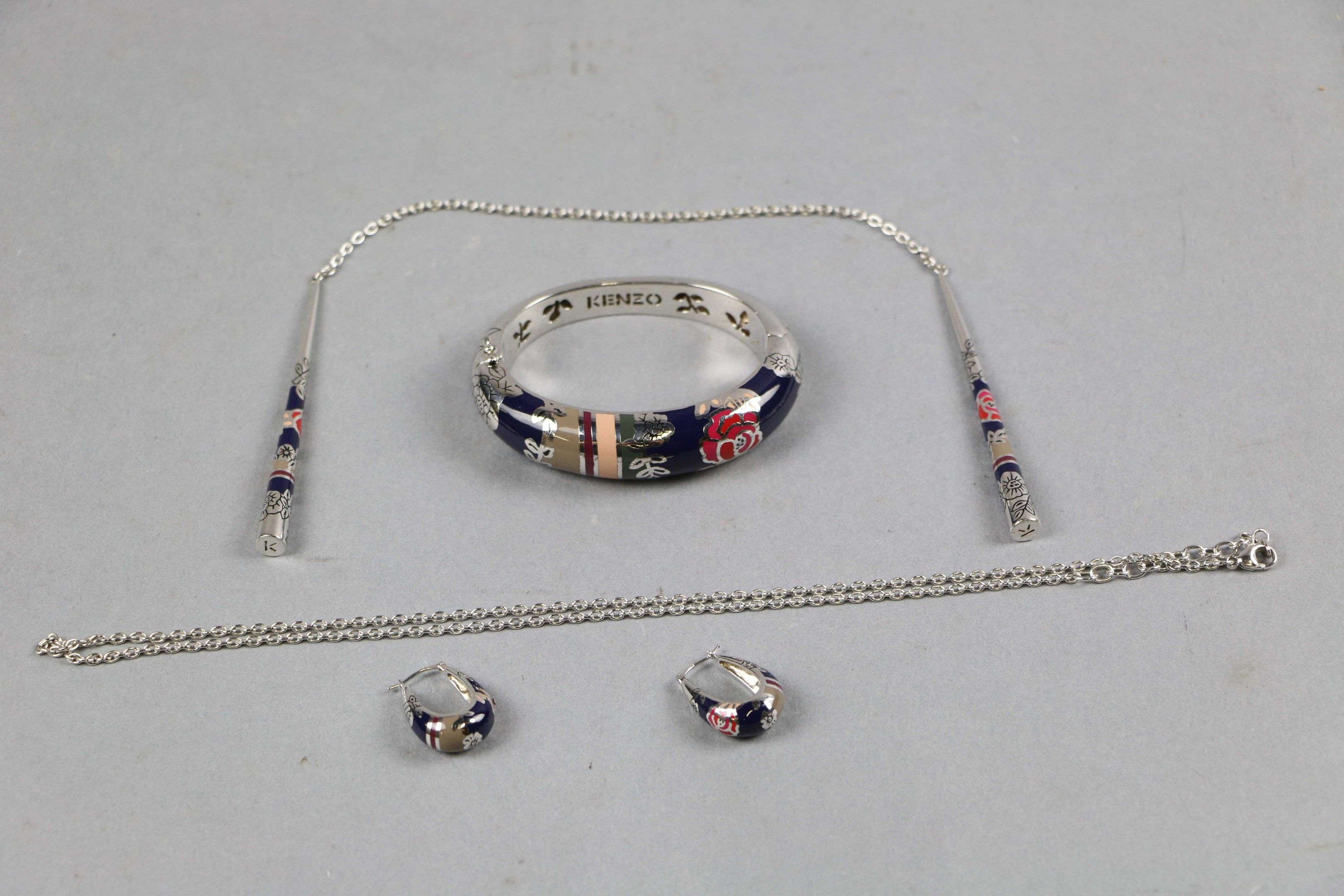 KENZO: 925 thousandths silver necklace, bracelet and pair of earrings with enamelled floral motifs. In rules.