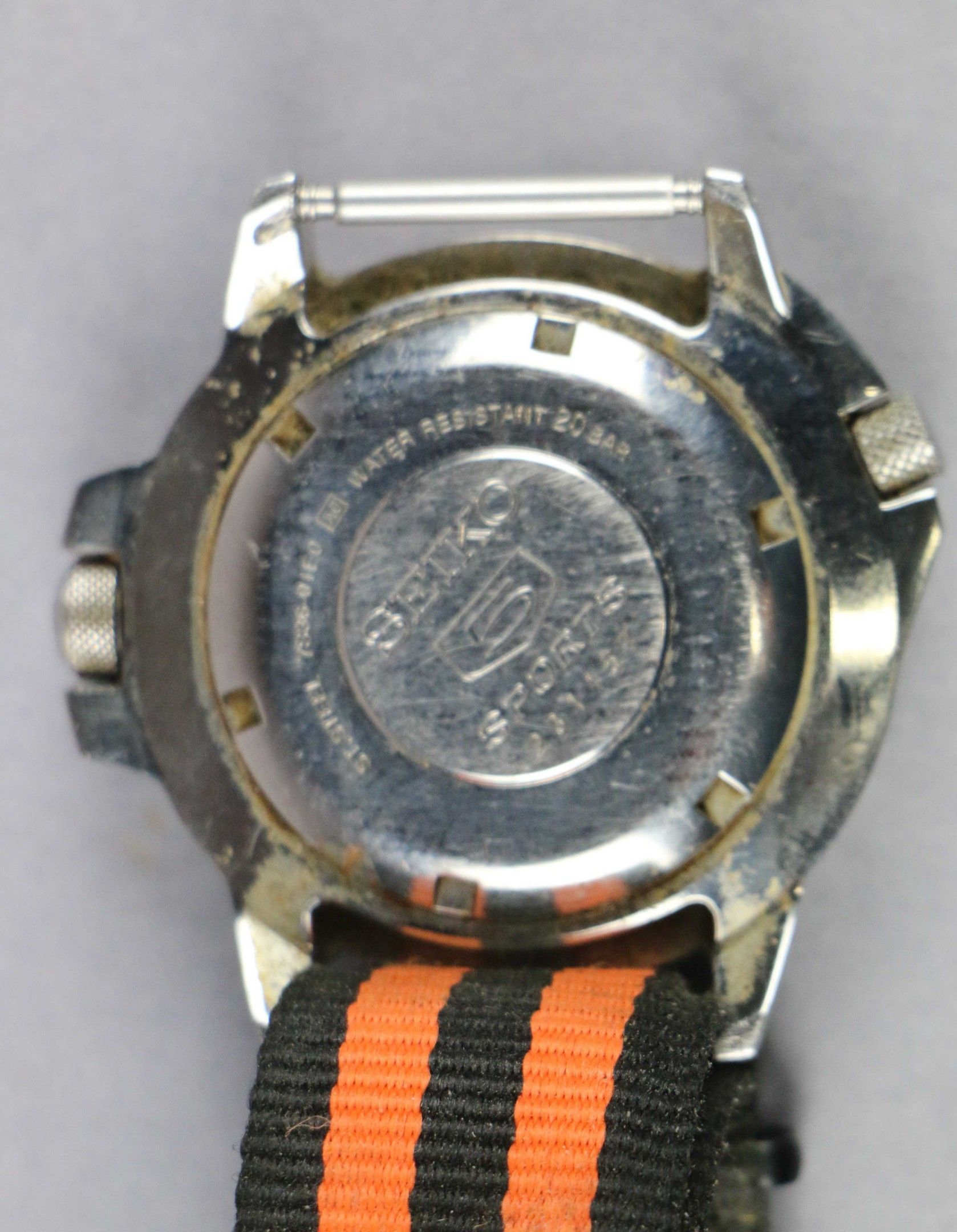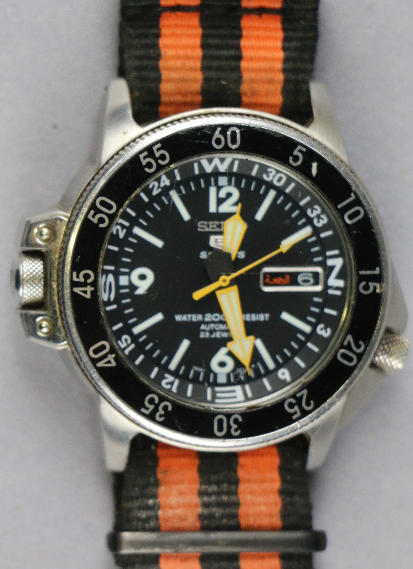 SEIKO: Men's WATCH model Seiko 5 Sports water resist 200m with steel case, rotating bezel, apparently functional automatic movement. Case 40 mm. With fabric strap.