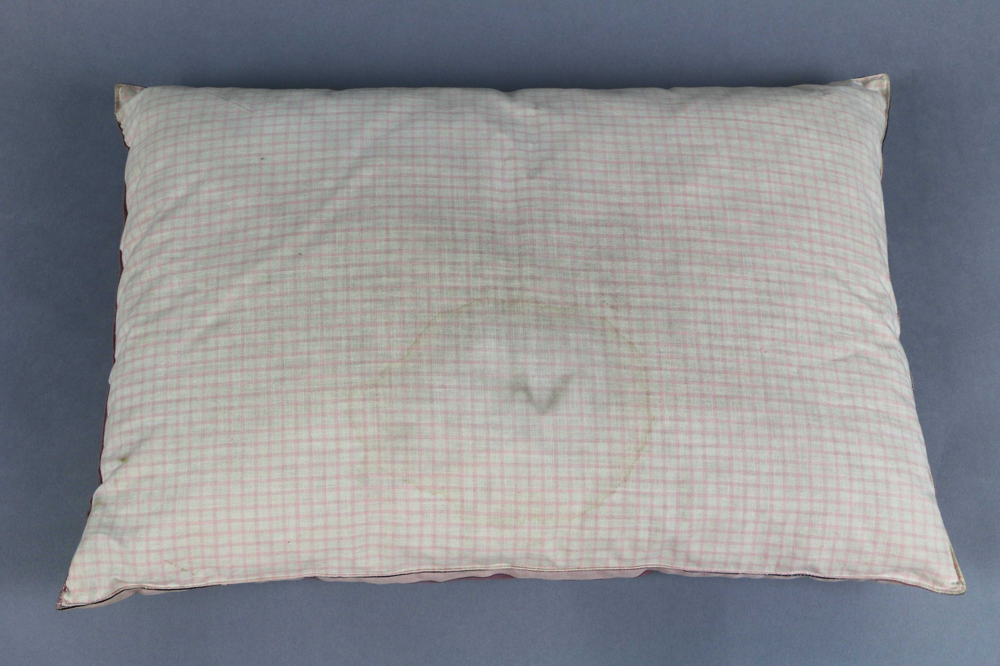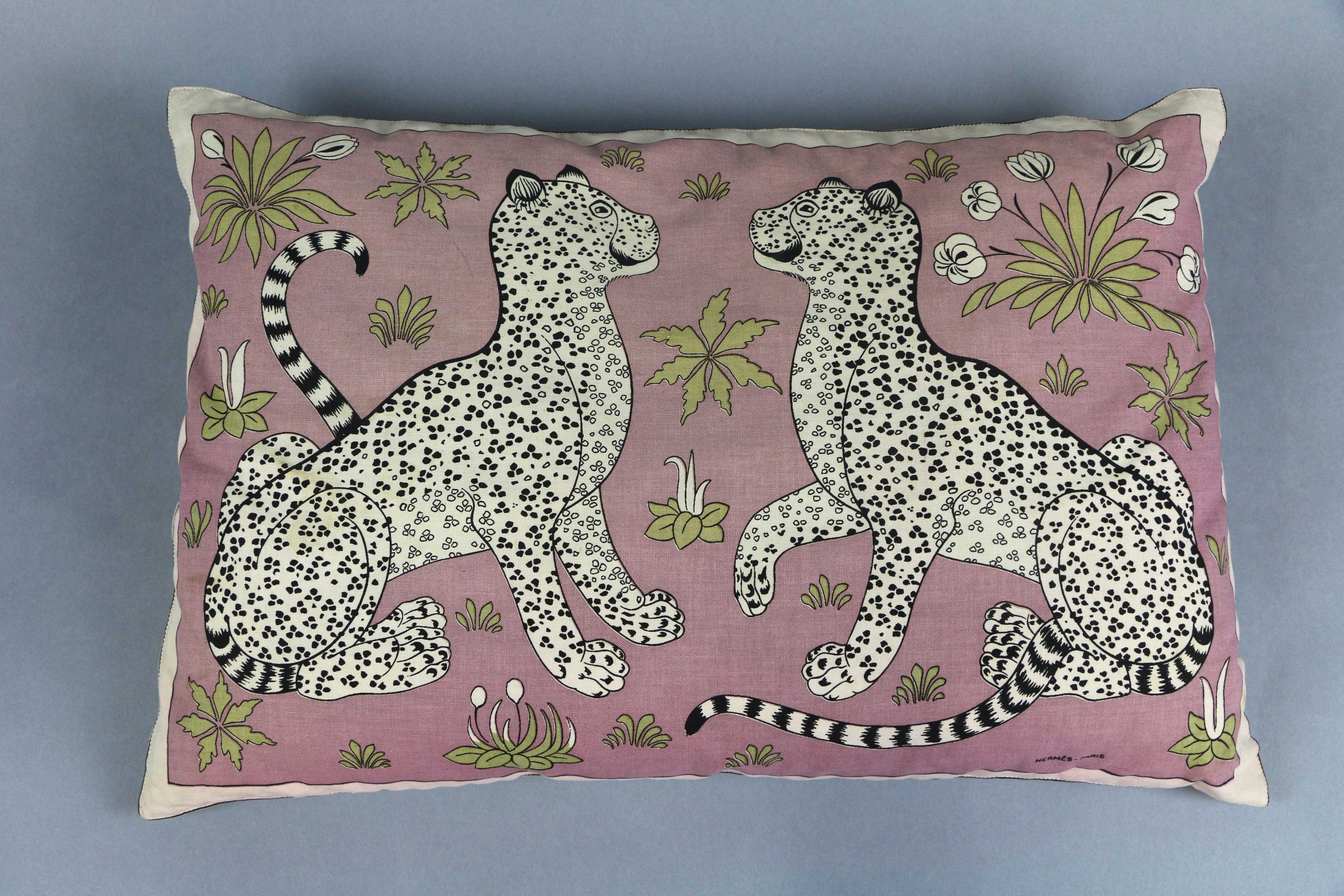 HERMES: CUSHION in pink canvas decorated with two leopards.
