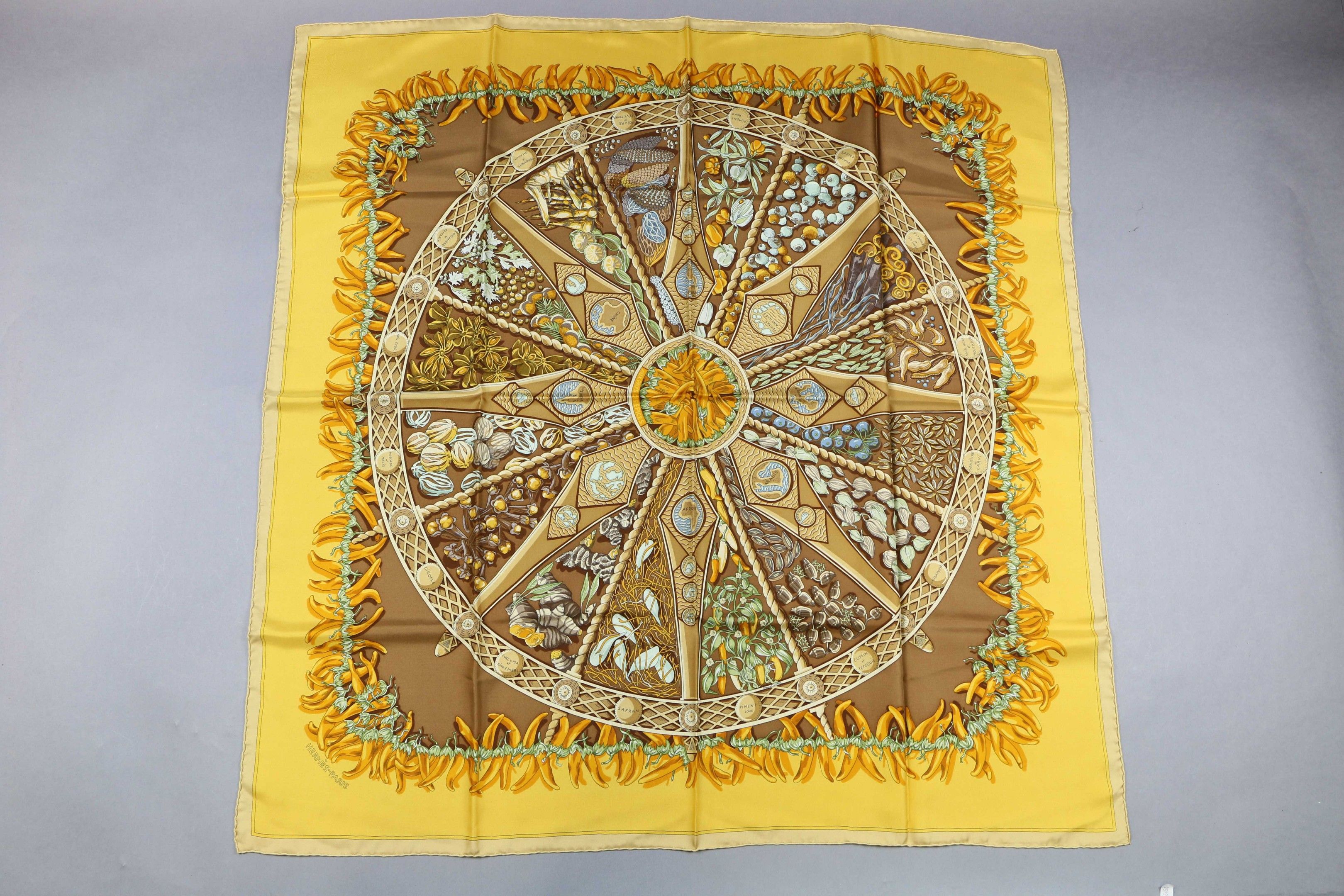 HERMES Paris : Square silk twill FOULARD model "Au Pays des Epices" on a yellow background designed by Annie Faivre.