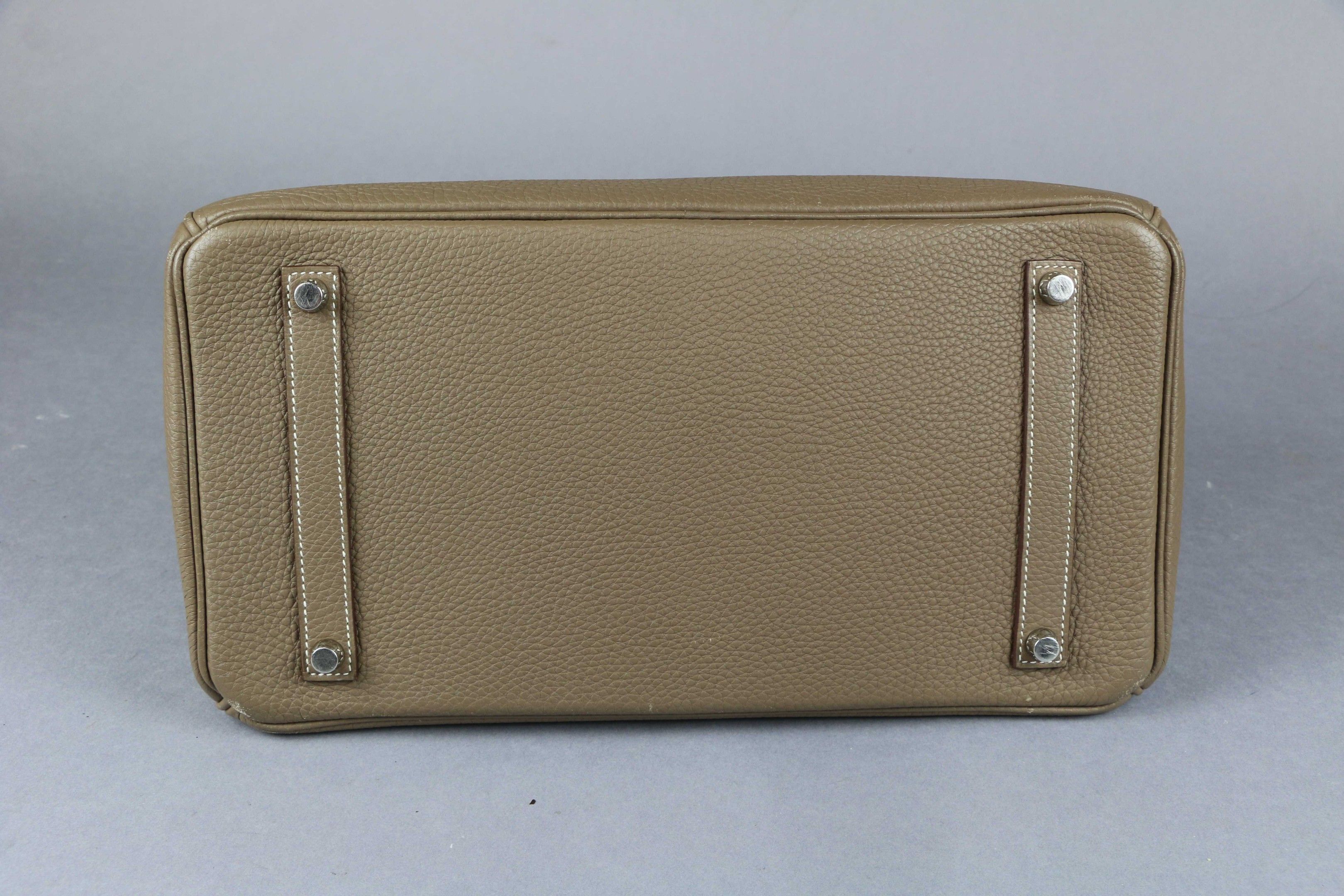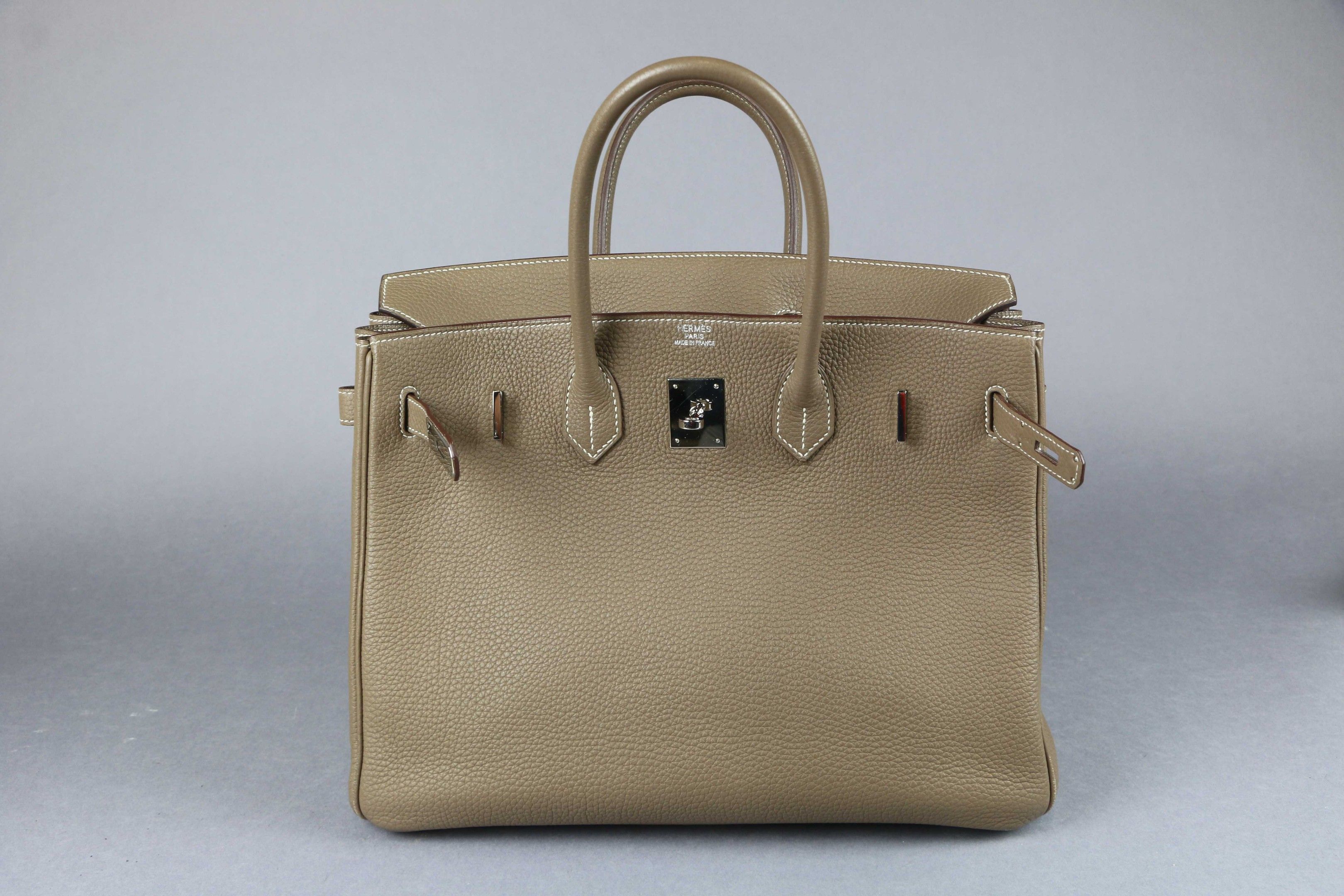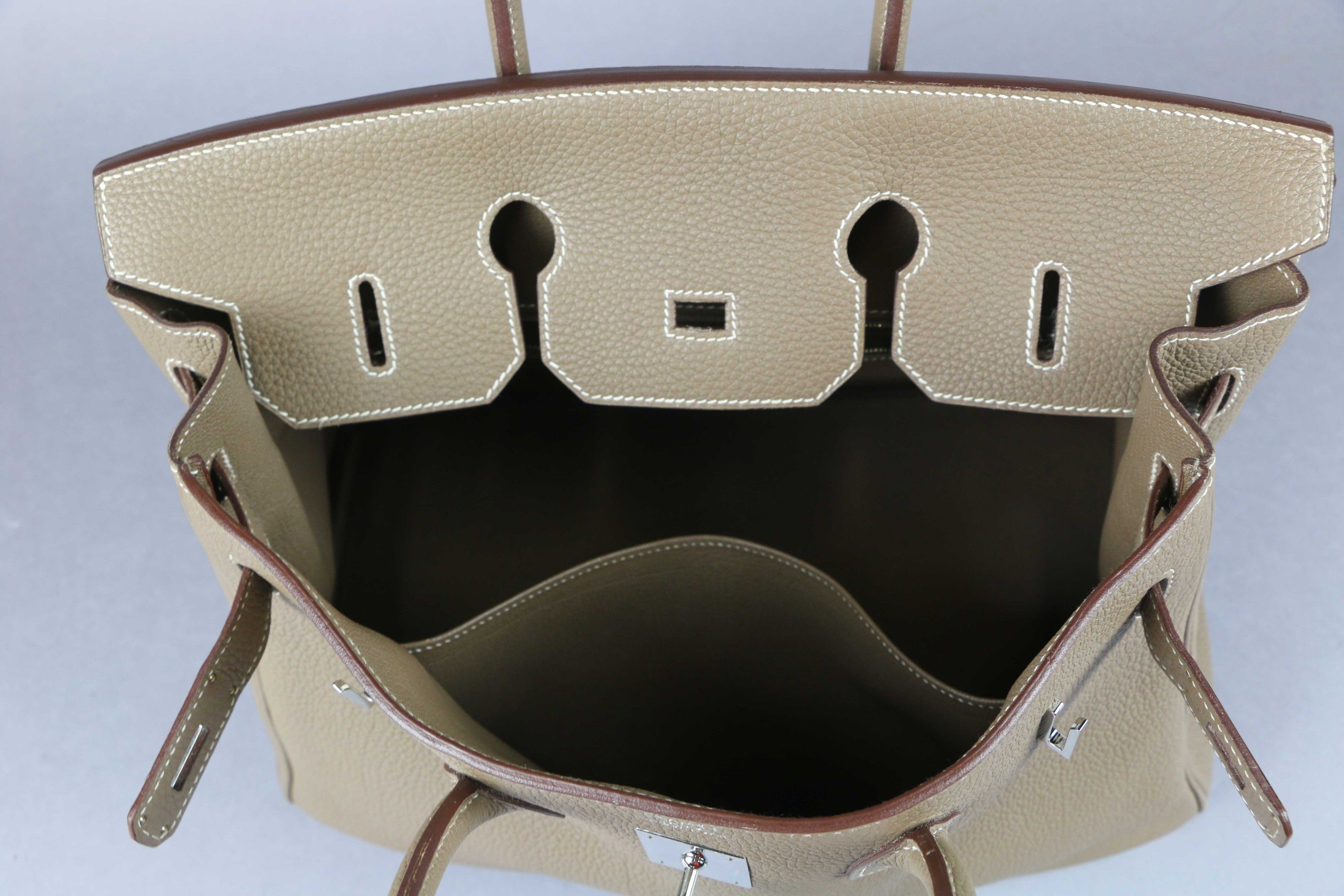 HERMES: "Birkin" model handbag in taupe Clémence taurillon leather with white topstitching, silver-tone palladium-plated metal jewellery, double handles, bell keys and padlock. Inside, a zipped pocket opposite a patch pocket.