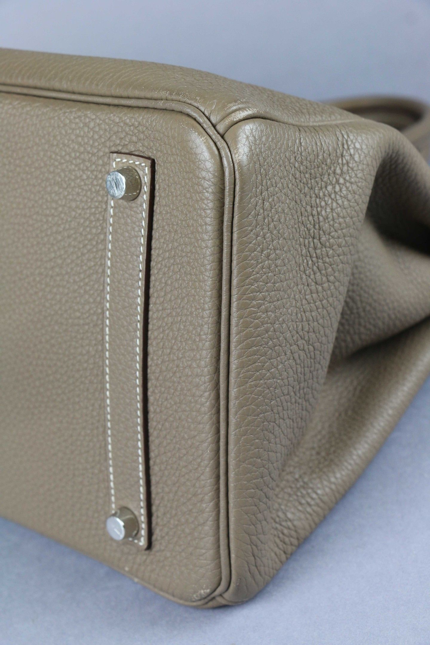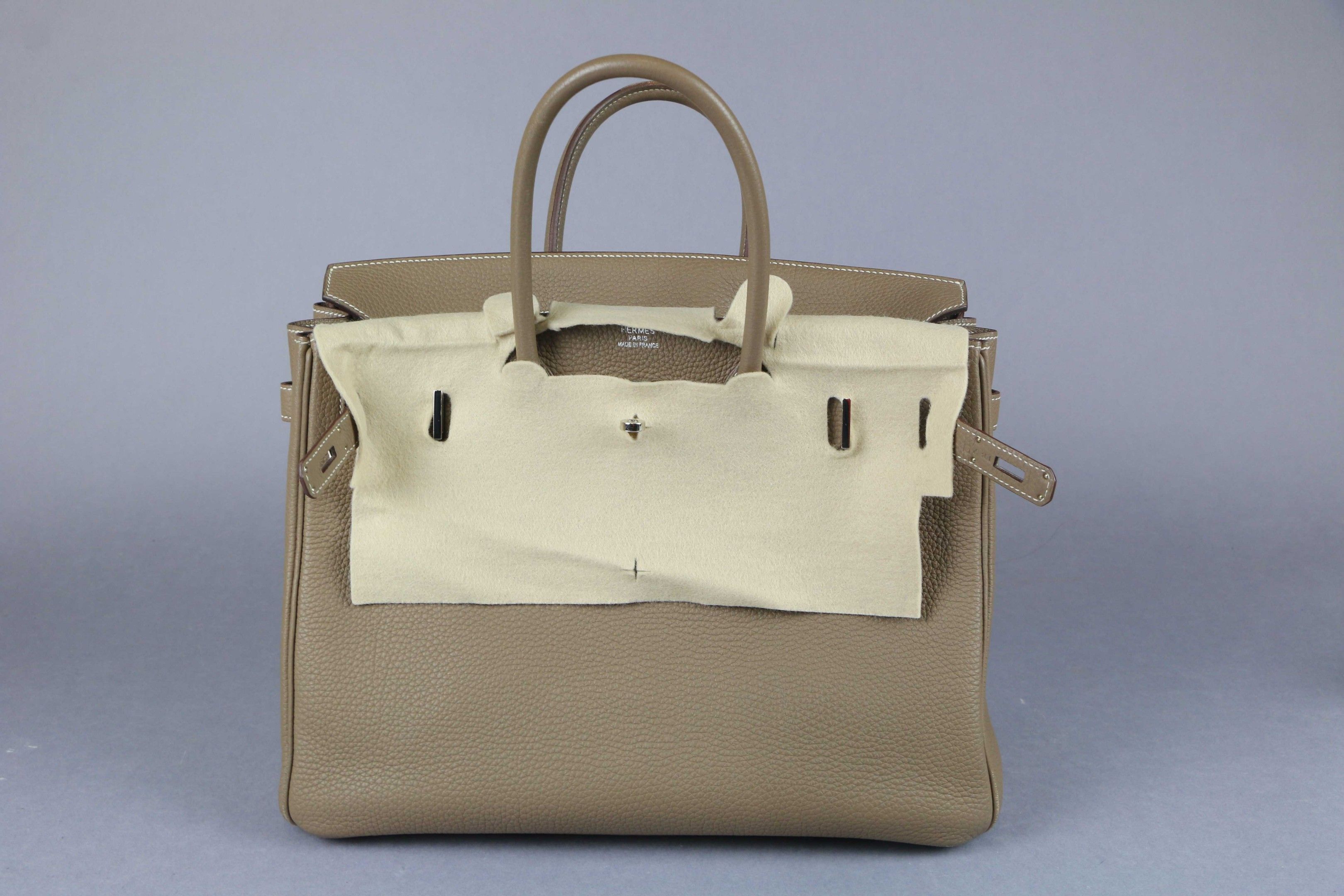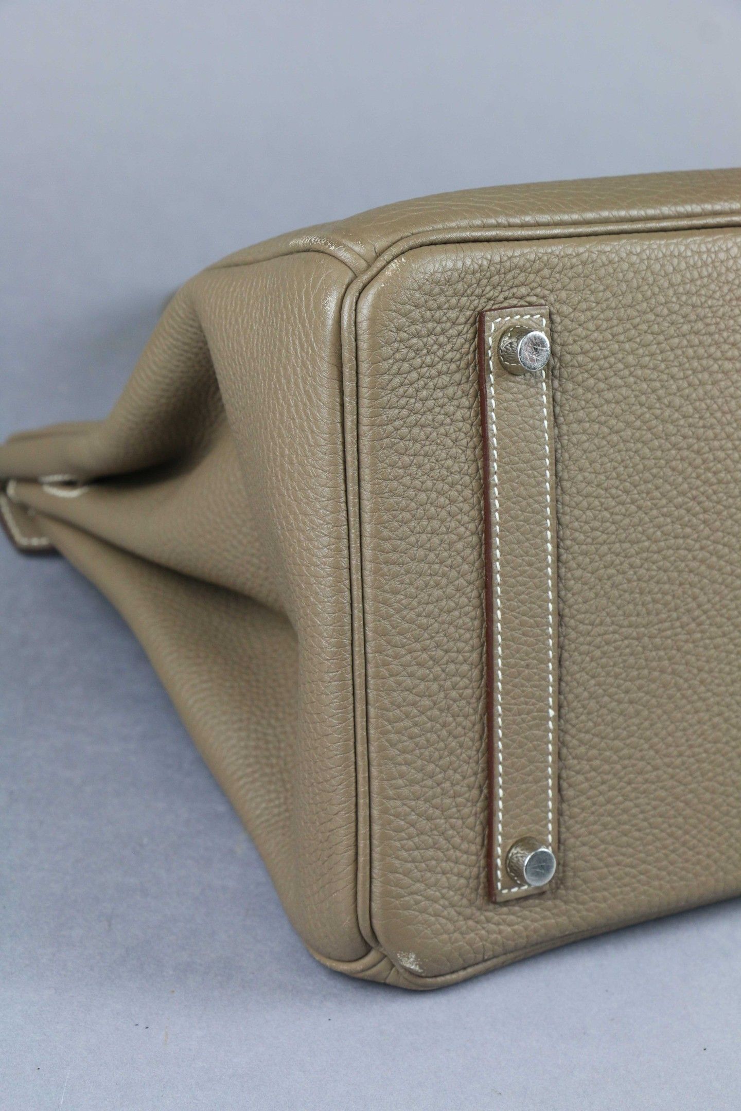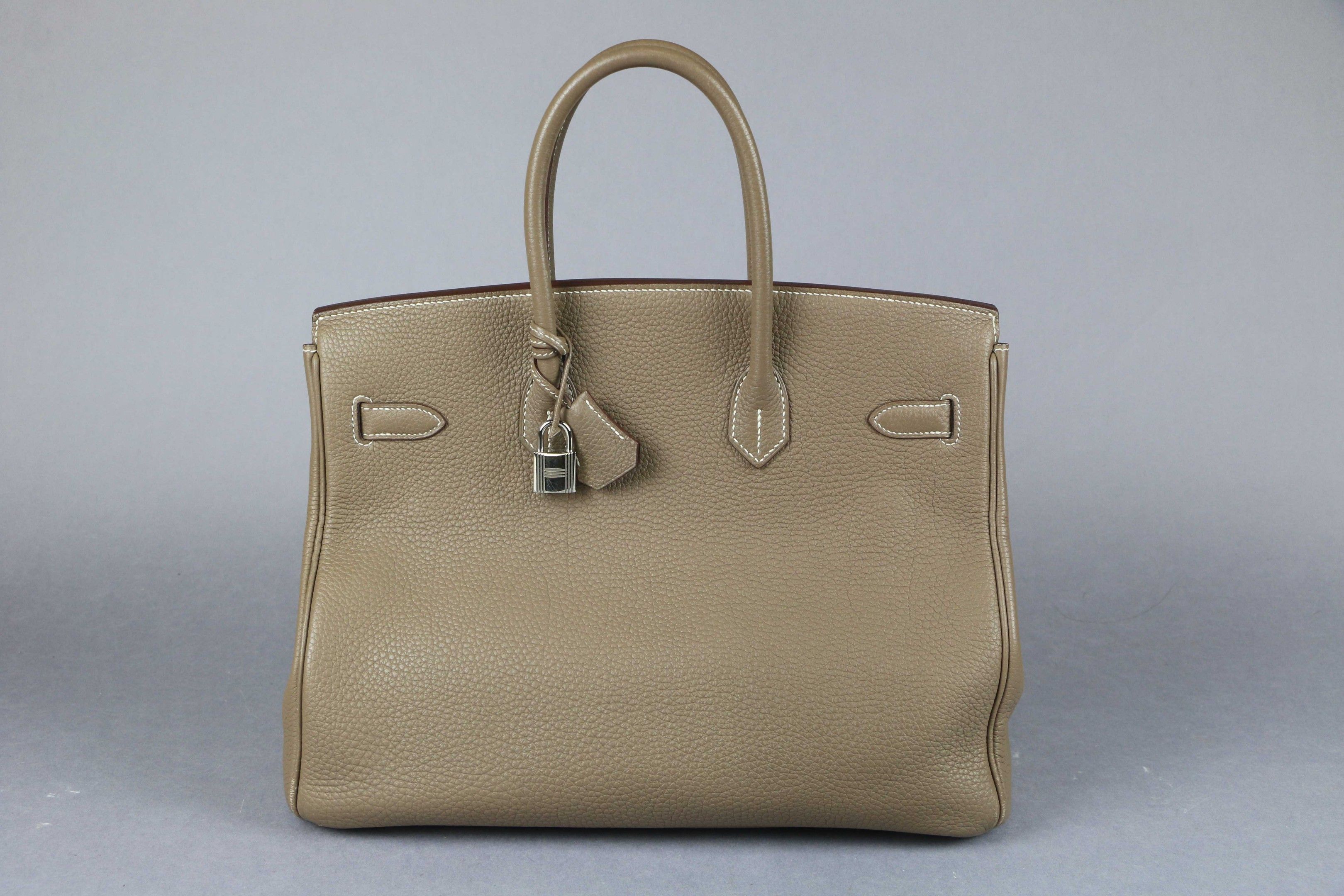 HERMES: "Birkin" model handbag in taupe Clémence taurillon leather with white topstitching, silver-tone palladium-plated metal jewellery, double handles, bell keys and padlock. Inside, a zipped pocket opposite a patch pocket.