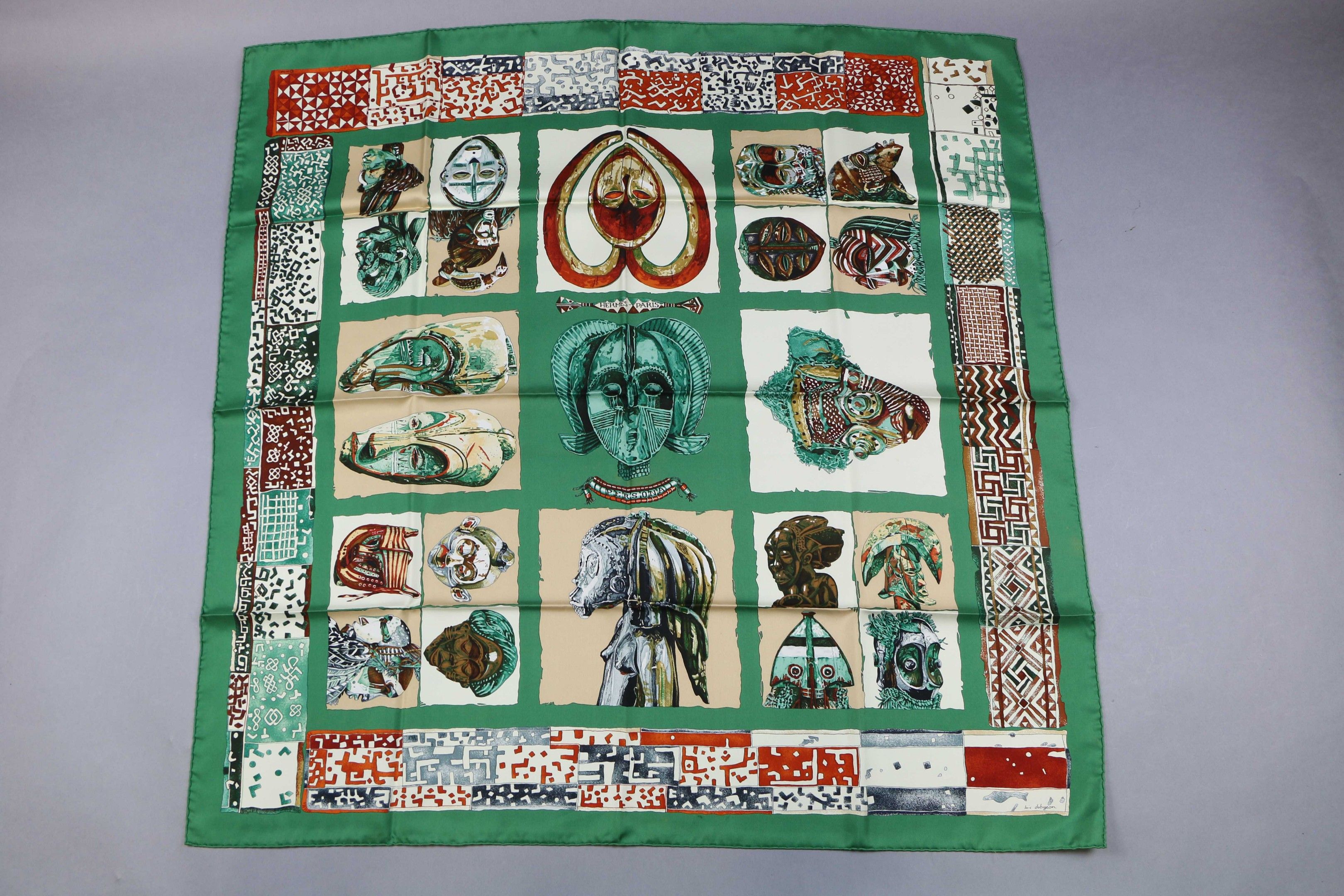 HERMES Paris : Square silk twill FOULARD "Persona" model after Loïc Dubigeon.