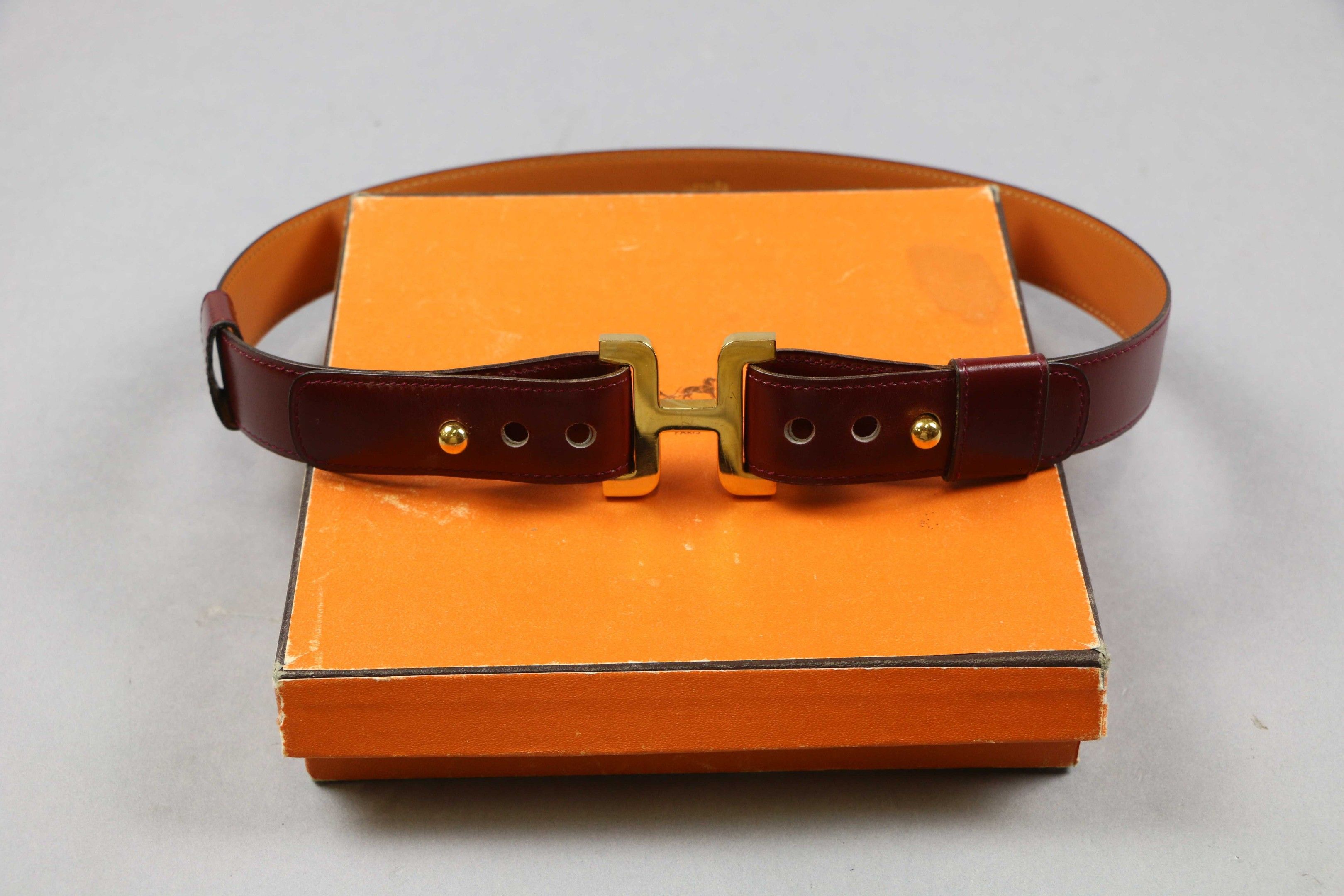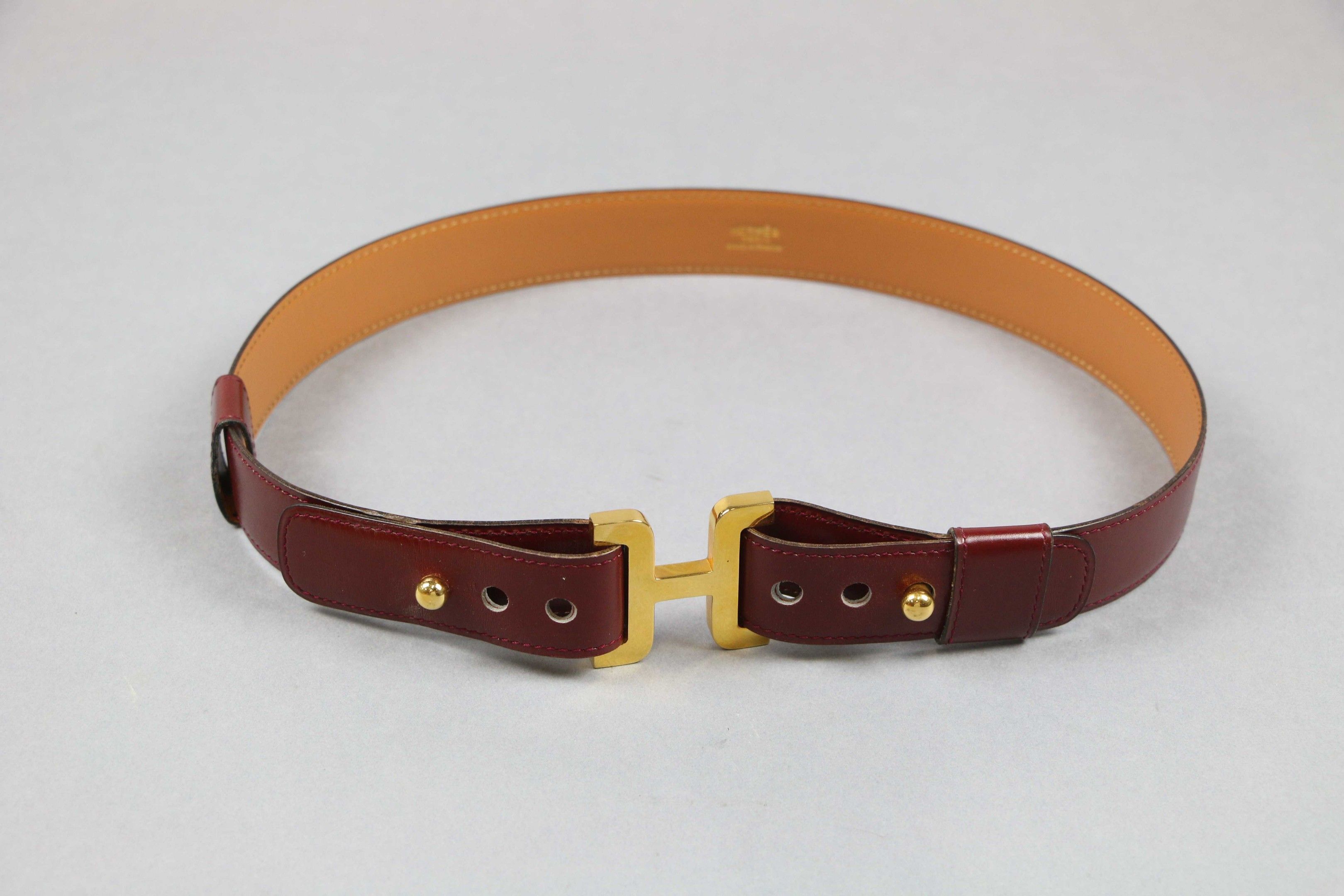 HERMES Paris : Burgundy leather BELT with gilt metal buckle.…
