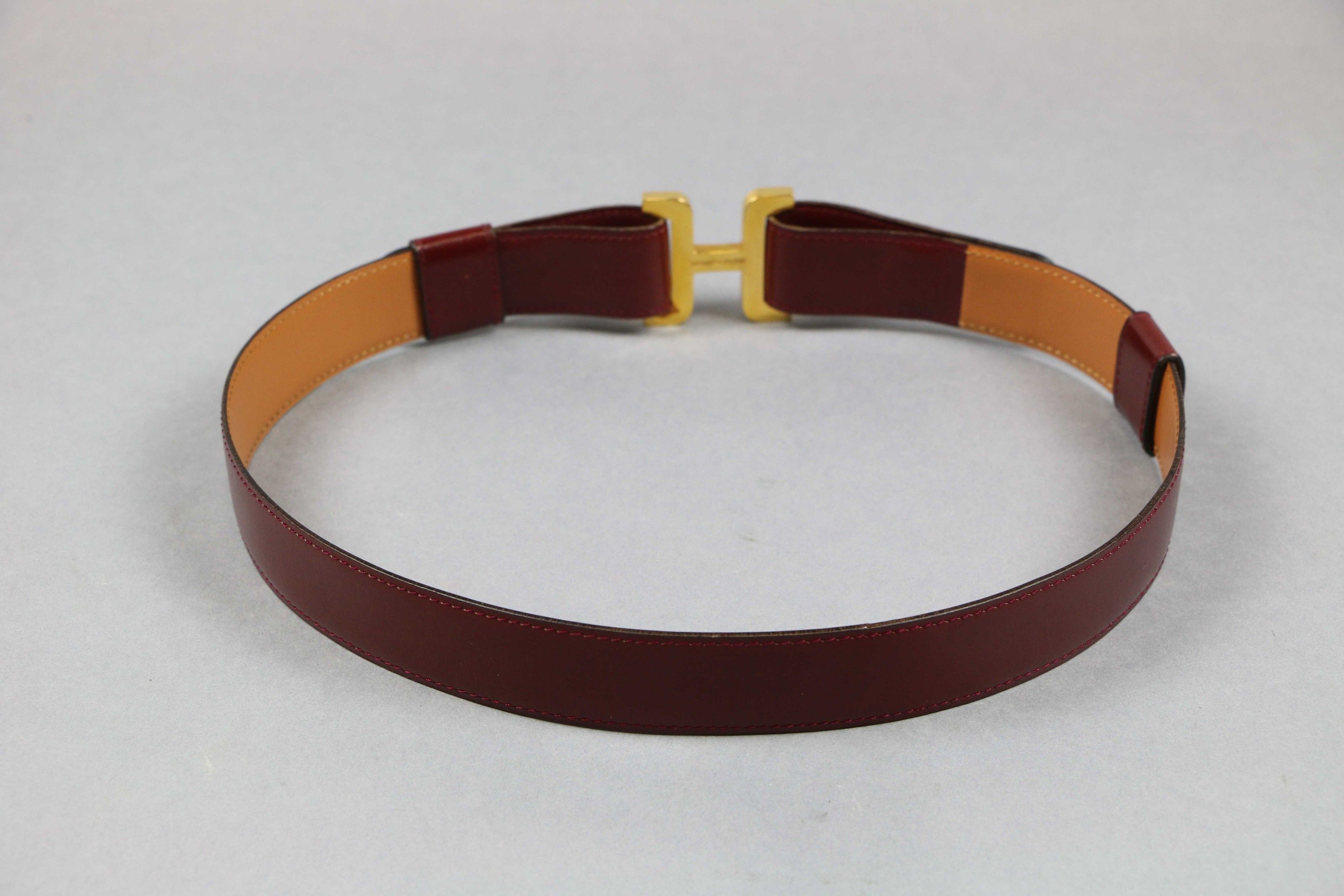 HERMES Paris : Burgundy leather BELT with gilt metal buckle. In its box.
