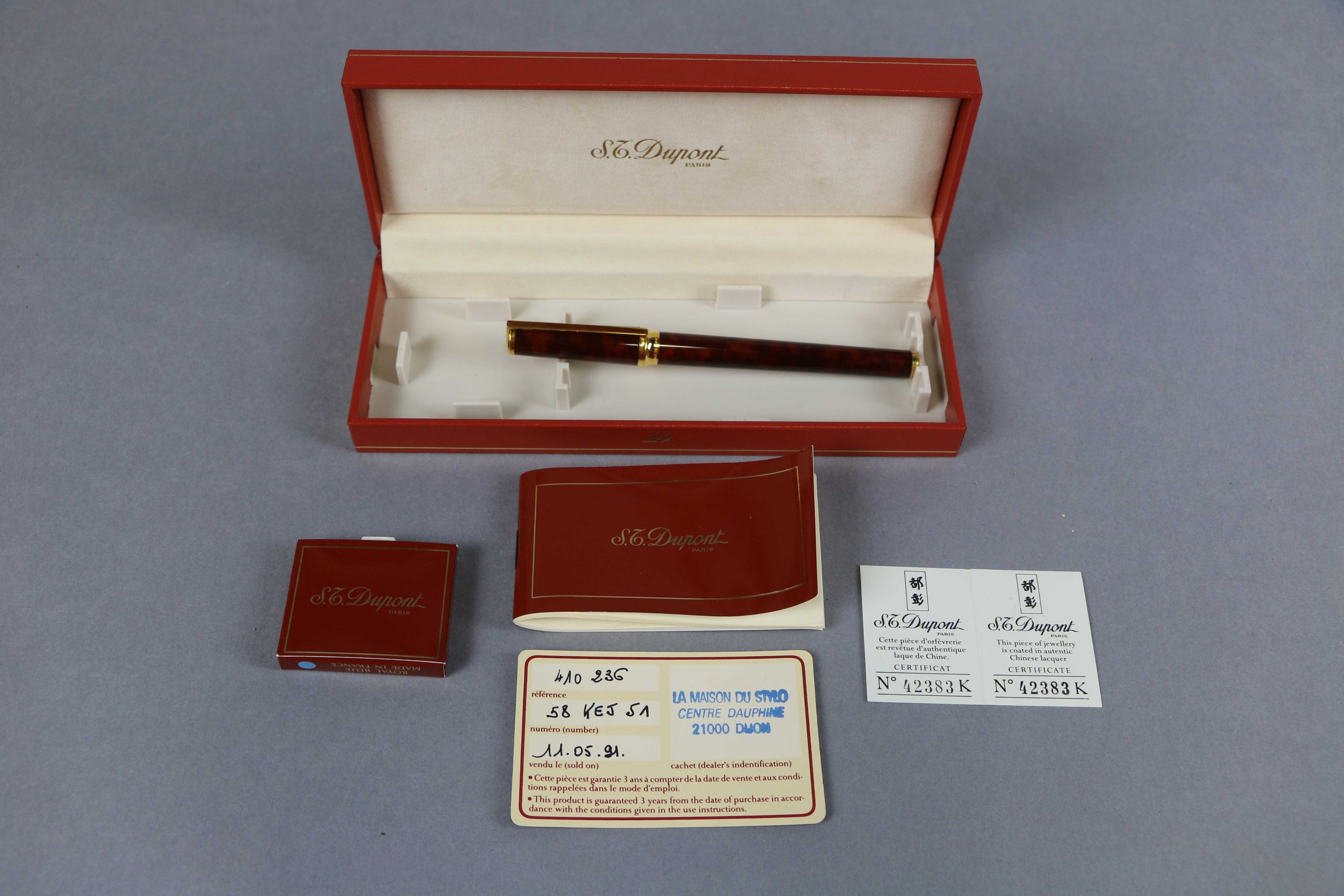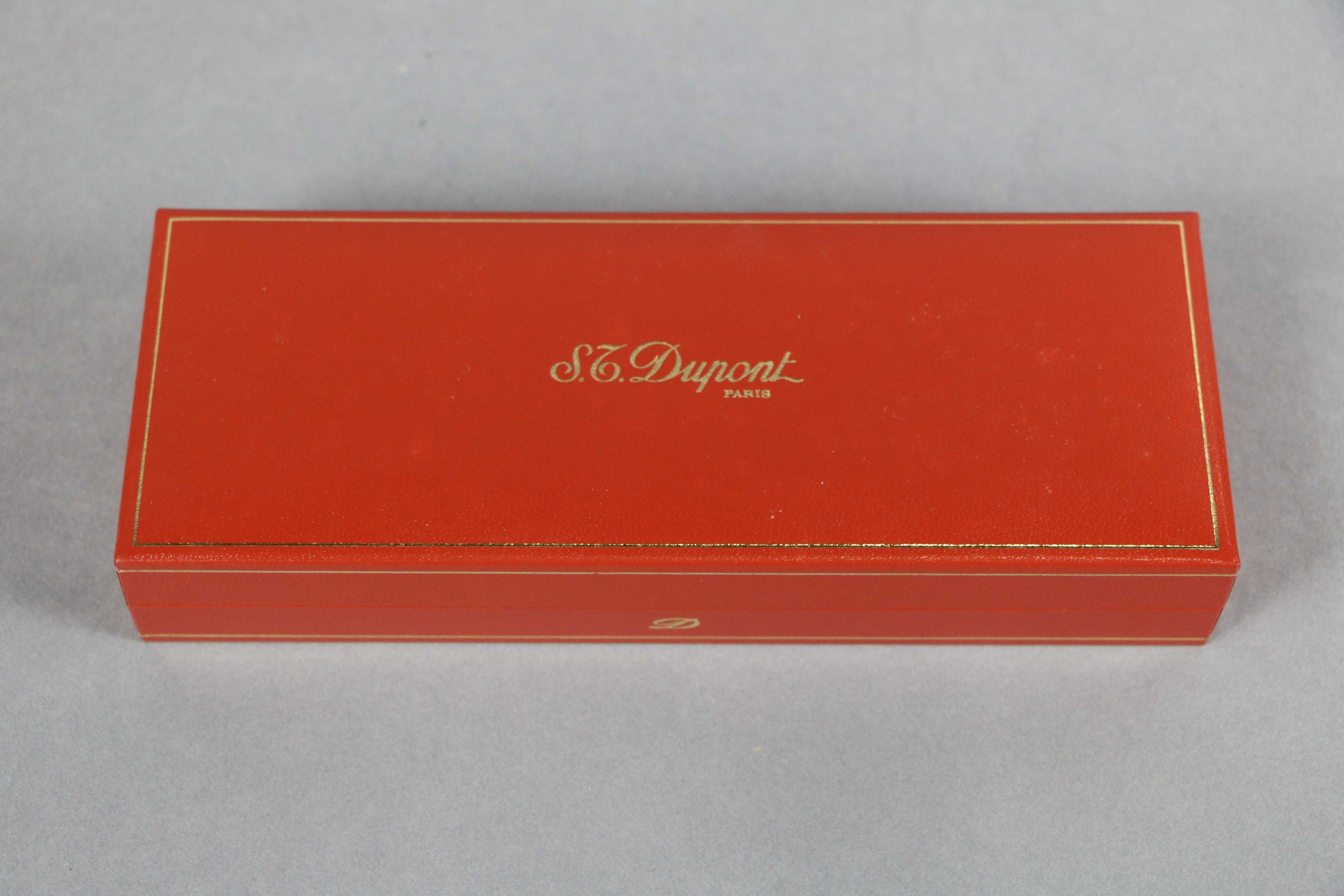 S.T. DUPONT. Montparnasse" model fountain pen in gilt metal with lacquer decoration, the nib in 18 carat yellow gold. In its case with its papers (guarantee card and booklet).