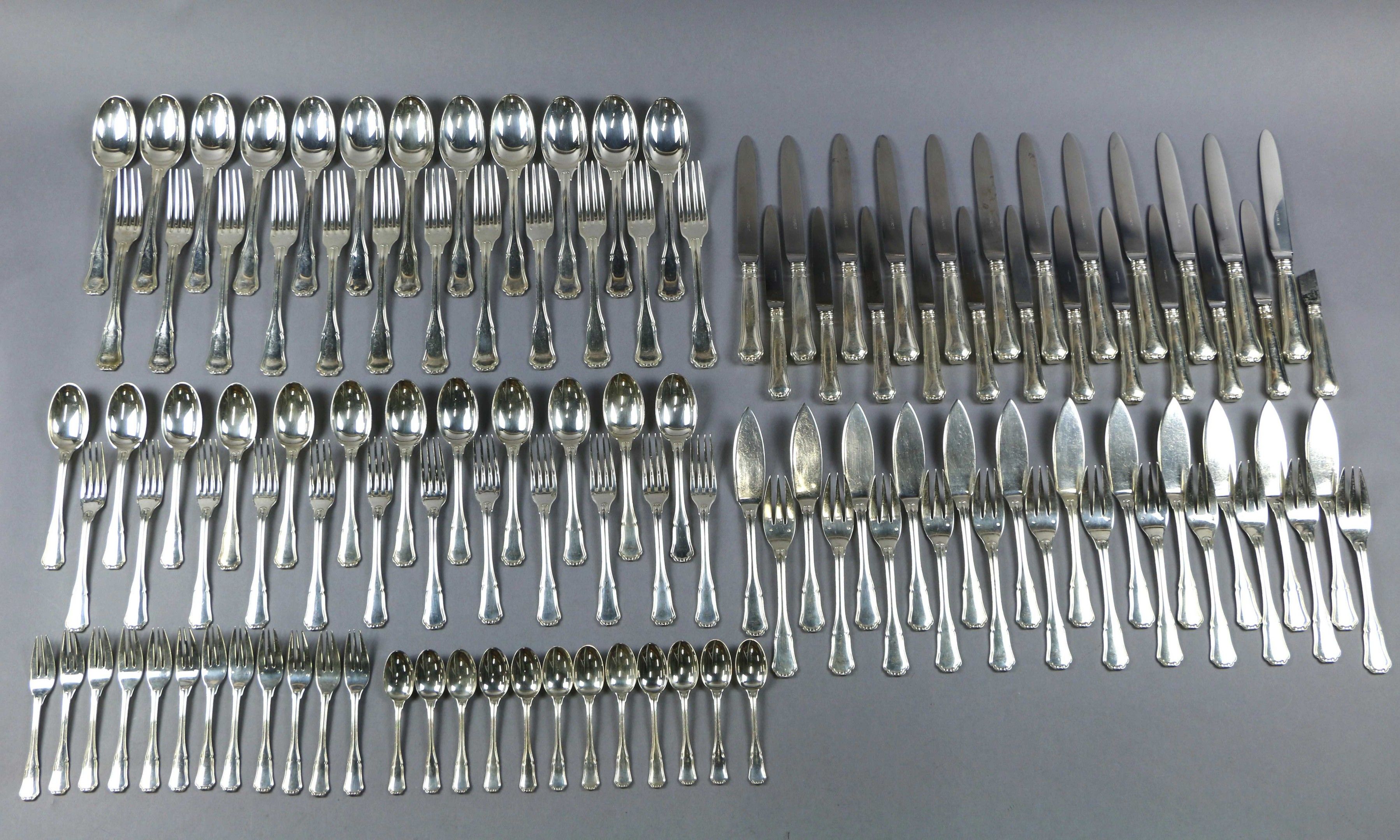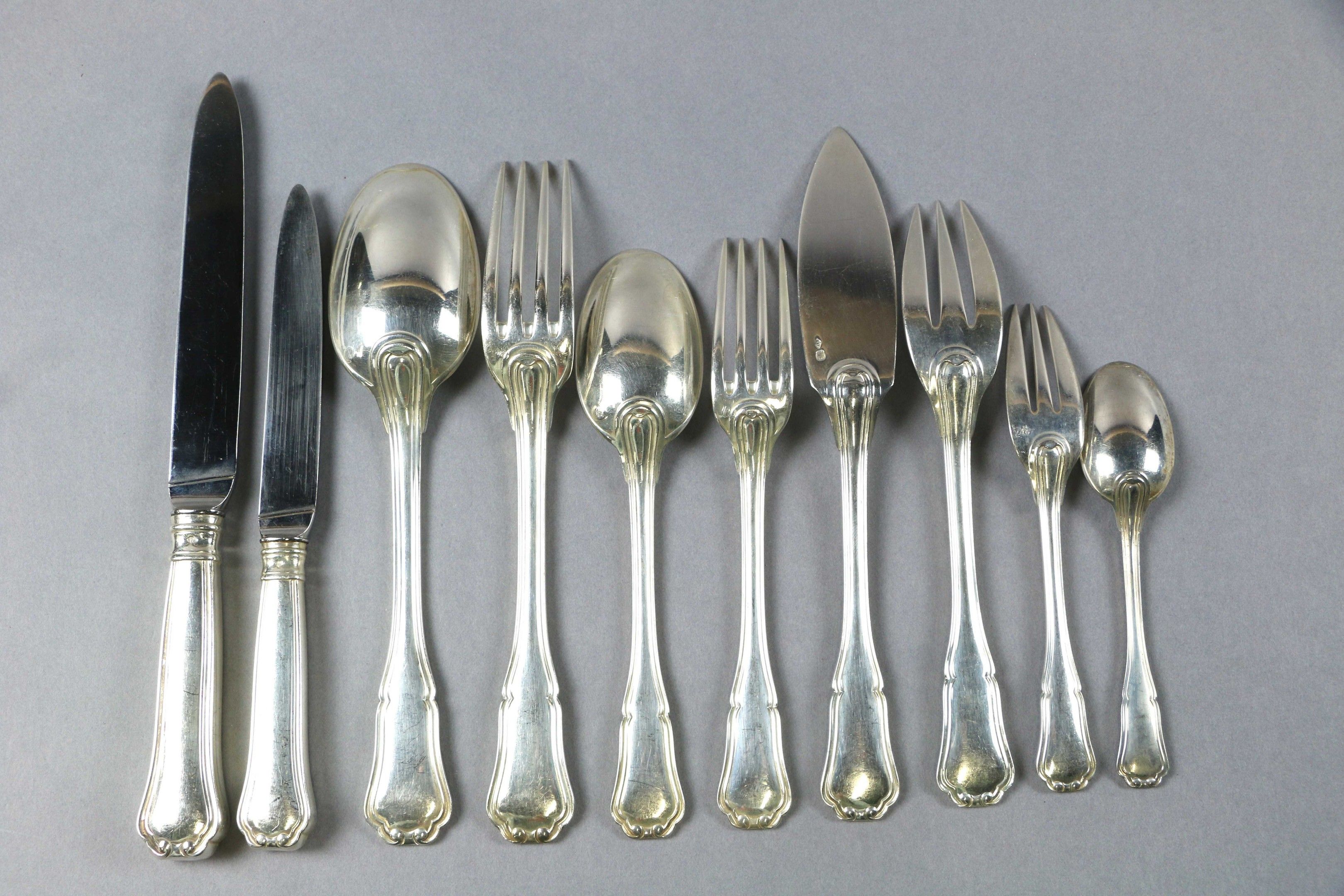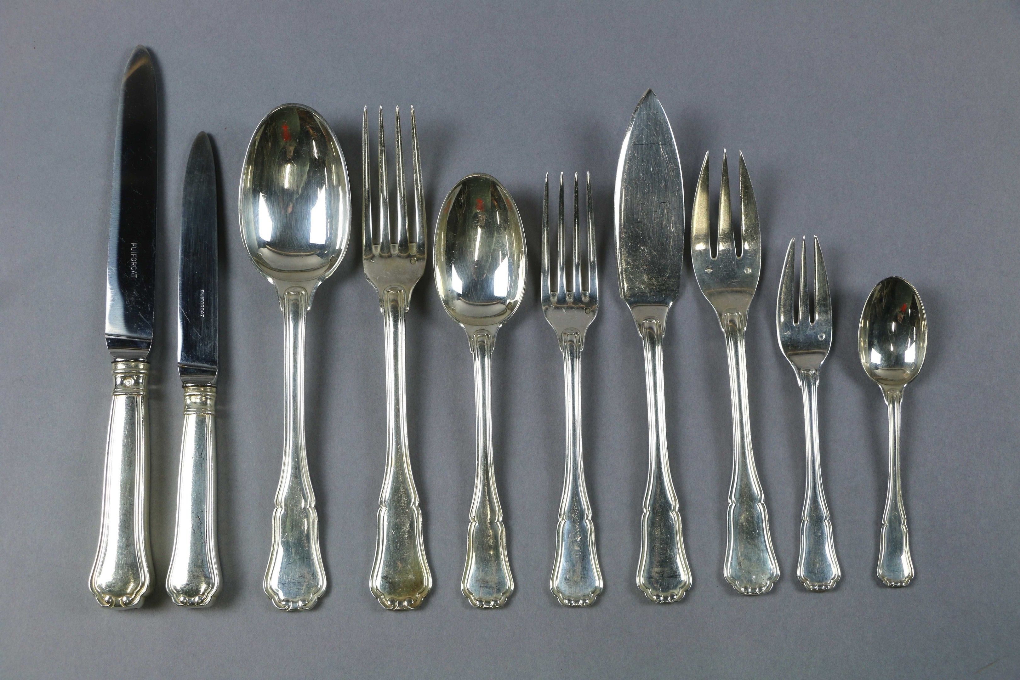 PUIFORCAT: A silver MENAGERE in the filet and contour pattern comprising twelve large place settings, twelve dessert sets, twelve fish sets, twelve dessert forks, twelve teaspoons, twelve large knives and twelve dessert knives (one blade broken) with forged silver handles.