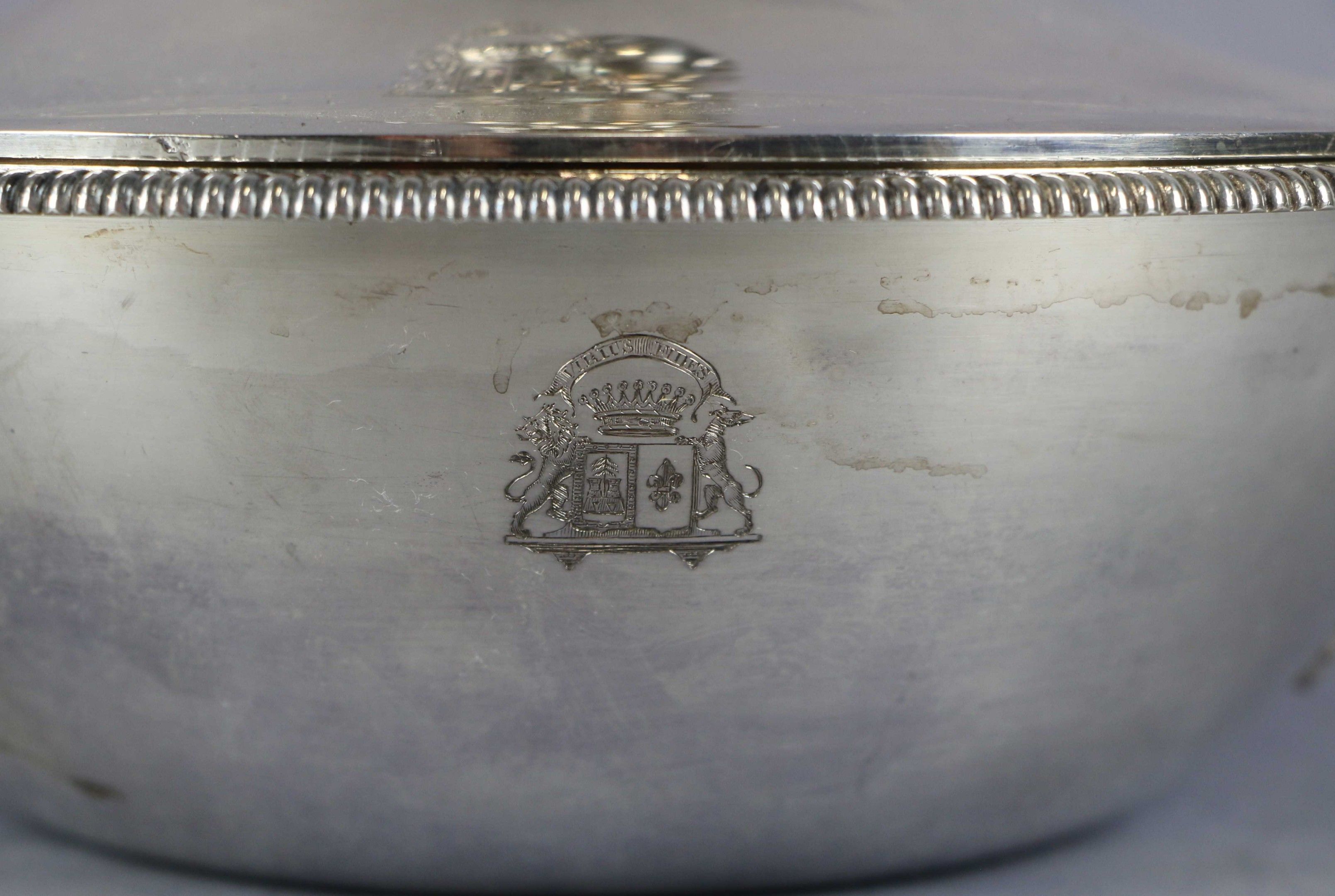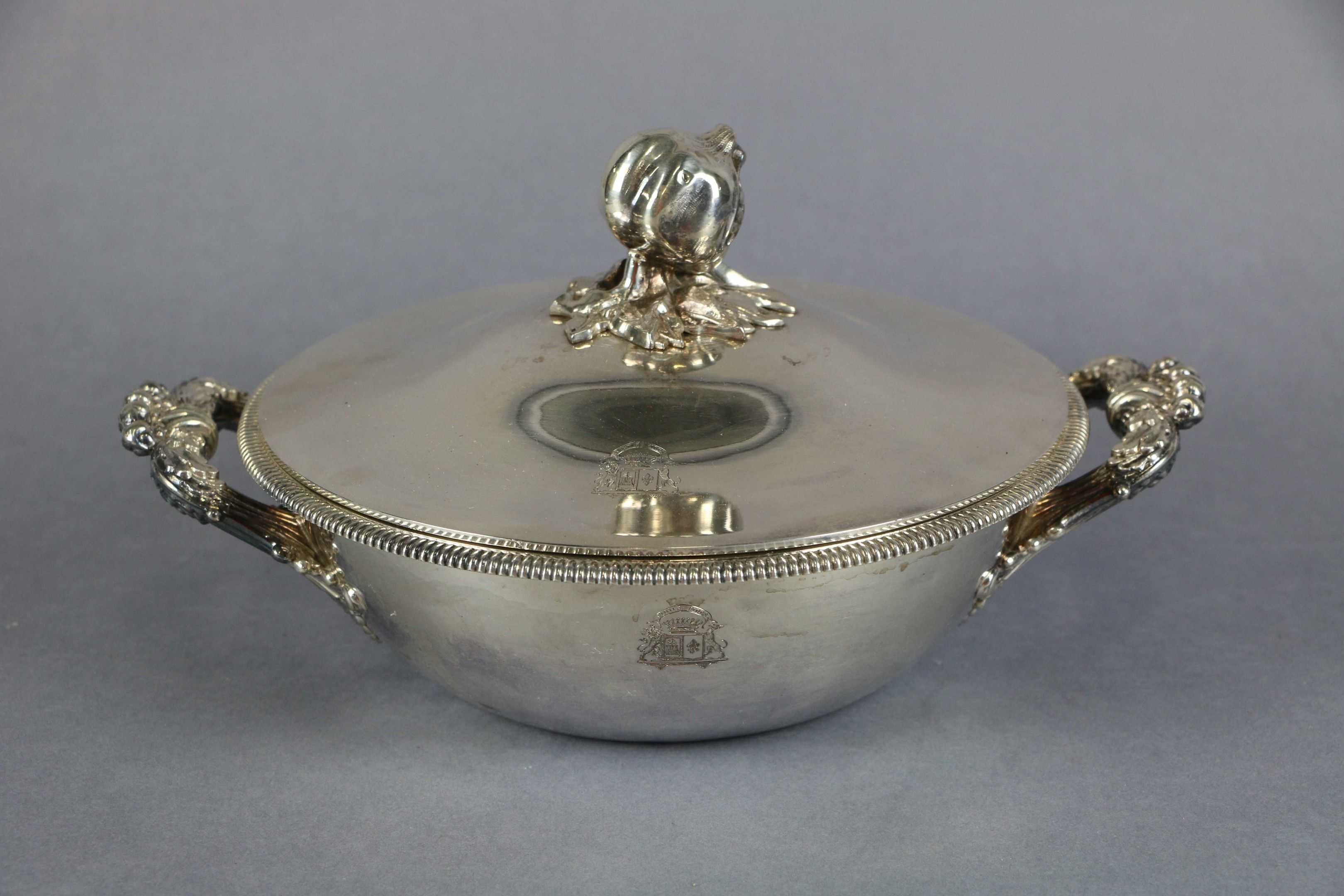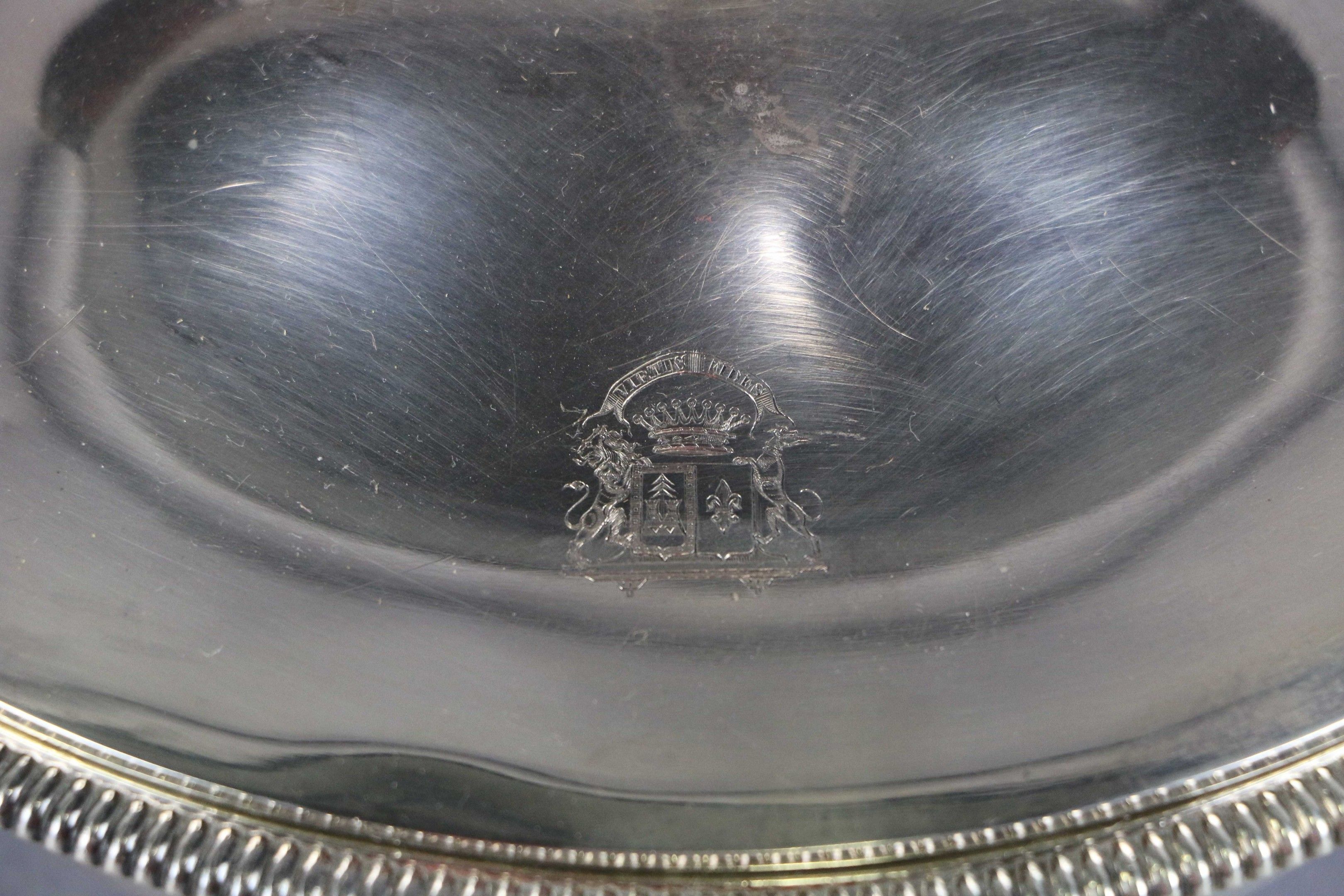 A silver LEGUMIER with a flat base decorated with gadrooned fillets and leafy handles. The lid is engraved with a double coat of arms under a count's crown, the handle is in the shape of a pomegranate.