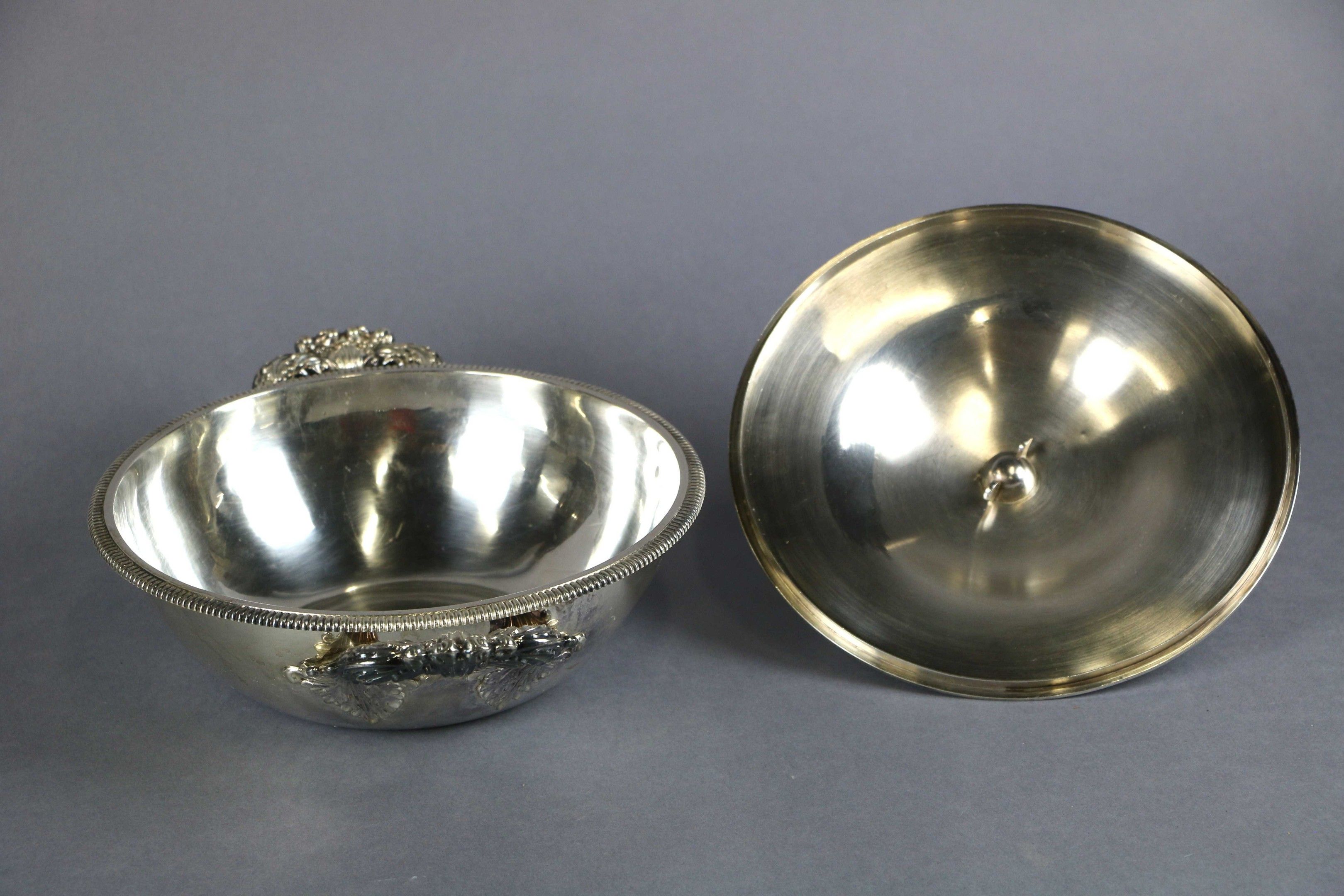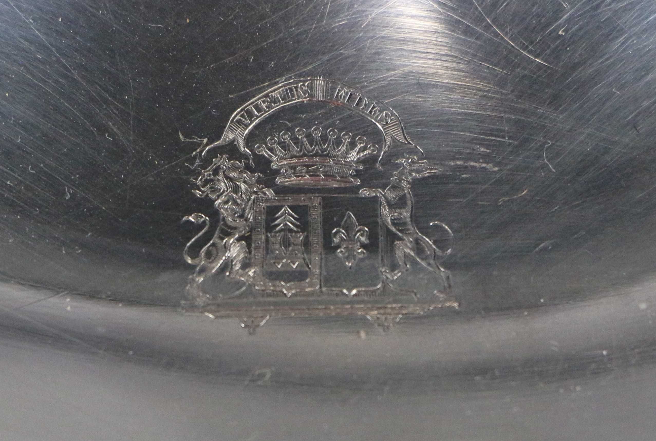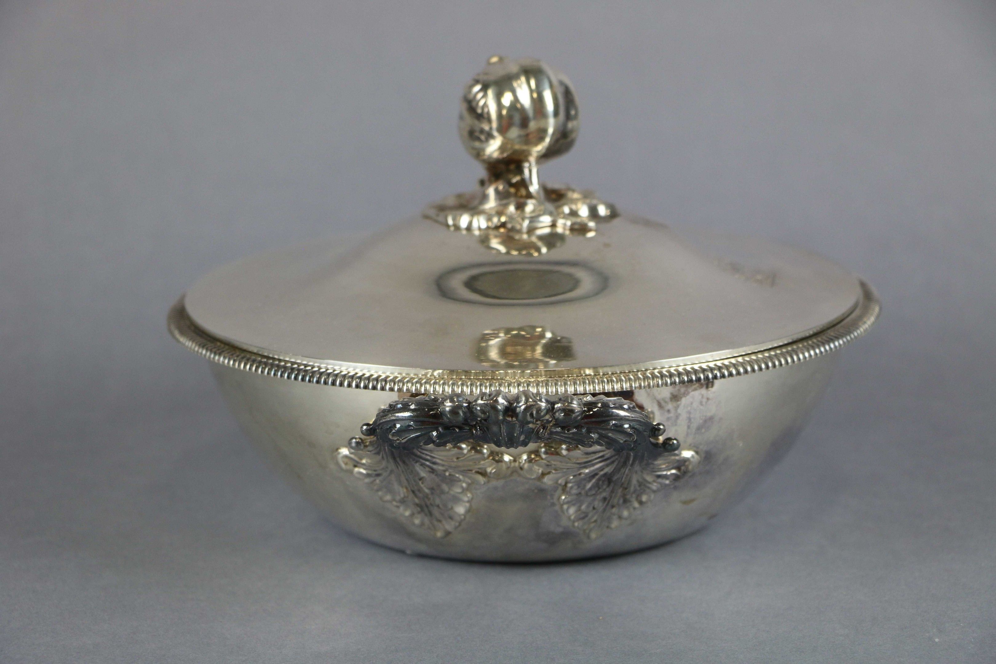 A silver LEGUMIER with a flat base decorated with gadrooned fillets and leafy handles. The lid is engraved with a double coat of arms under a count's crown, the handle is in the shape of a pomegranate.