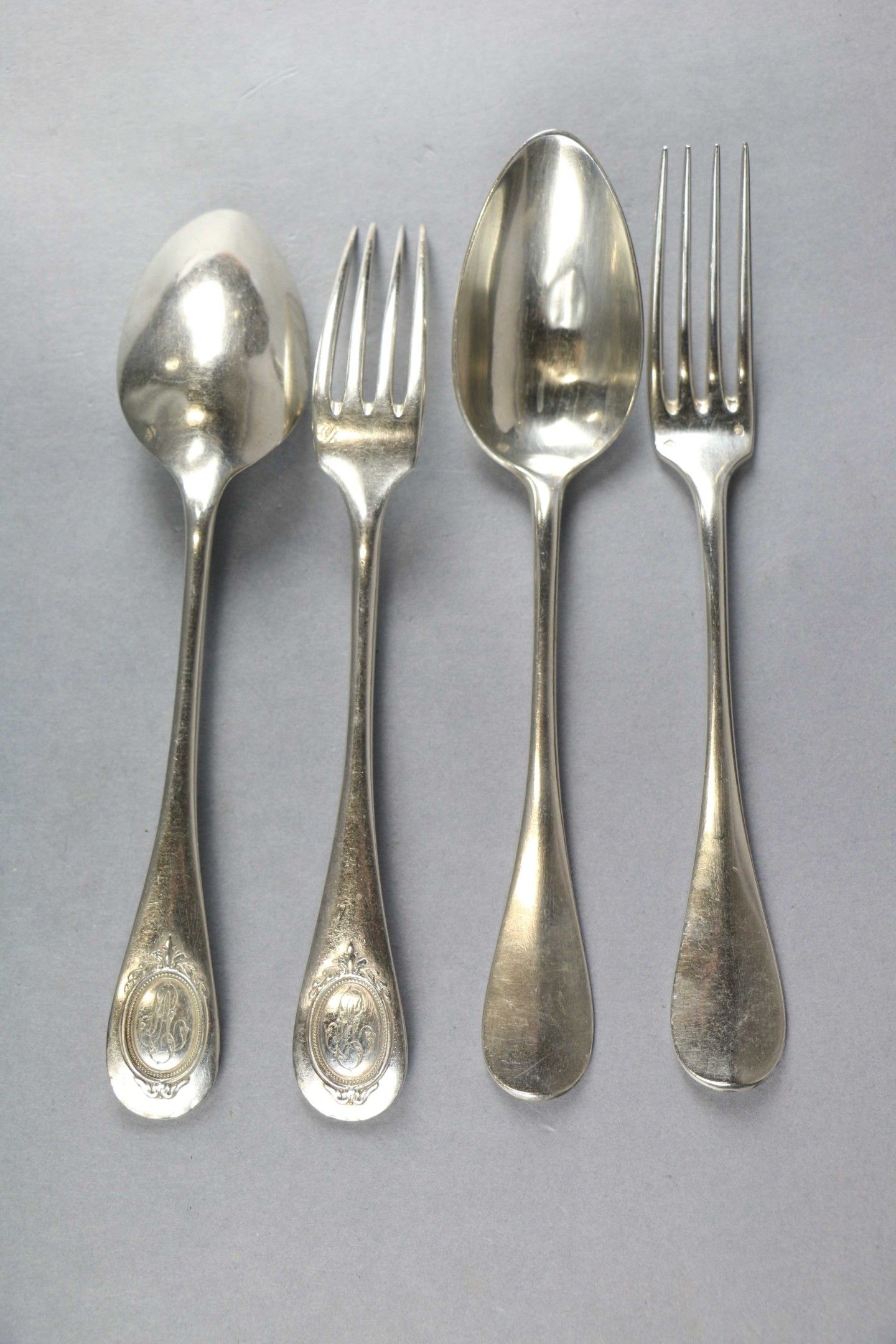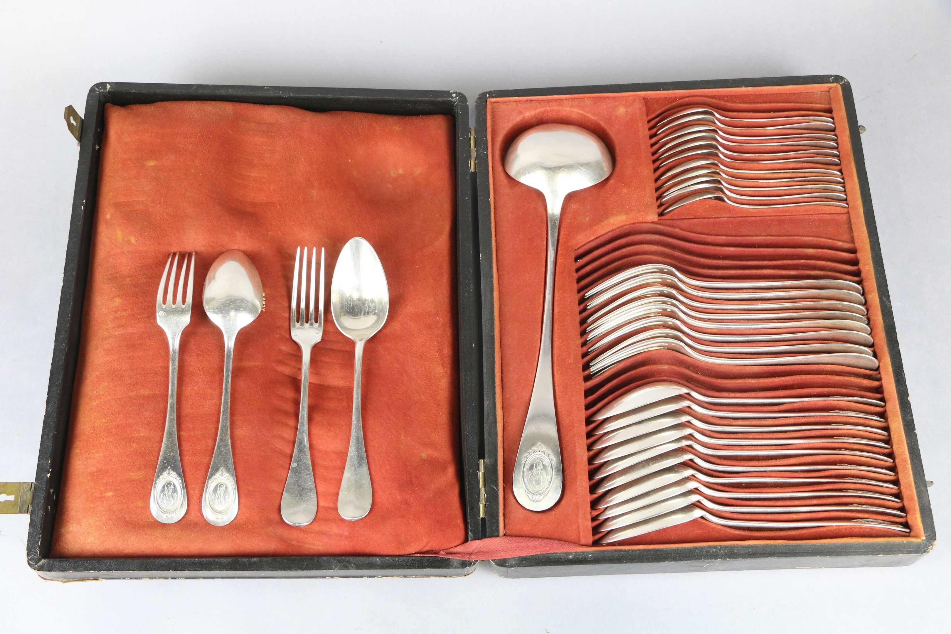 A silver MENAGERE of the baguette design with a monogrammed back decorated with foliate reserves, comprising ten large flatware pieces and two spoons, eleven teaspoons and a ladle. Minerve hallmark.