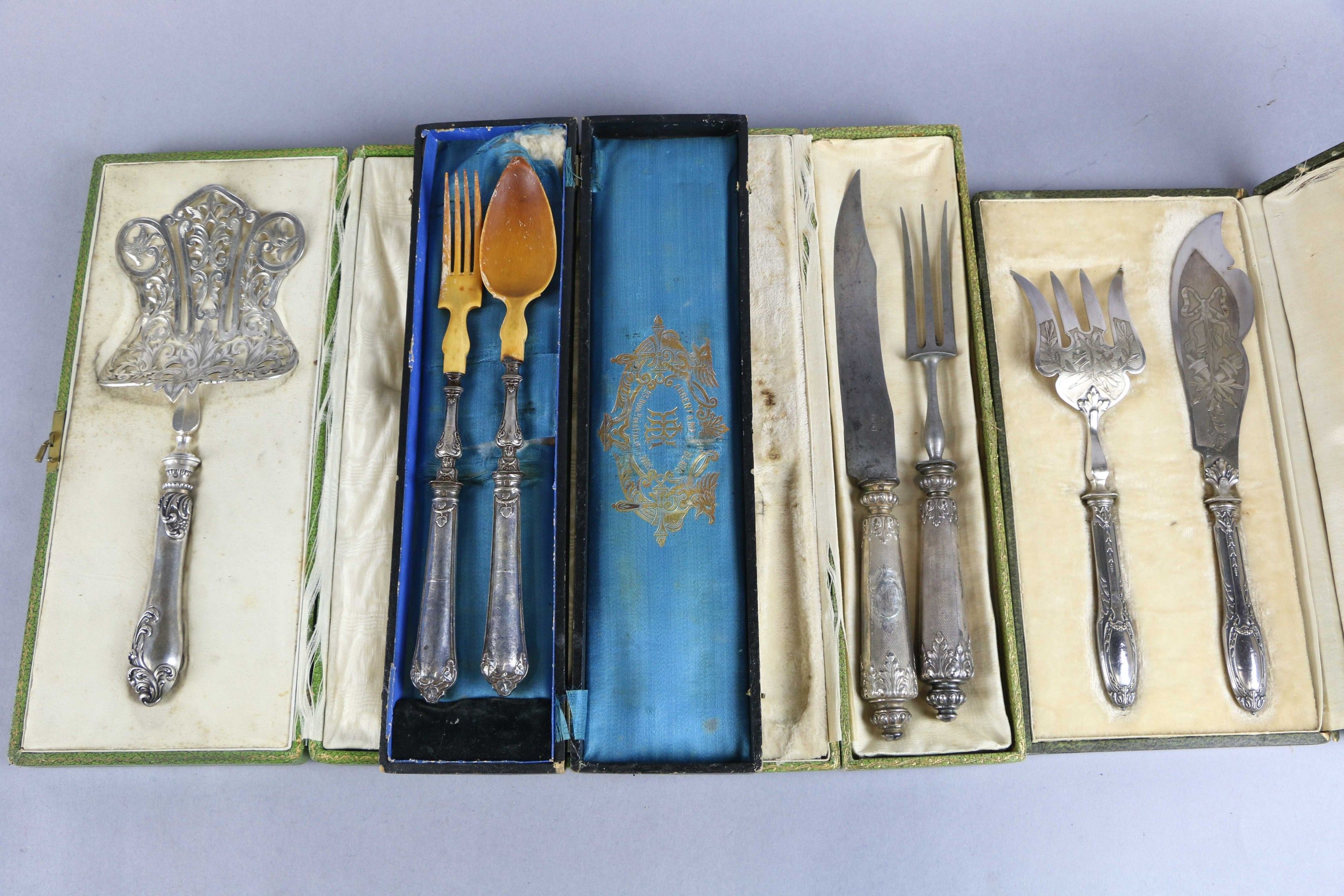 Set of silver service cutlery with handles, including fish cutlery, large serving spoon, salad cutlery and chopping set. In their cases (some wear marks).