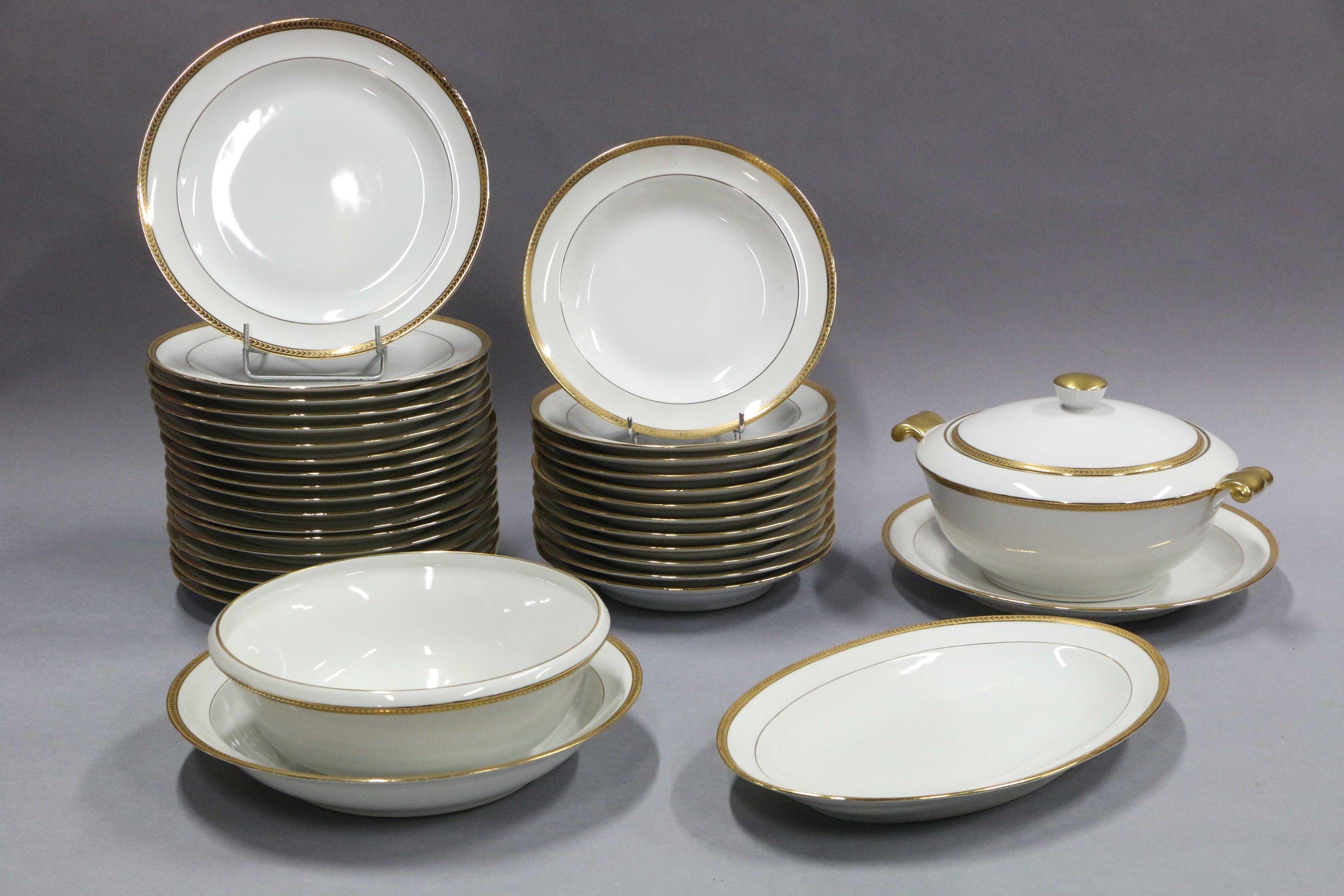 Part of a Cenpor Limoges porcelain TABLE SERVICE decorated with gold edging and vegetal friezes, comprising eighteen large plates, twelve soup plates, a tureen, a salad bowl and three Poral serving dishes.