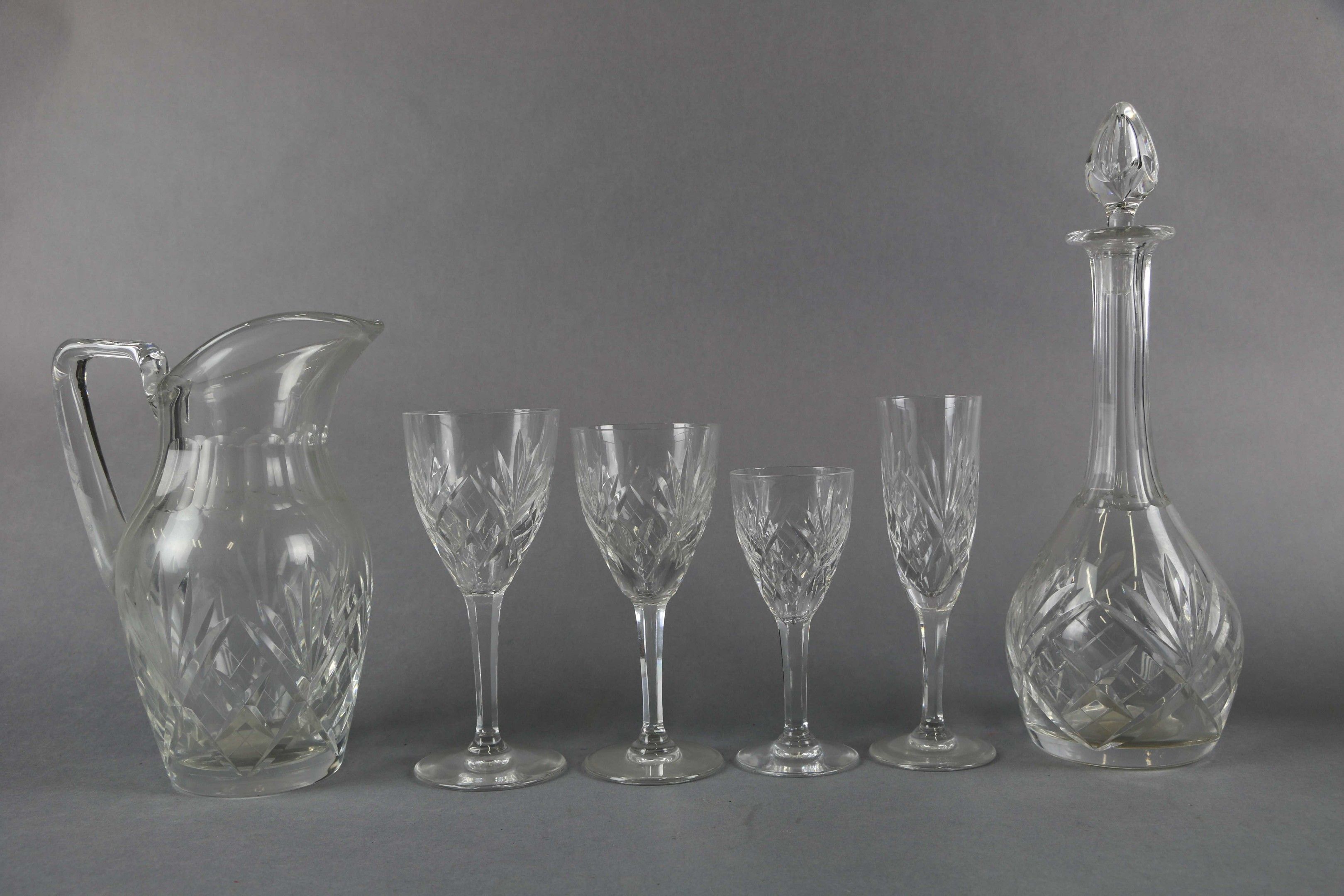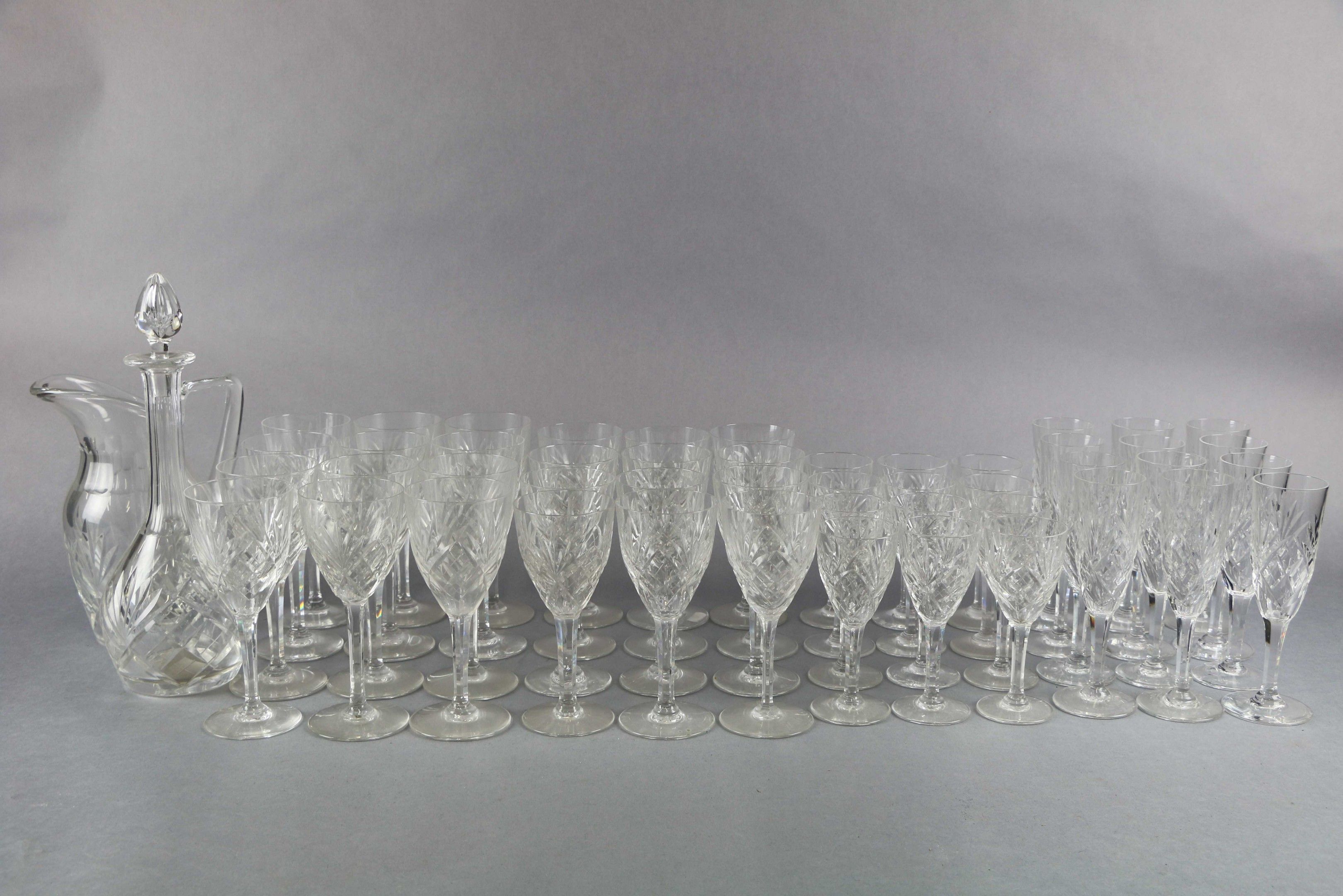 SAINT LOUIS: Chantilly cut crystal footed GLASS SET comprising twelve white wine glasses, twelve red wine glasses, twelve water glasses, twelve champagne flutes, a carafe and a jug.