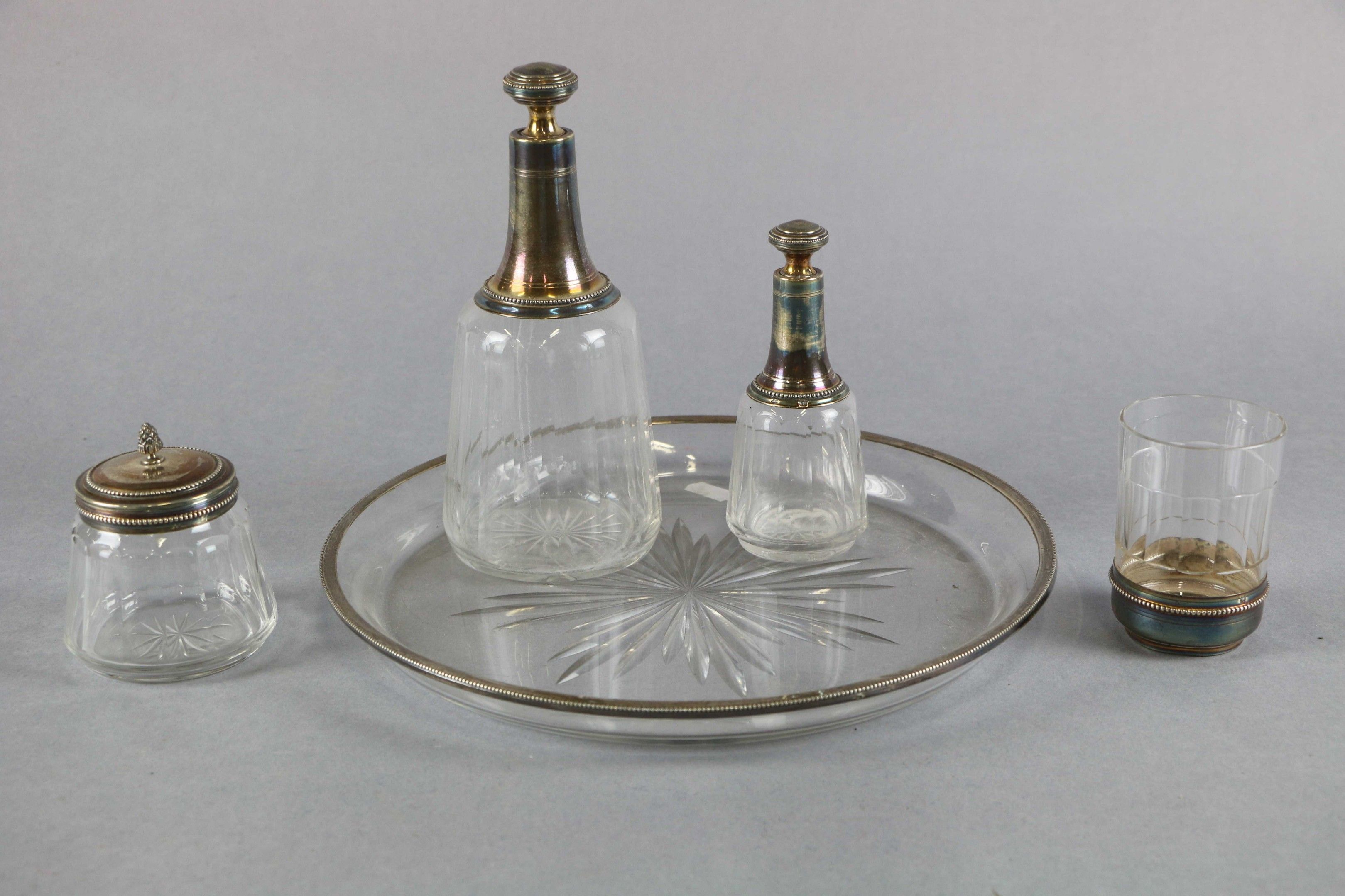 A cut-edge crystal "égoïste" service set in silver with a frieze of pearls, comprising a round dish, a glass, a box and two decanters.