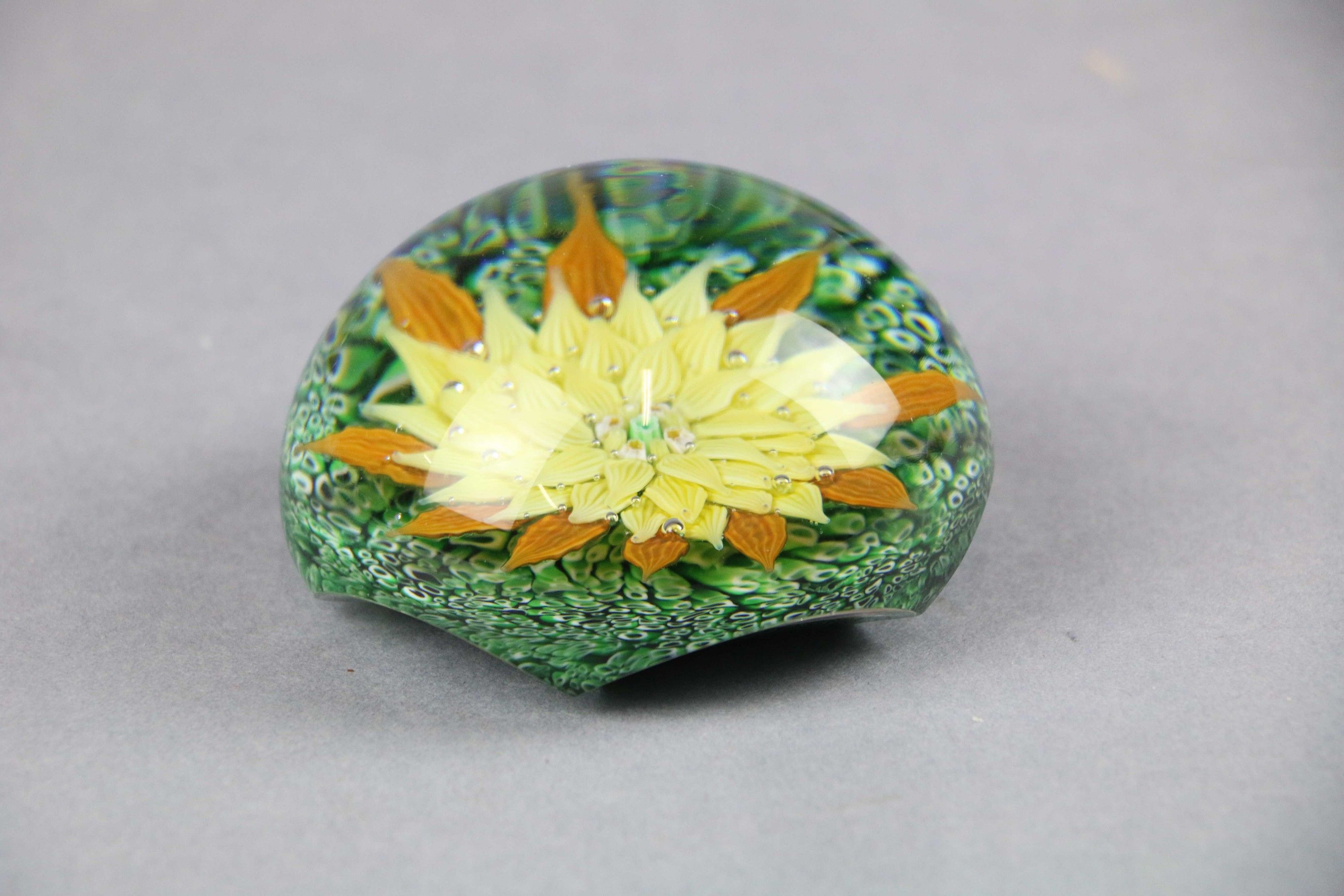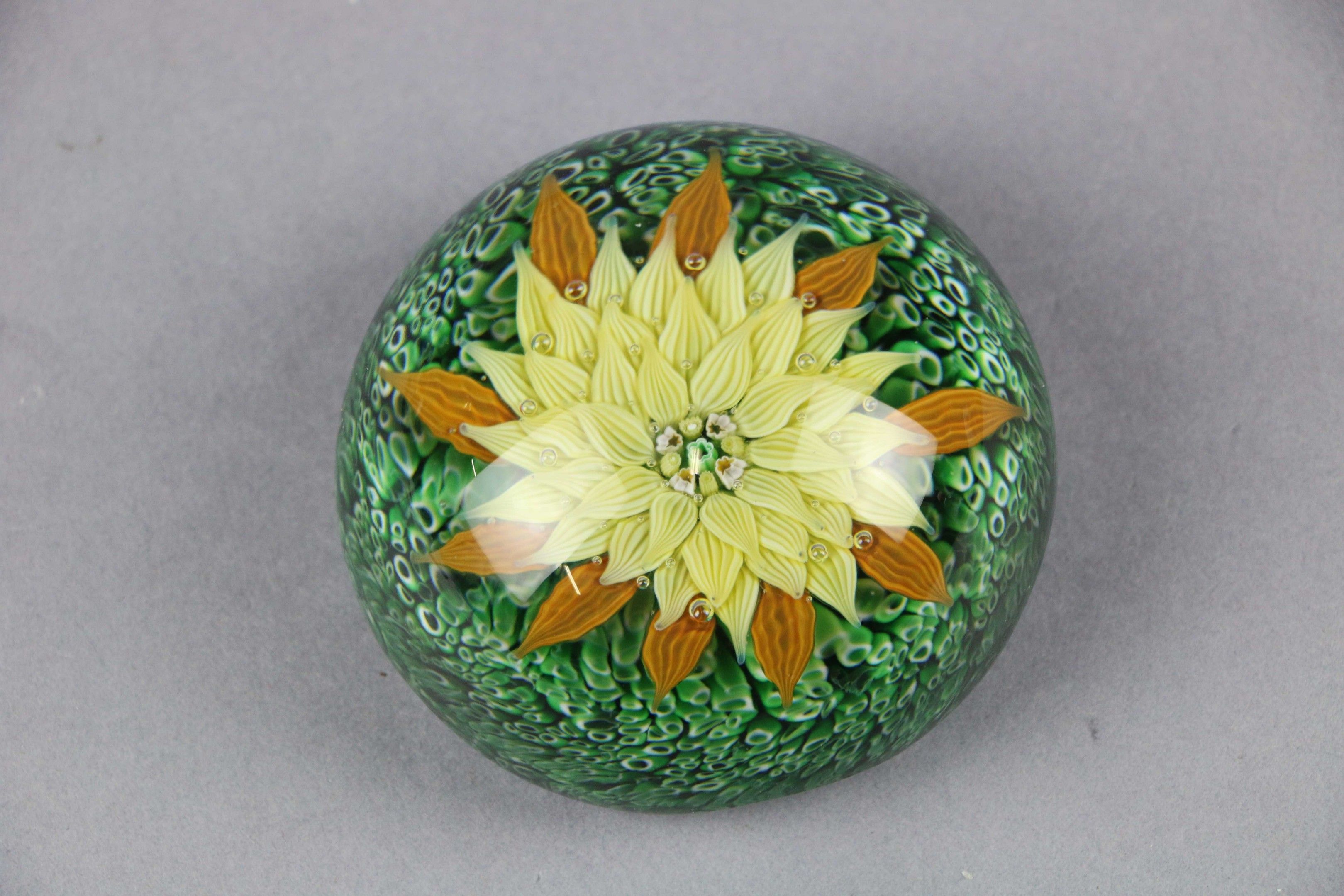 BACCARAT: Crystal PRESS-PAPER decorated with dalhia with striated pale yellow and orange yellow petals on a background of white and black green canes.
