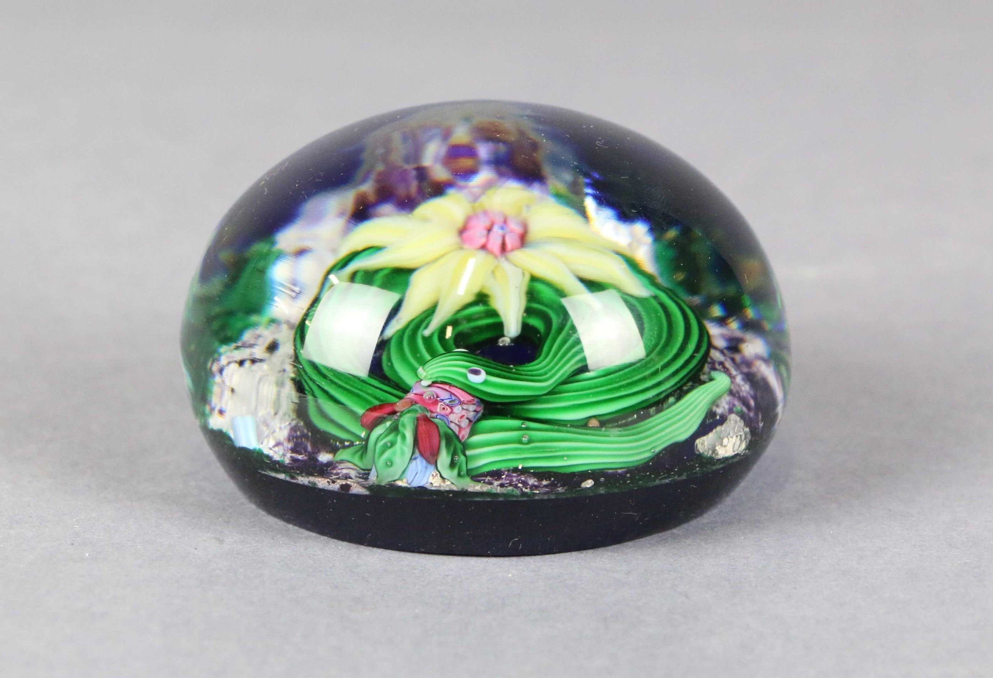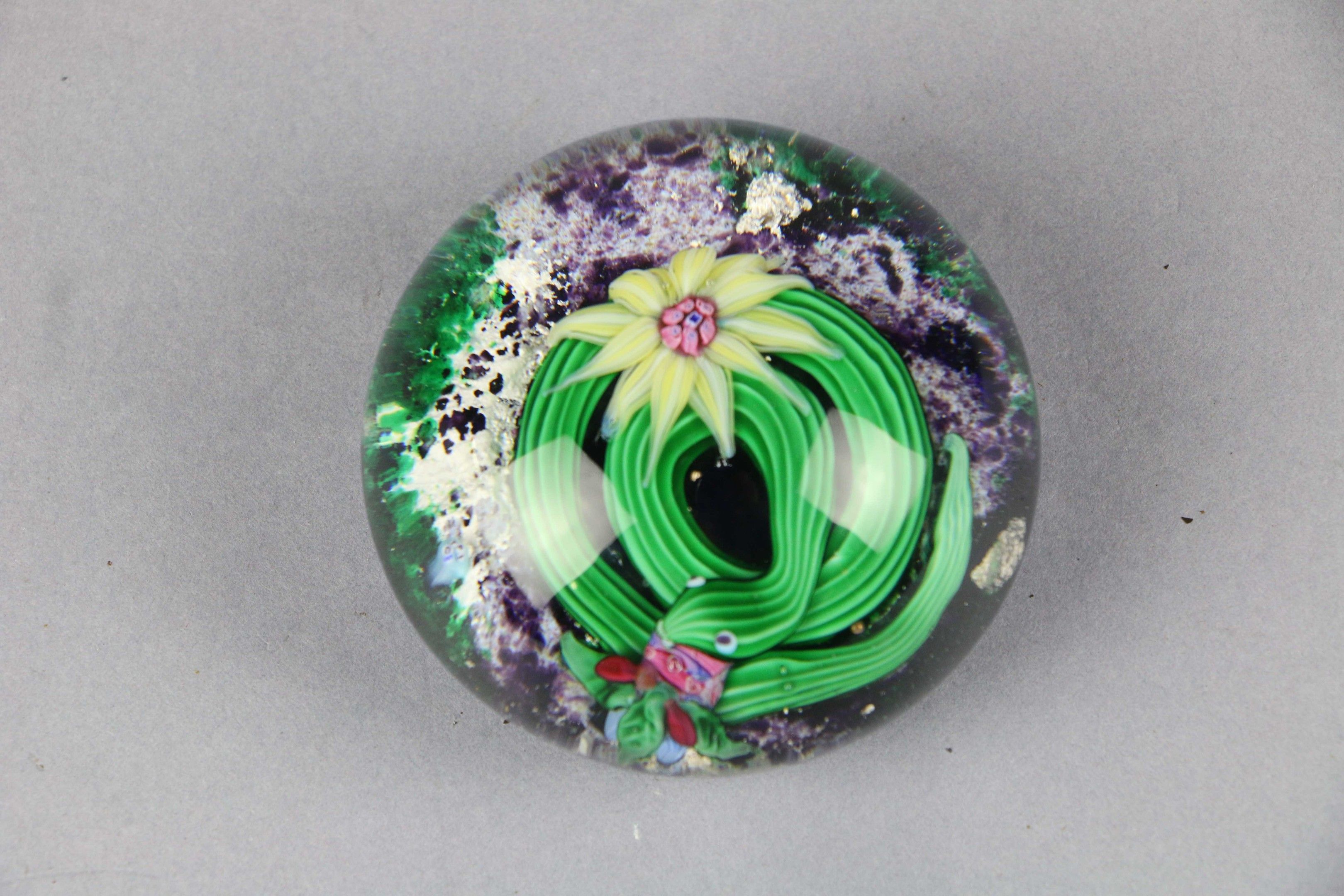 BACCARAT: Crystal PRESS decorated with a coiled green grooved snake, covered with a double clematis with yellow and white striated leaves. Background imitating white violet and silver-grey minerals. Smooth midnight blue reverse.