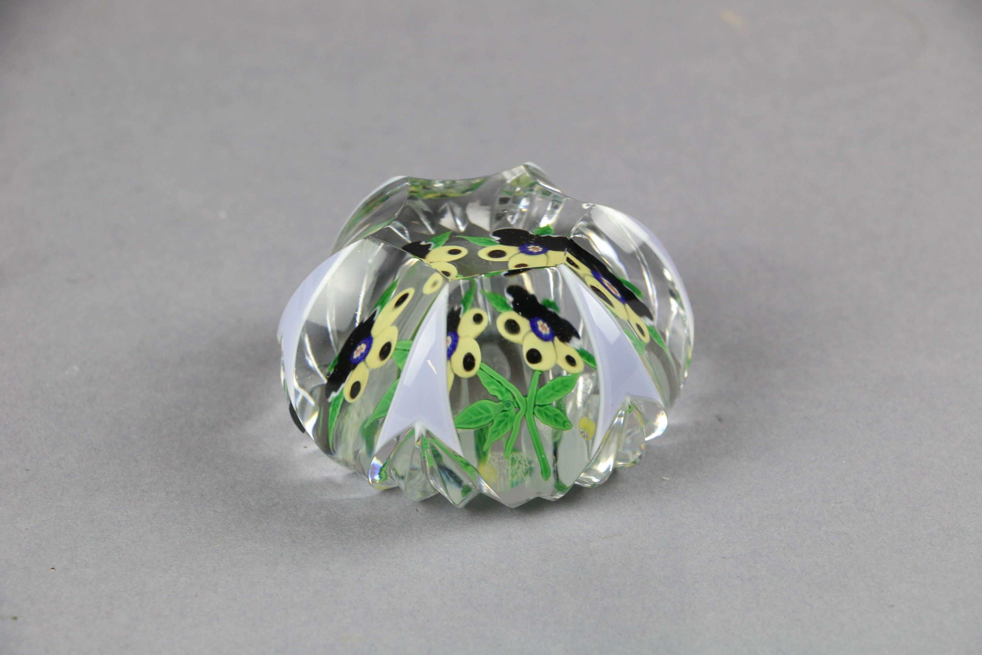 BACCARAT: PAPER PRESS in triplicate overlay of parma enamel on white enamel with internal decoration of two pansies with two black petals and three yellow petals with black dots on their leafy stems. Curved six-sided cut and upper window.