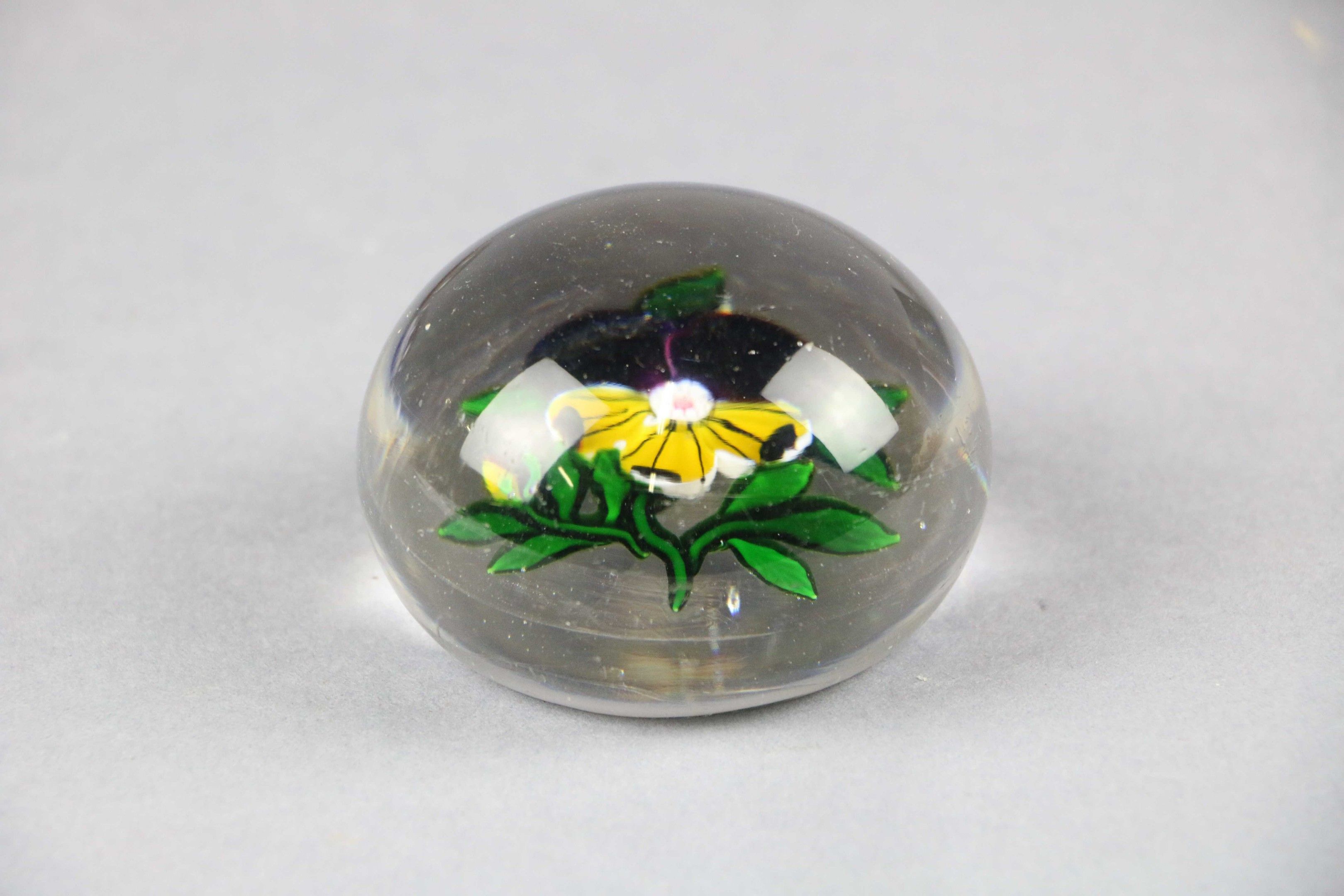 Attributed to BACCARAT: Crystal PRESS with pansy design with two dark purple petals and three bright yellow petals with three grooves each edged with a purple line. It stands on a green leafy stem from which a bud emerges. Transparent reverse with star motif.