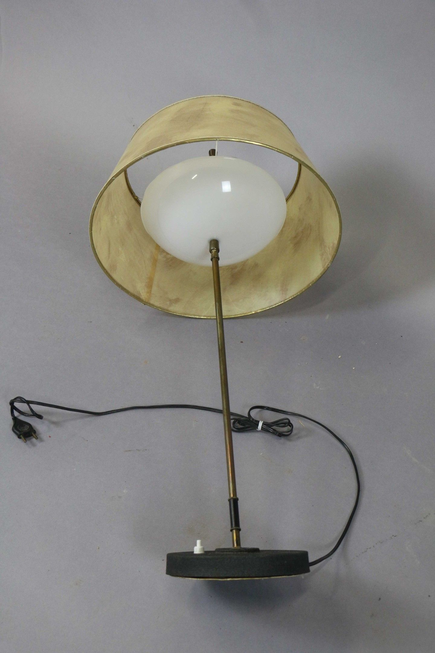 Desk LAMP with cast iron base and brass swivel stem with truncated cone-shaped shade and Plexiglas reflector.