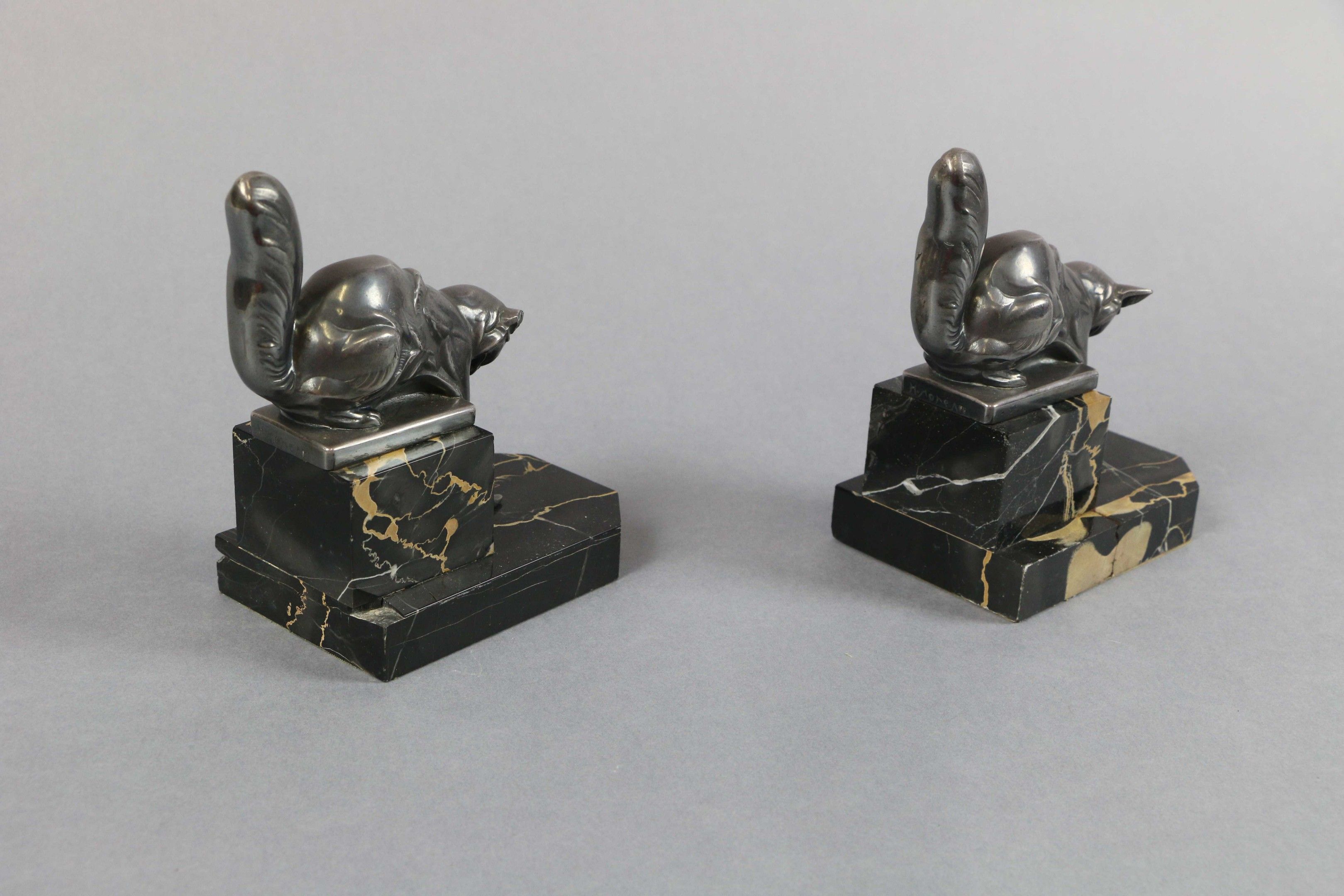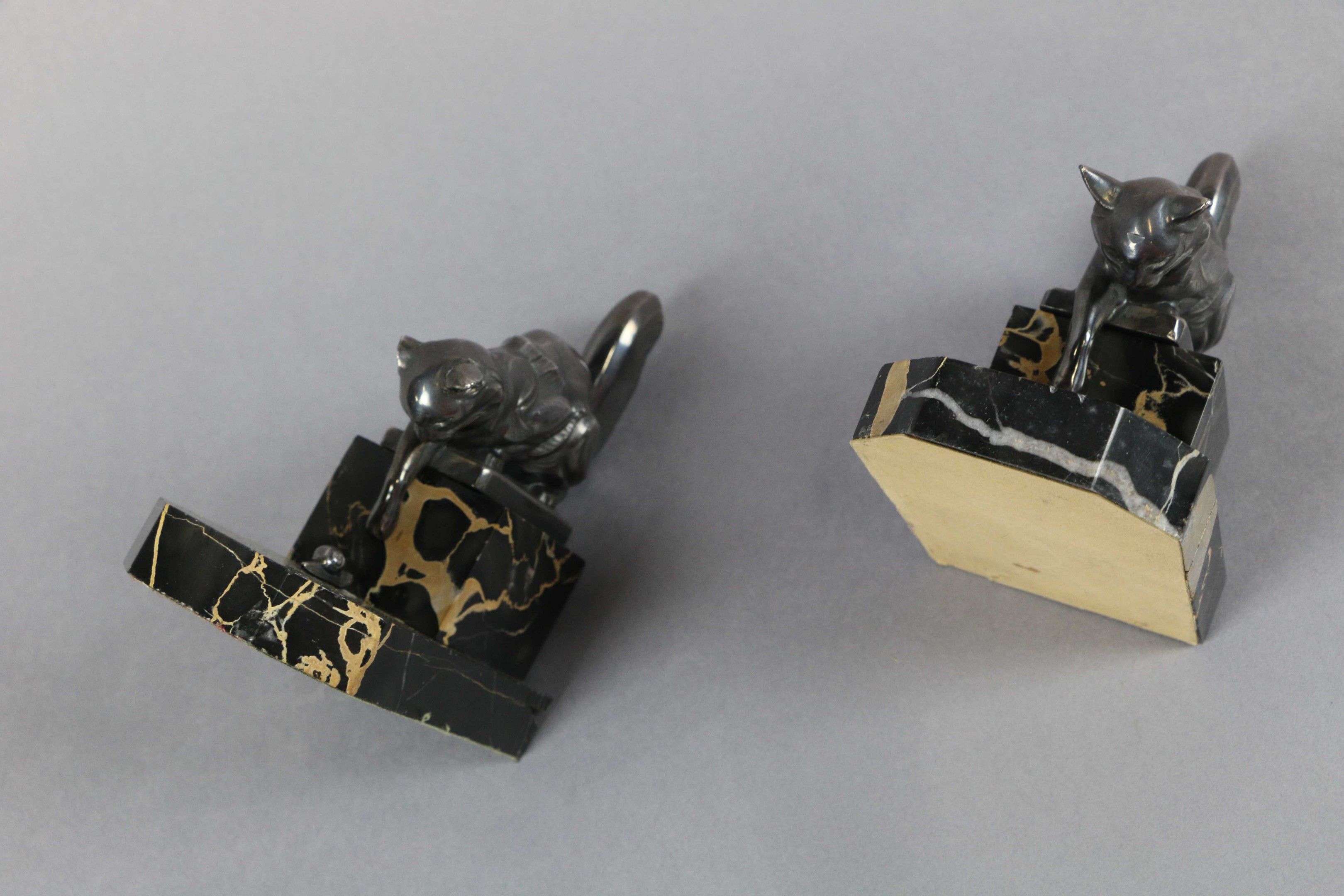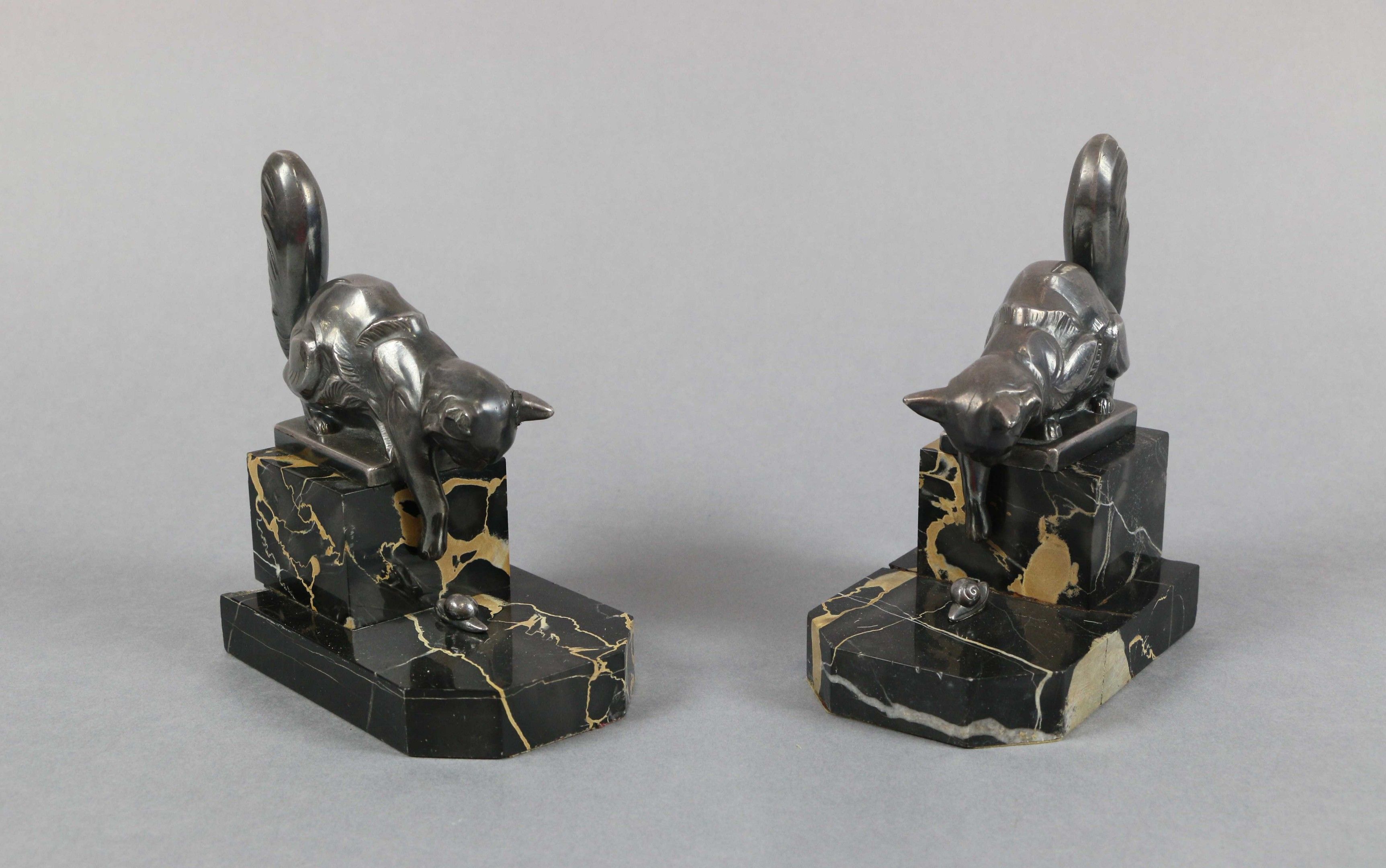 A pair of patinated regula bookends on a marble base depicting cats playing with snails.
